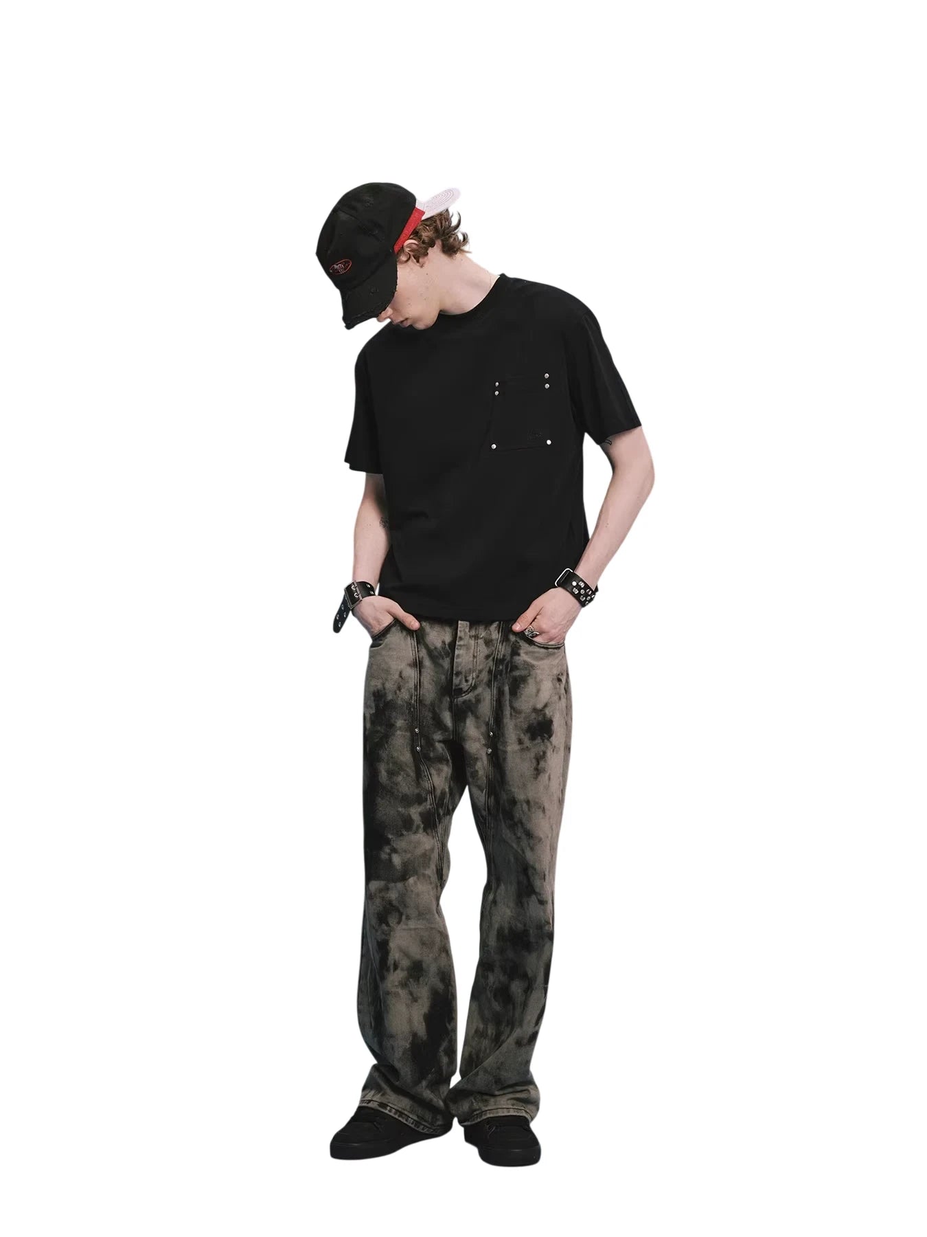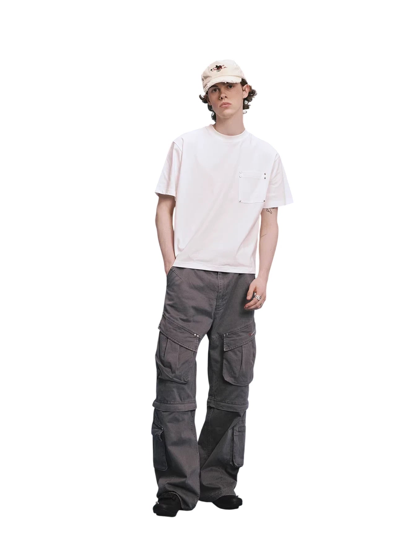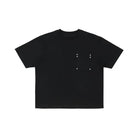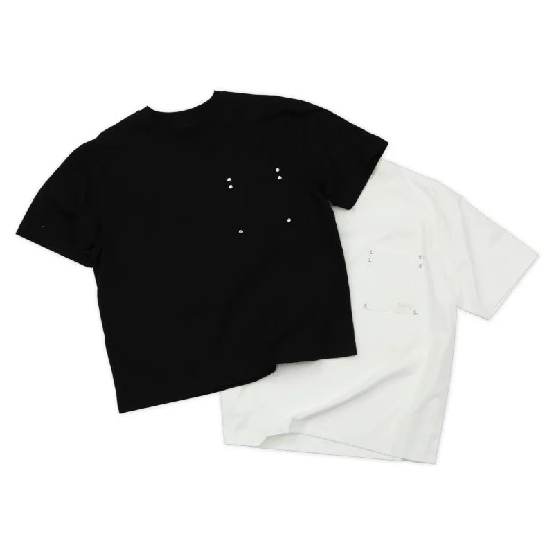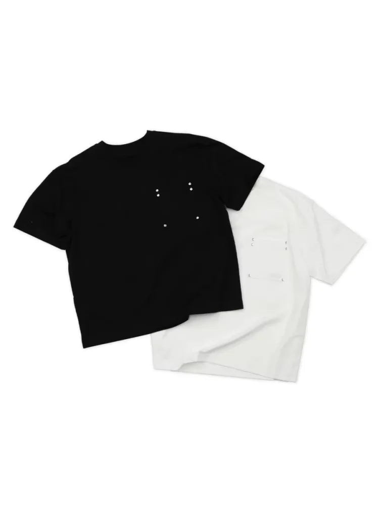 Upgrade your casual wardrobe with this versatile unisex short sleeve T-shirt, available in classic black and white. Designed with a crew neckline and a minimalist silhouette, the shirt features subtle detailing in the form of symmetrical metal studs on the chest pocket area, adding a modern and stylish edge.