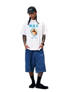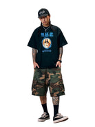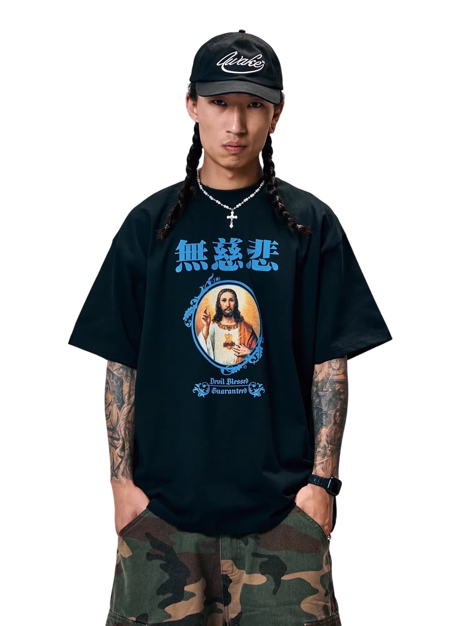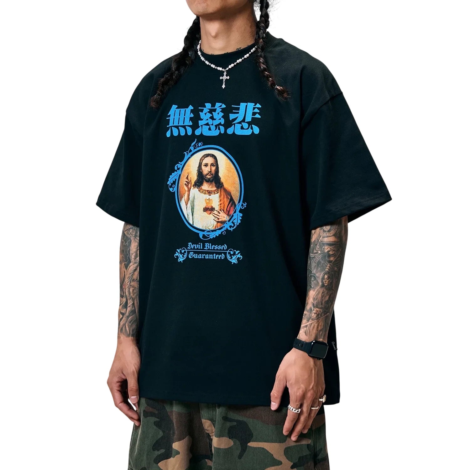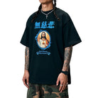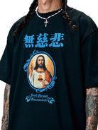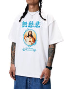 This men's short sleeve oversized t-shirt features a heavyweight 300g pure cotton construction, ideal for spring and summer wear. The front showcases a vibrant graphic of Jesus Christ framed in blue with stylized blue Asian characters above and gothic text reading “Devil Blessed Guaranteed” below. Designed for a bold streetwear look, this T-shirt combines comfort with expressive, creative style.