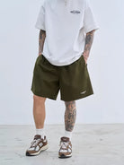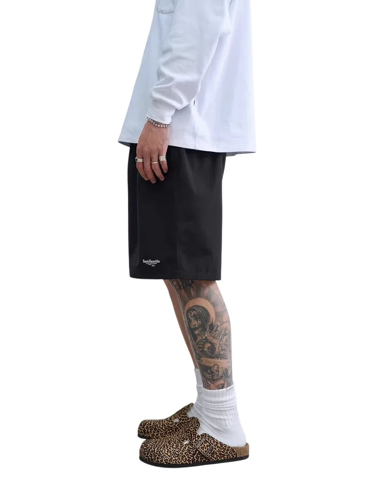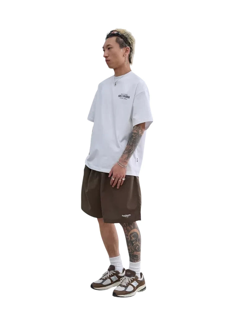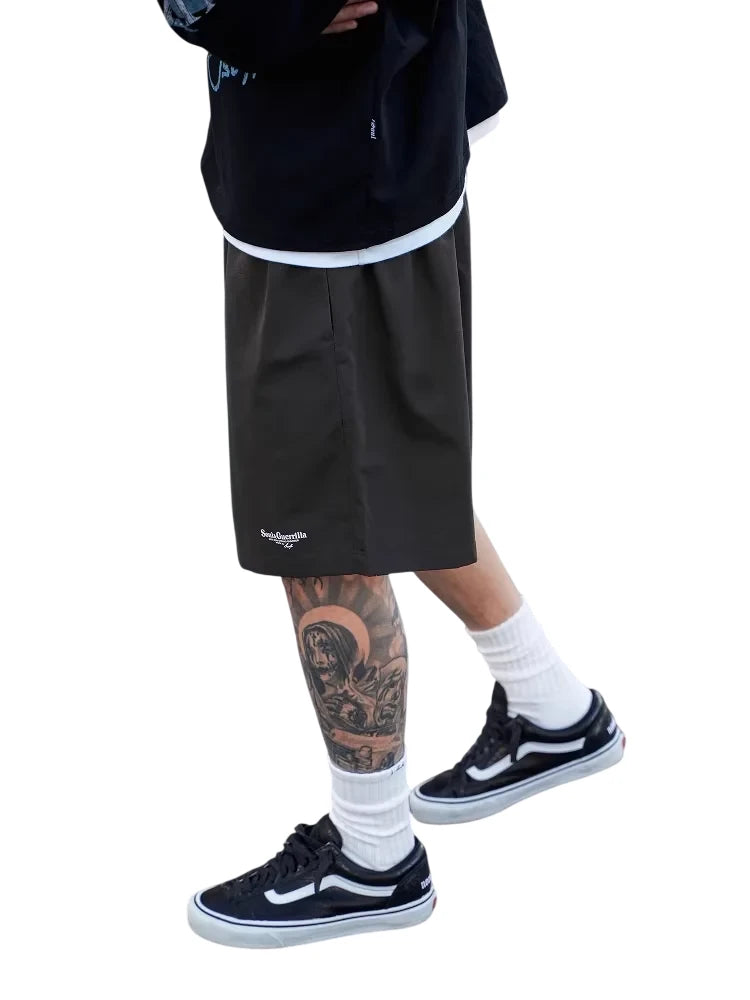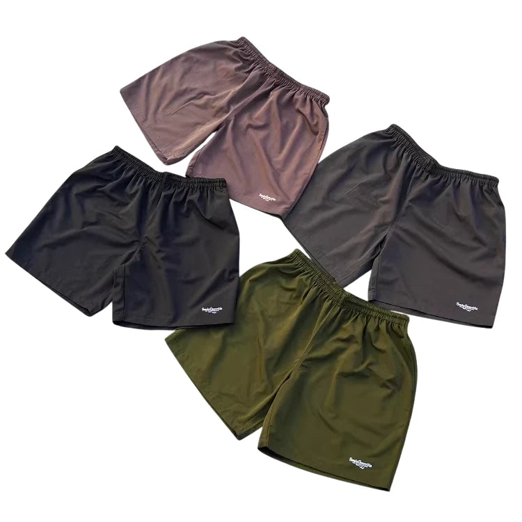 These men's lightweight outdoor shorts are crafted from a quick-drying nylon material, ideal for sports, commuting, and casual outings. Designed with a loose fit and a five-inch inseam, they offer comfort and freedom of movement. The shorts feature an elastic waistband for a secure fit and come in four versatile solid colors: brown, dark grey, black, and olive green. A subtle logo on the lower leg adds a sporty touch, making these shorts a functional and stylish choice for everyday wear. Perfect for warm-weather activities or travel.