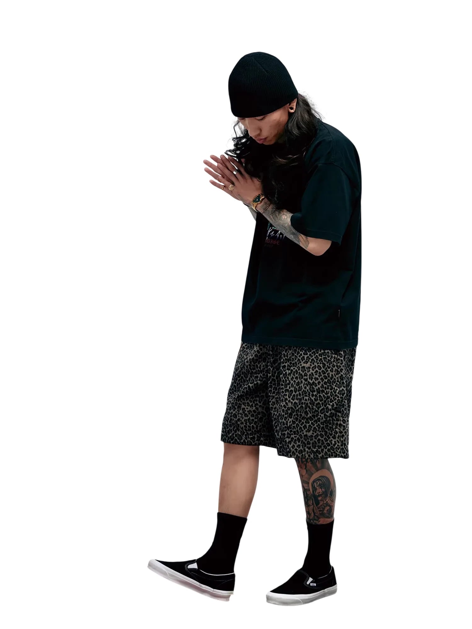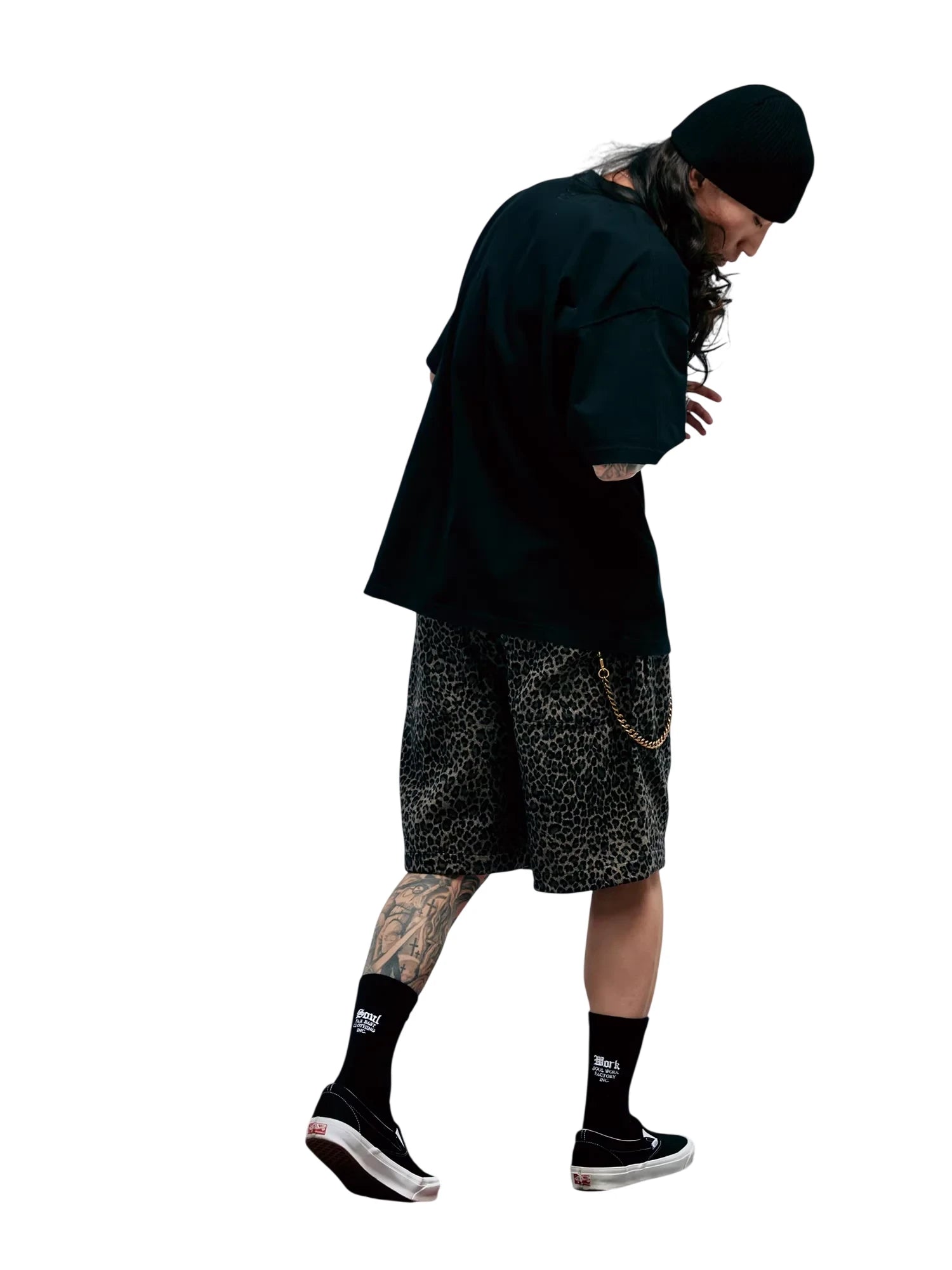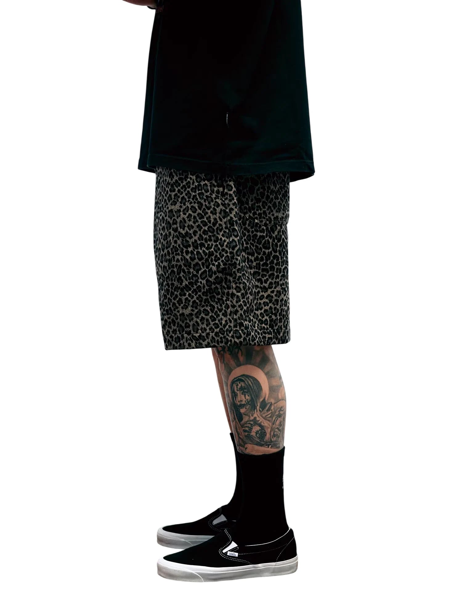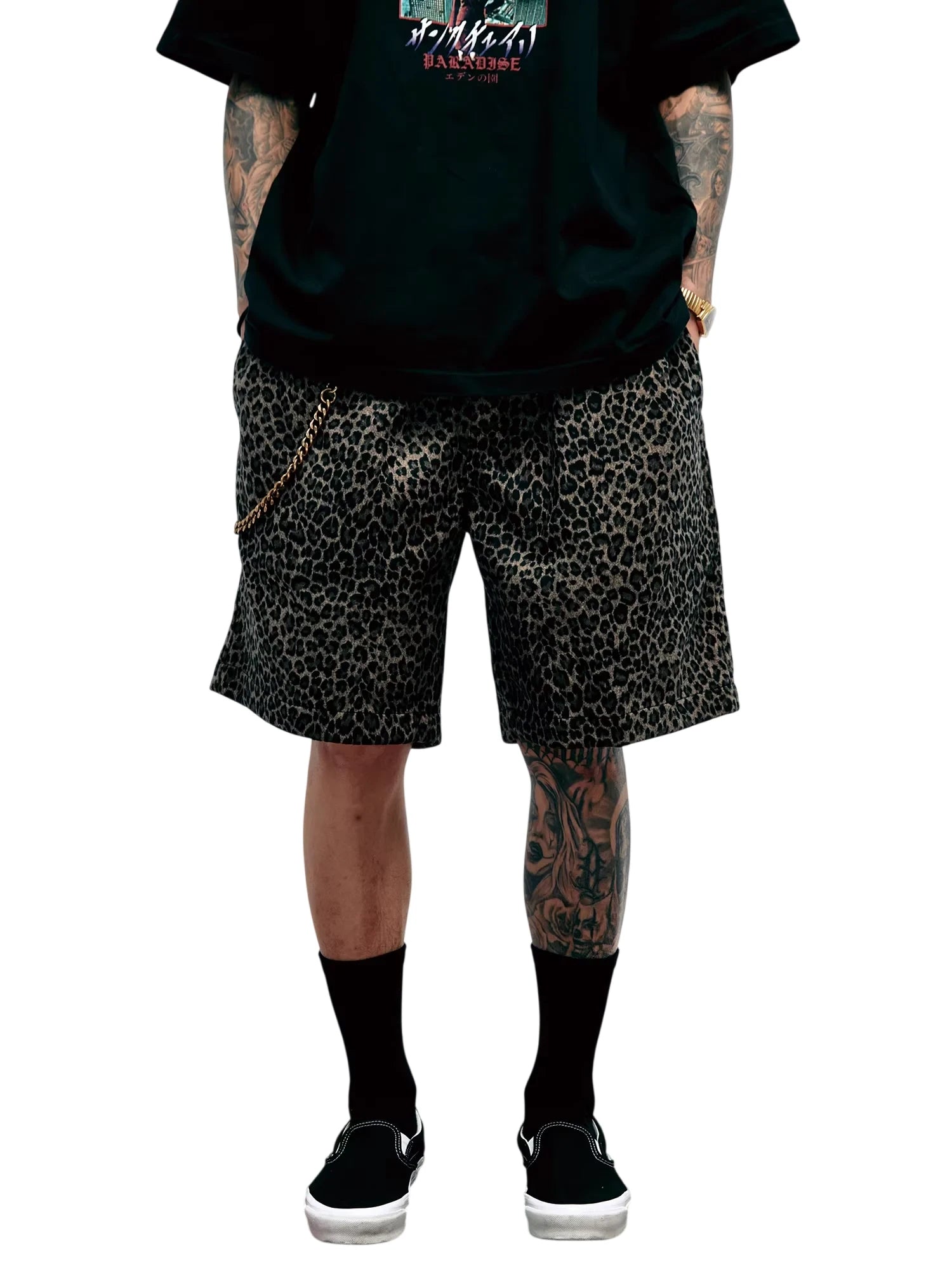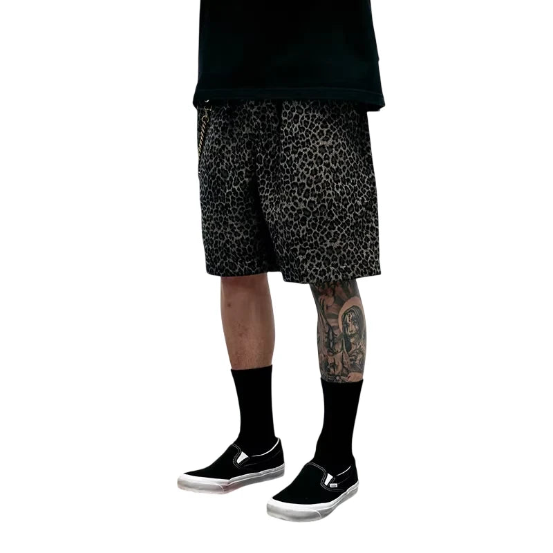 Stylish and comfortable, these men's knee-length shorts feature a bold all-over leopard print in muted black and brown tones. Designed with a relaxed fit, they combine streetwear flair with everyday wearability. Perfect for casual outings or sports activities, these shorts offer both fashion and function with their soft Japanese velvet-inspired texture.