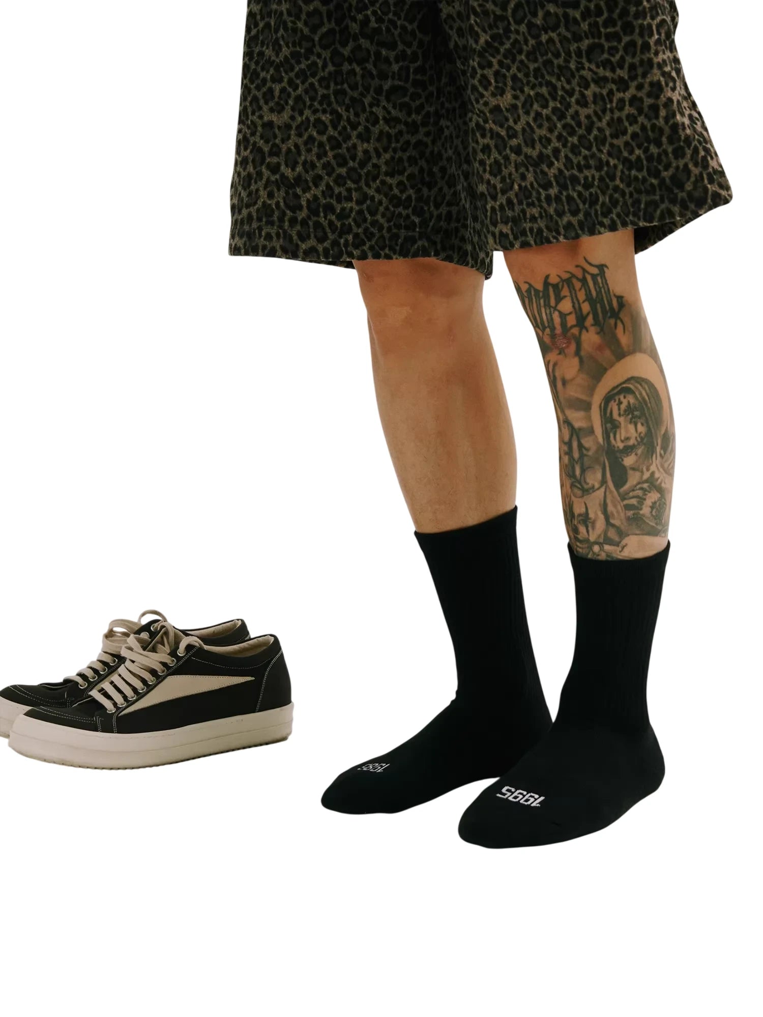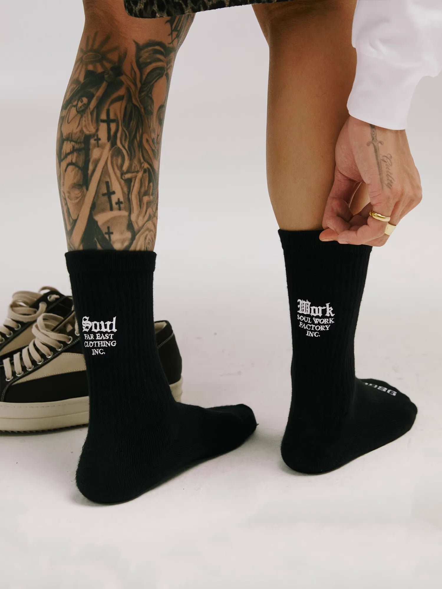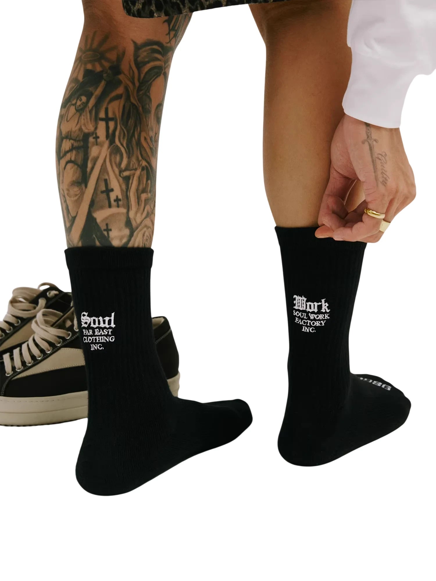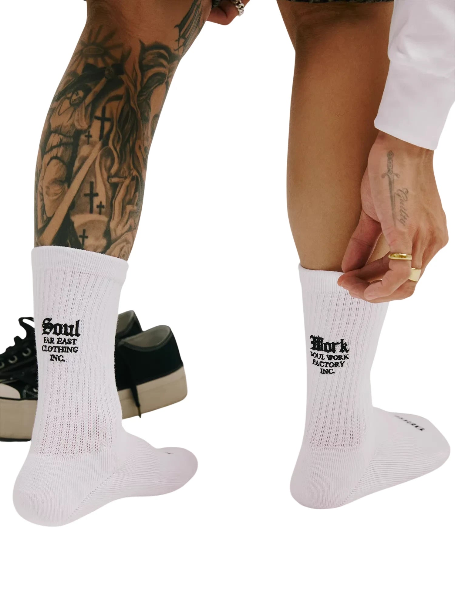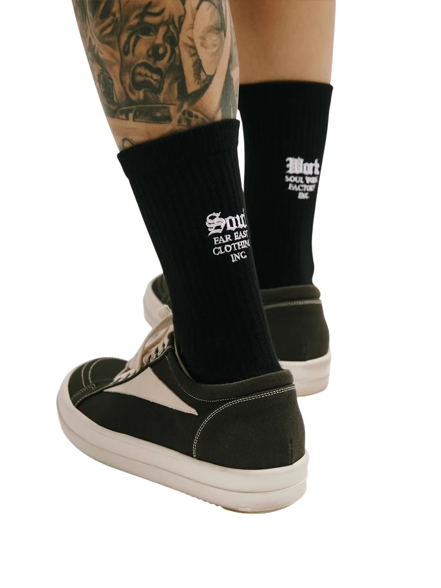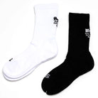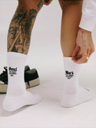 Step up your everyday comfort with these unisex mid-calf socks, crafted from breathable, sweat-absorbing cotton. Designed with ribbed fabric for a secure fit, they feature bold, gothic-style embroidered text at the back for a unique streetwear edge. Modeled on a male model, these socks combine functionality with style, making them a versatile addition to any casual wardrobe.
