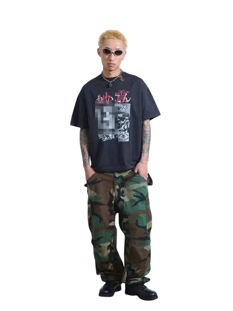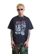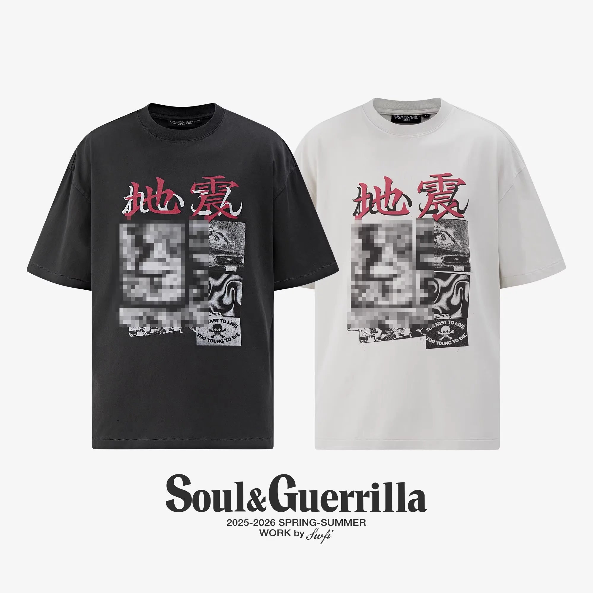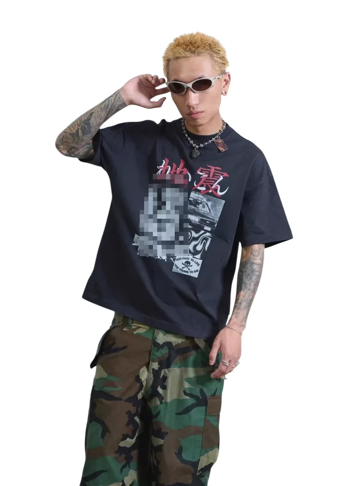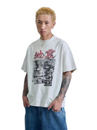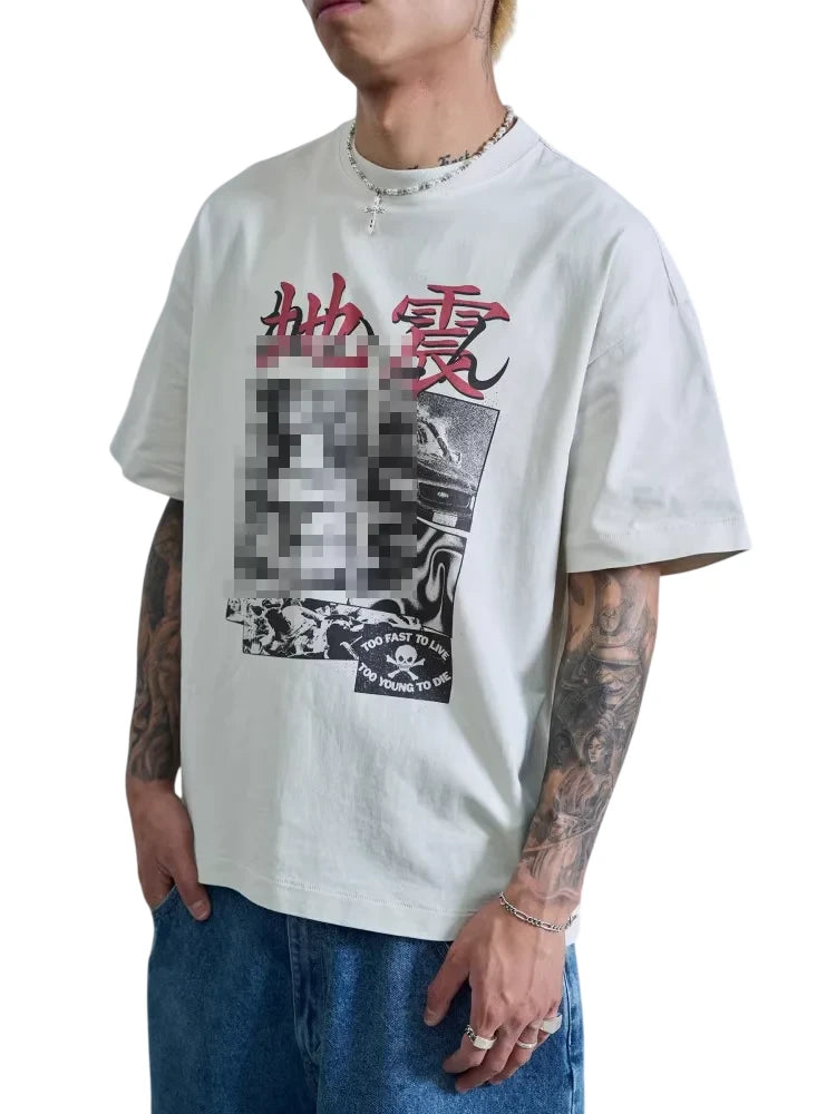 Unisex short-sleeve t-shirt featuring a vintage-inspired, distressed graphic print from the 2025–2026 Spring-Summer collection. Made from pure cotton and enzyme-washed for a soft feel, the design includes bold red Japanese text over a black and white collage-style motif with the phrase 'Too fast to live / too young to die.' Cut in a boxy, oversized silhouette with a ribbed crew neckline for a relaxed look.