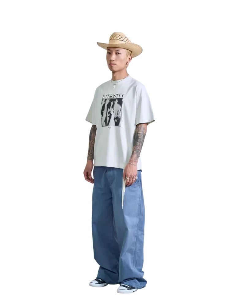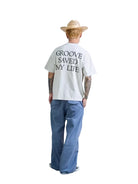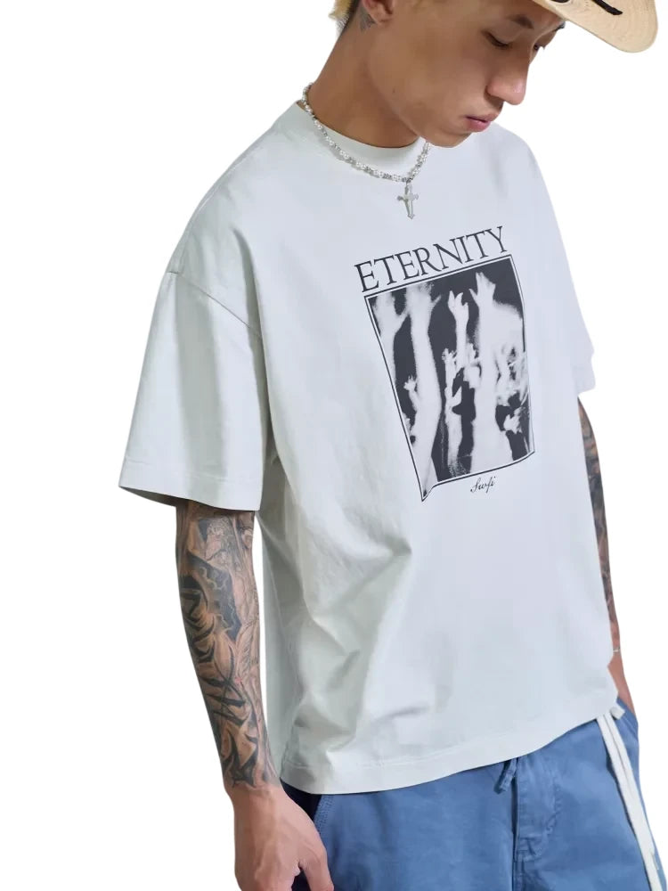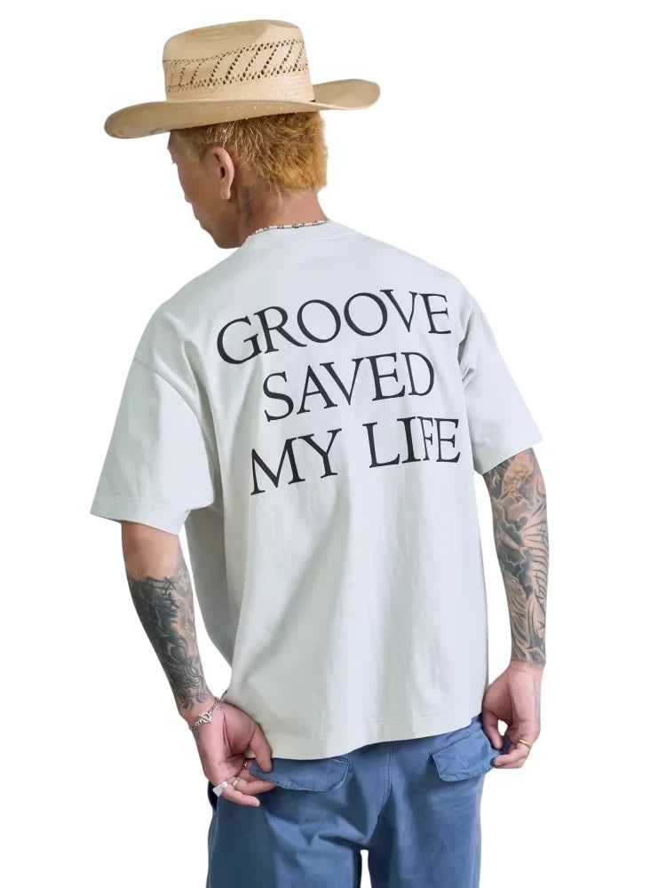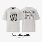 This unisex oversized short sleeve T-shirt offers a relaxed, boxy fit crafted from pure cotton with vintage-inspired enzyme washing and single-stitch detailing. The front features a powerful black-and-white photo slogan print of raised hands framed by the word 'ETERNITY' and a subtle artist signature. The back makes a bold statement with the phrase 'GROOVE SAVED MY LIFE' in prominent uppercase lettering. A versatile piece from the 2025-2026 Spring-Summer collection, this shirt combines artistic expression with casual comfort.