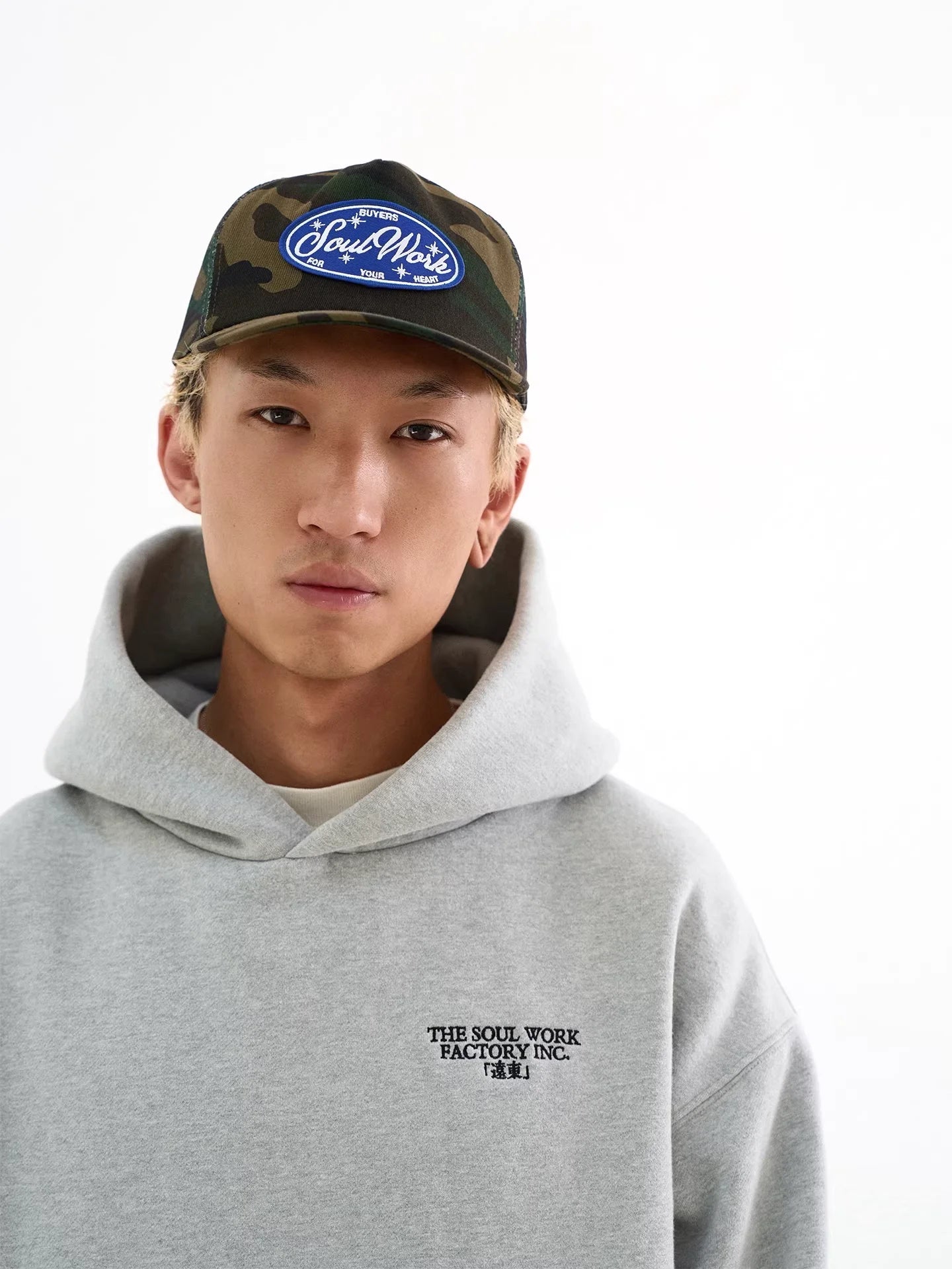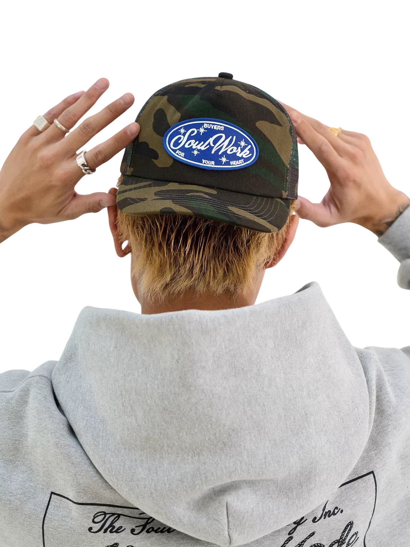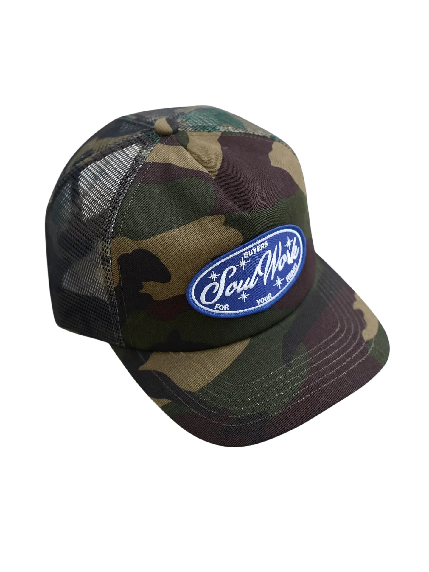 This unisex trucker hat features a bold camouflage pattern on the front and brim, blending tones of green, brown, and black. The structured front panel supports an oval blue and white embroidered patch that reads 'BUYERS Soul Work FOR YOUR HEART,' accented with starburst detailing. The back of the cap is made of breathable green mesh, offering comfort and ventilation. A curved brim adds classic styling, while the snapback closure ensures an adjustable fit for various head sizes.