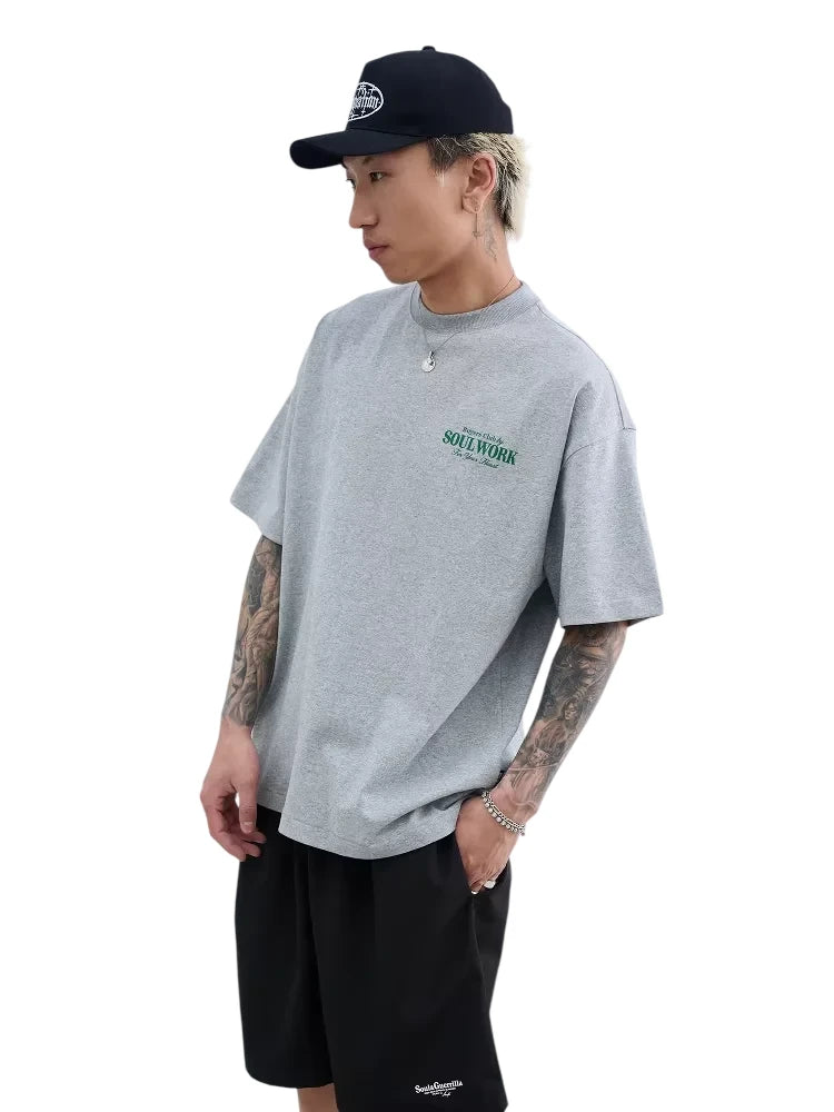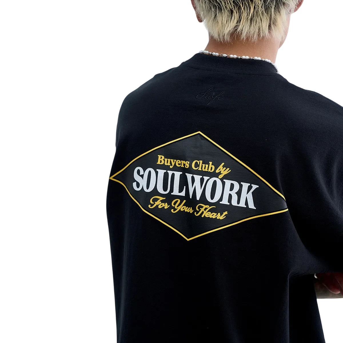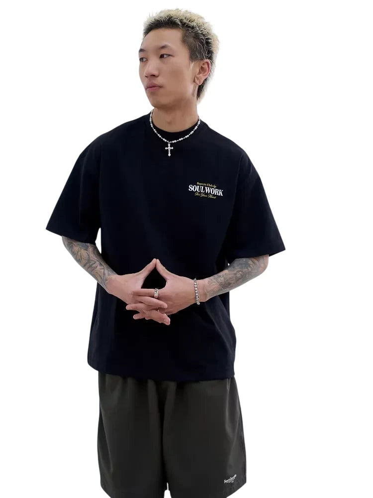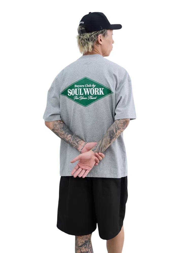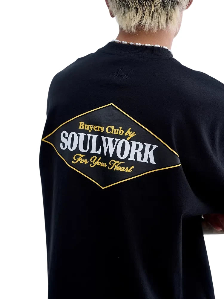 Elevate your casual wardrobe with this heavyweight cotton T-shirt, designed with a relaxed, loose fit for all-day comfort. Featuring a bold vintage-style logo on the back, the graphic includes a distinctive diamond-shaped emblem with the phrase 'Buyers Club by SOULWORK For Your Heart' in contrasting yellow and white lettering. The ribbed crew neckline and short sleeves make this shirt a versatile basic. Suitable for men looking for a stylish yet laid-back outfit staple.