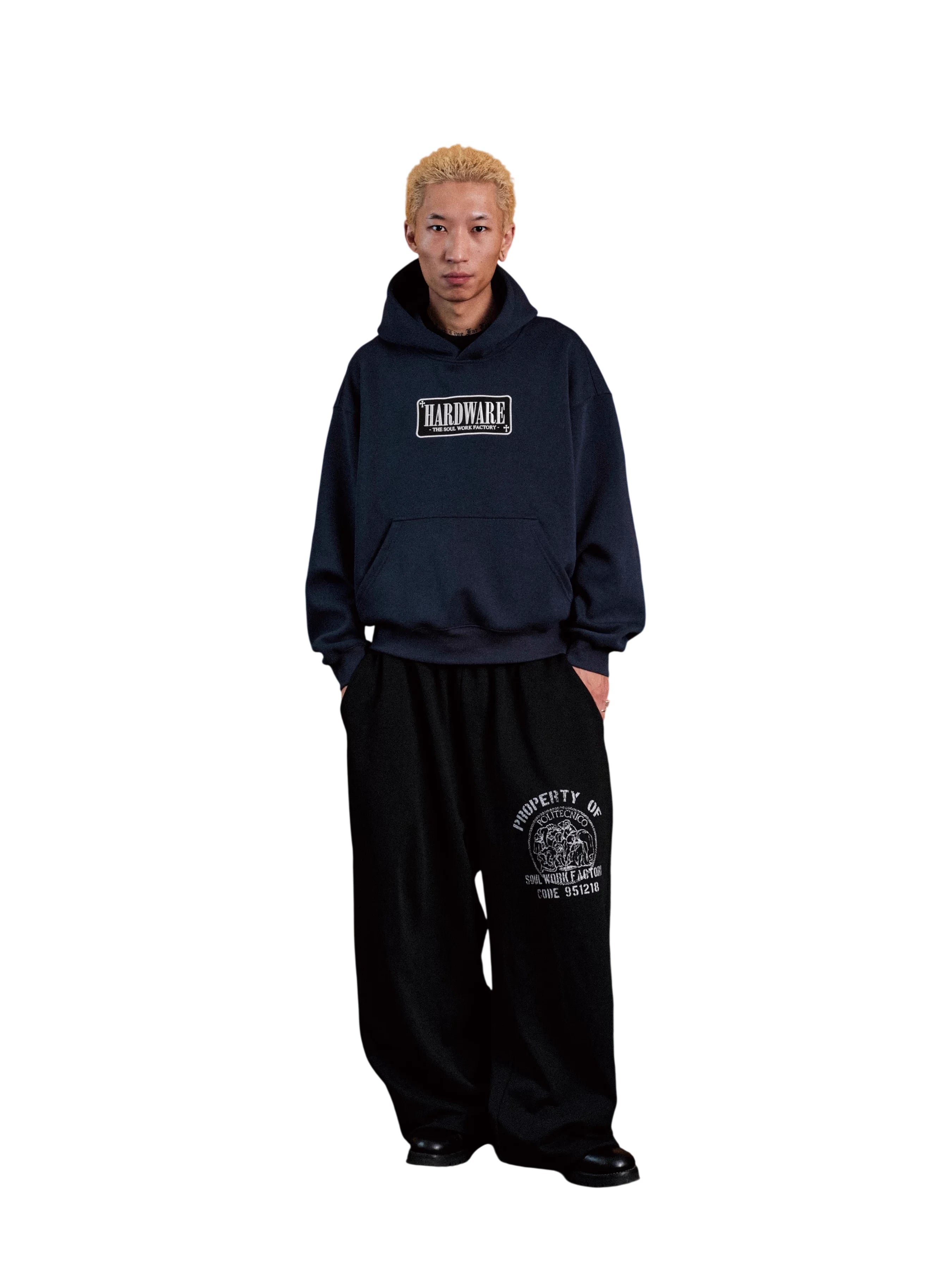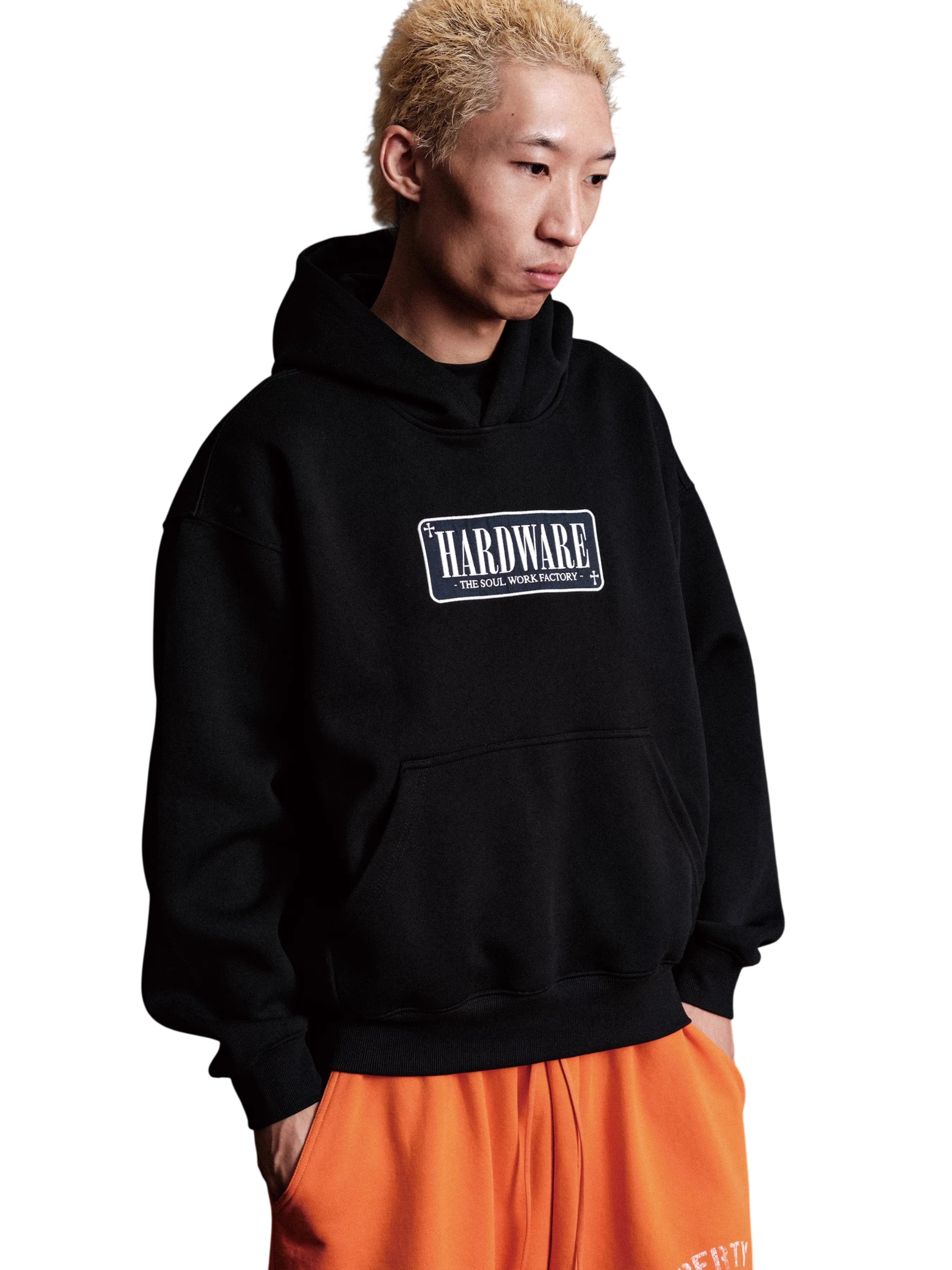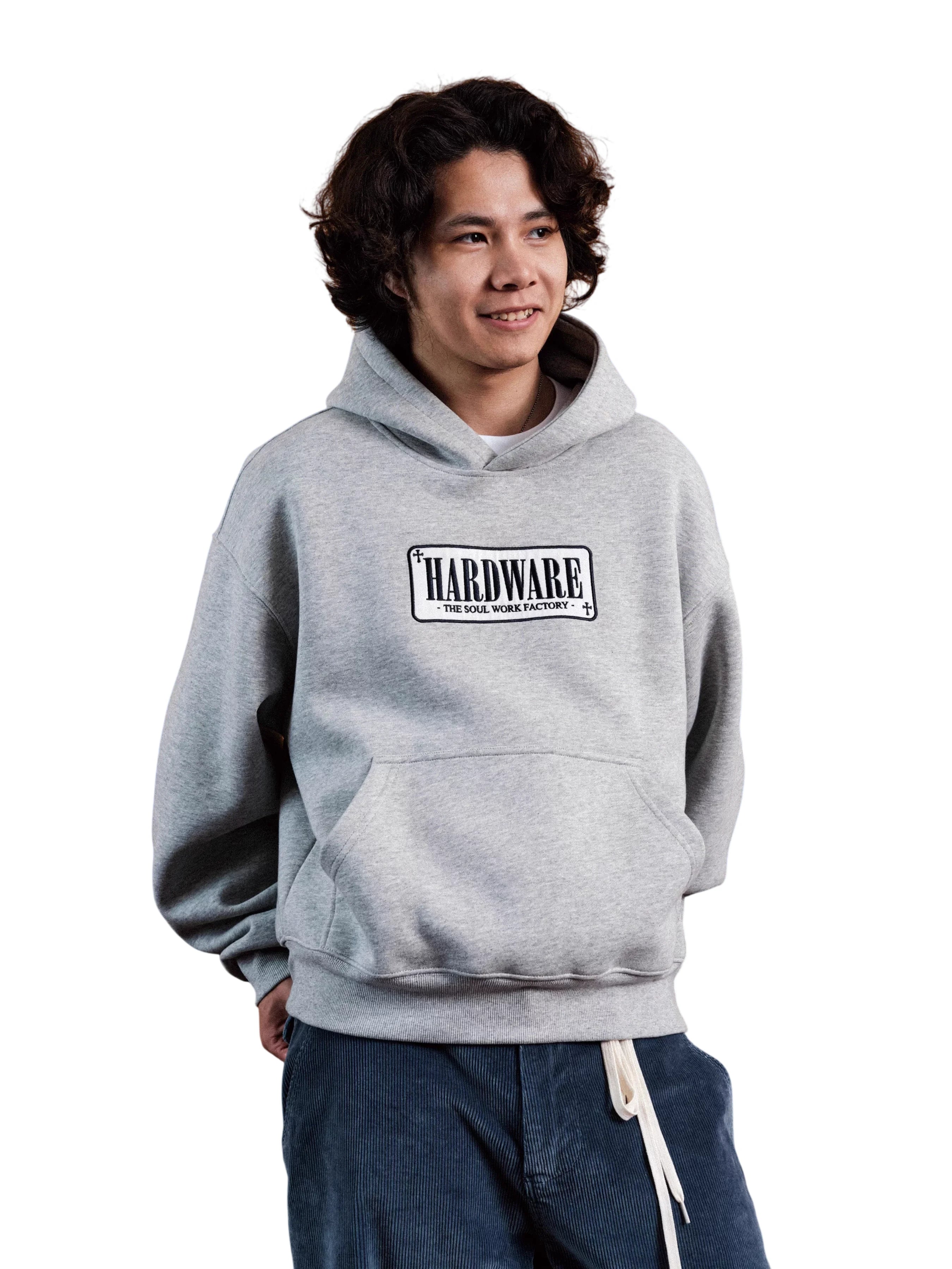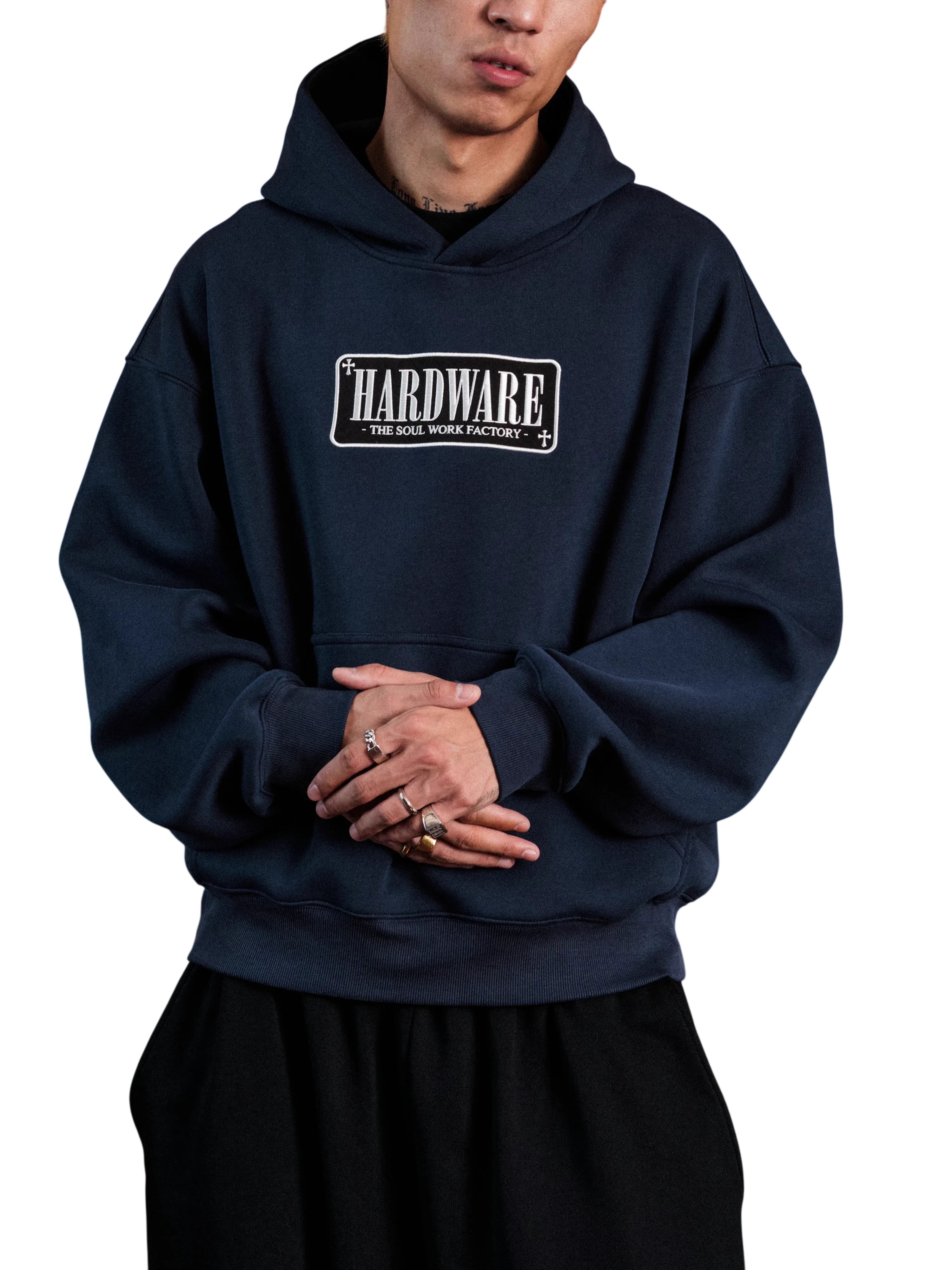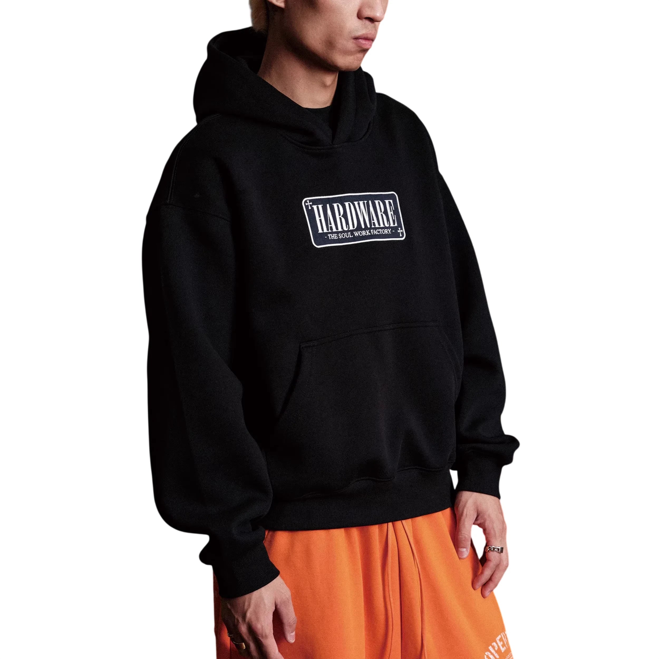 This men's heavyweight hooded sweatshirt features a thickened, high-density fabric construction designed for ultimate warmth and durability. The oversized, boxy silhouette offers a wide, relaxed fit with a classic drawstring hood and front kangaroo pocket. A bold embroidered text graphic reading 'HARDWARE - THE SOUL POWER ENERGY' highlights the chest, delivering a modern streetwear aesthetic. Ideal for everyday wear or casual layering.