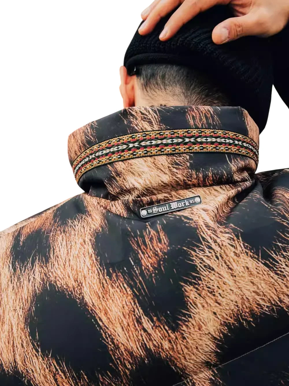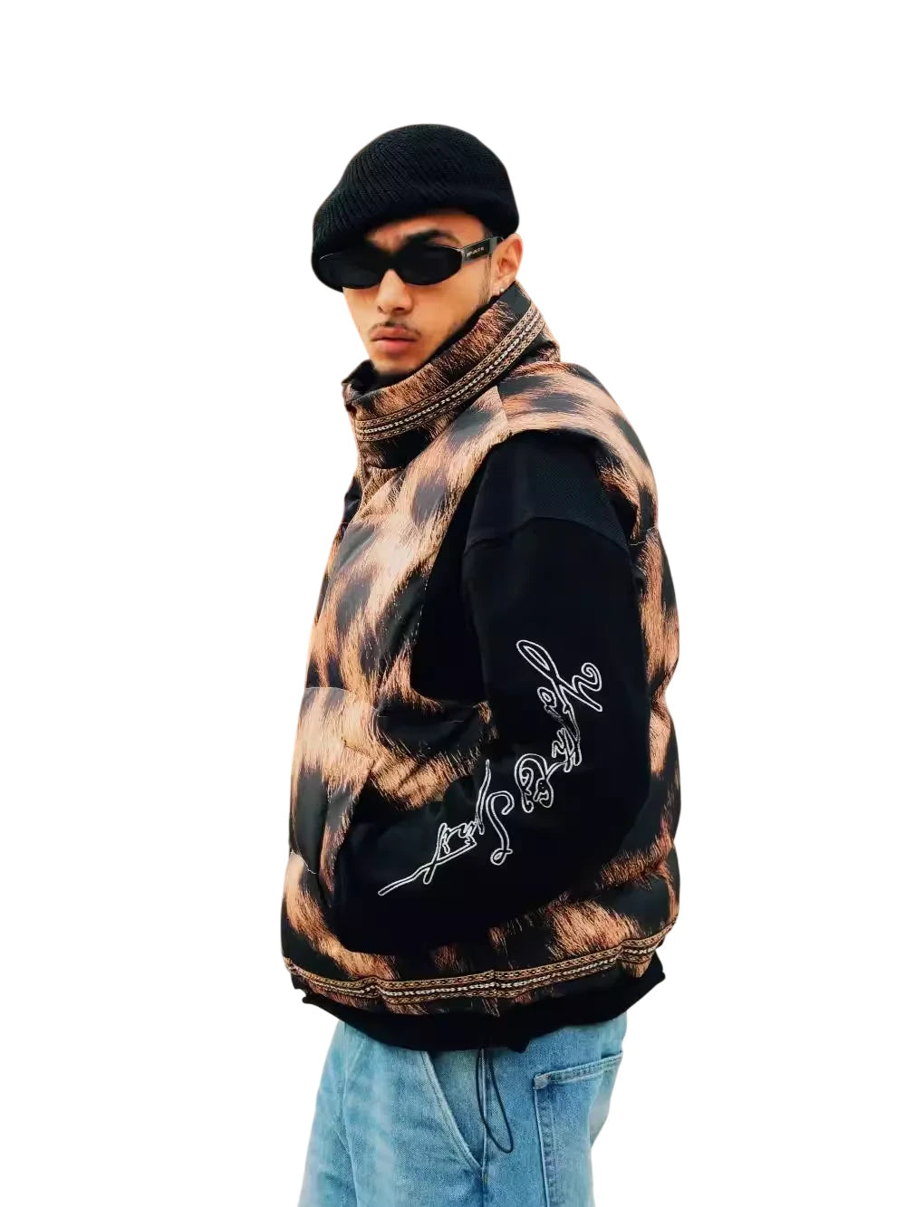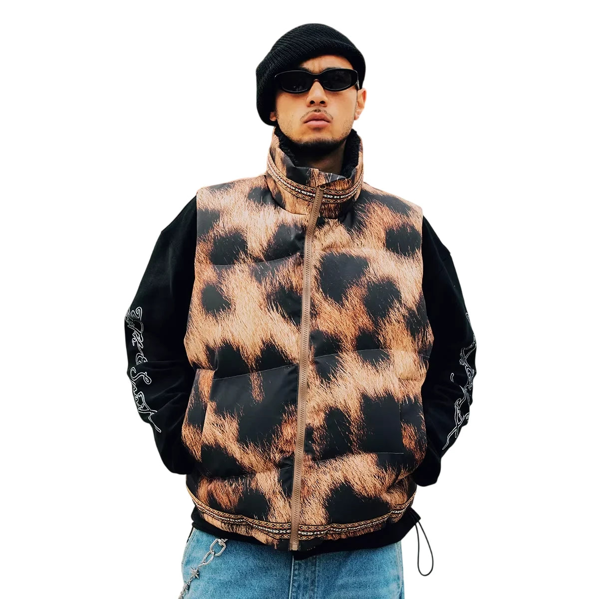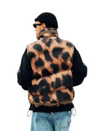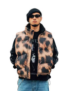 Add a bold touch to your outerwear with this men's leopard print quilted fleece vest. Featuring an eye-catching animal pattern in shades of brown and black, this padded vest includes a high stand collar and front zipper closure for both warmth and style. Perfect for layering over casual looks, it's designed to make a statement while offering comfort and functionality.