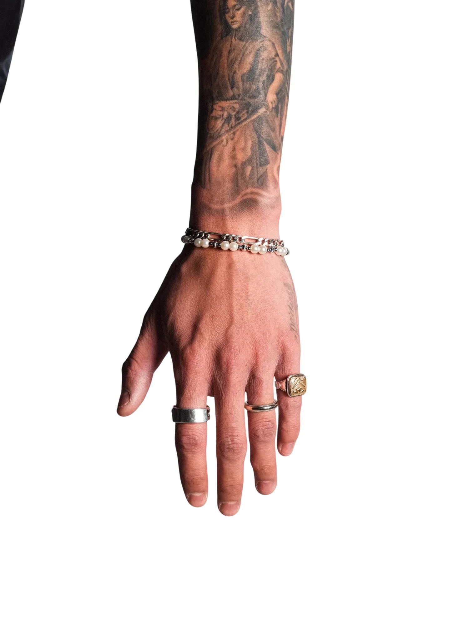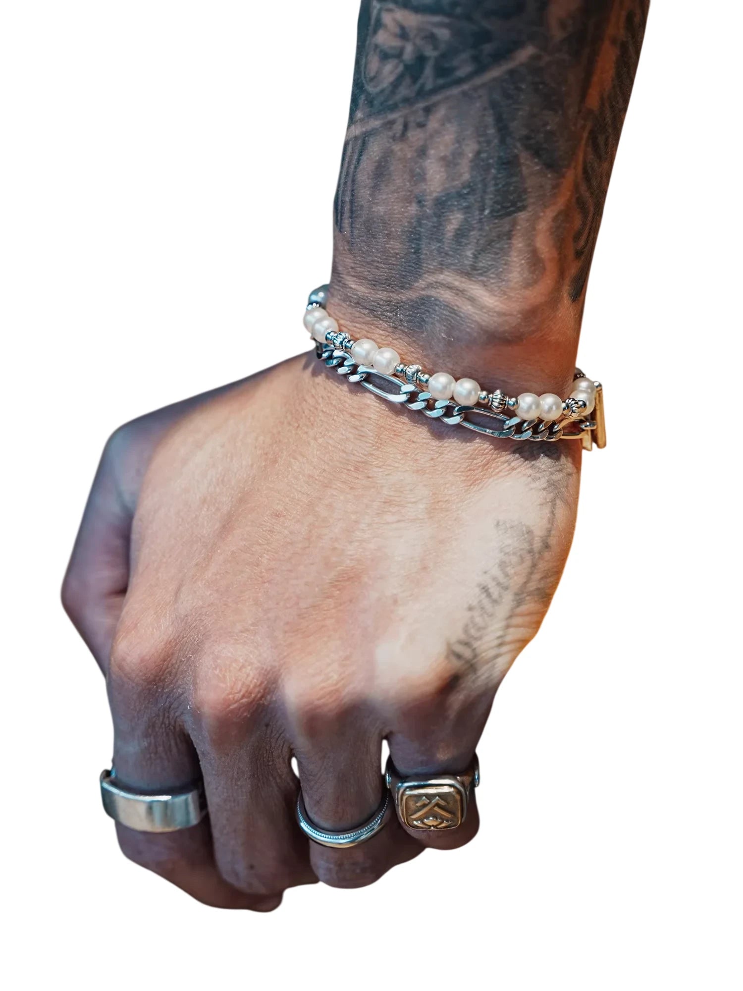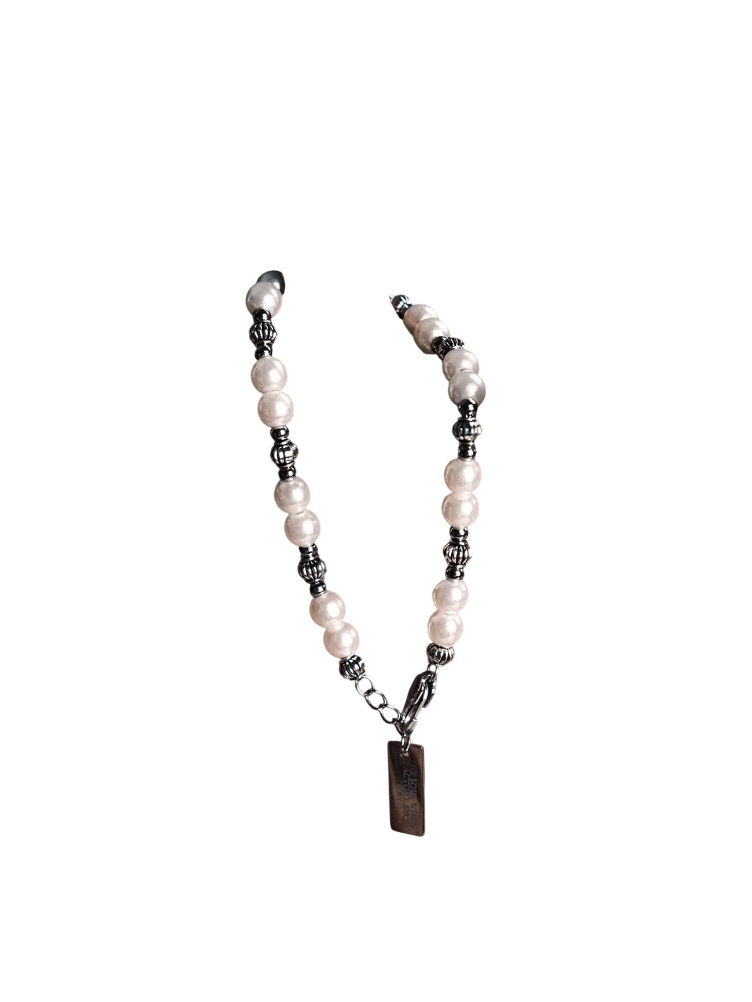 This unisex bracelet combines elegant white pearls with modern metallic chain links for a bold, layered accessory. Designed with a unique spliced style, it adds a personalized and edgy touch to any outfit. Ideal for those who appreciate contemporary fashion with a niche aesthetic, this versatile piece complements both casual and statement looks.