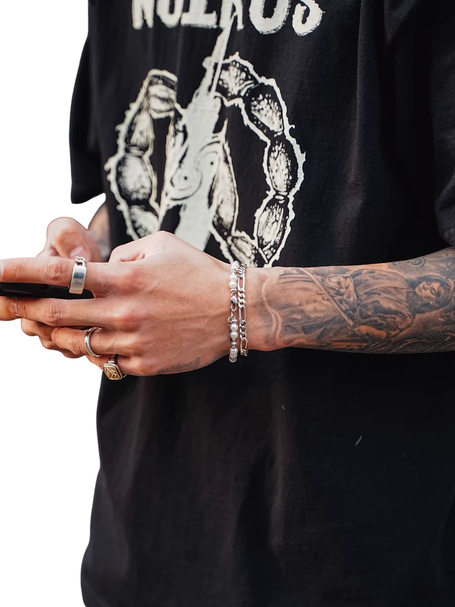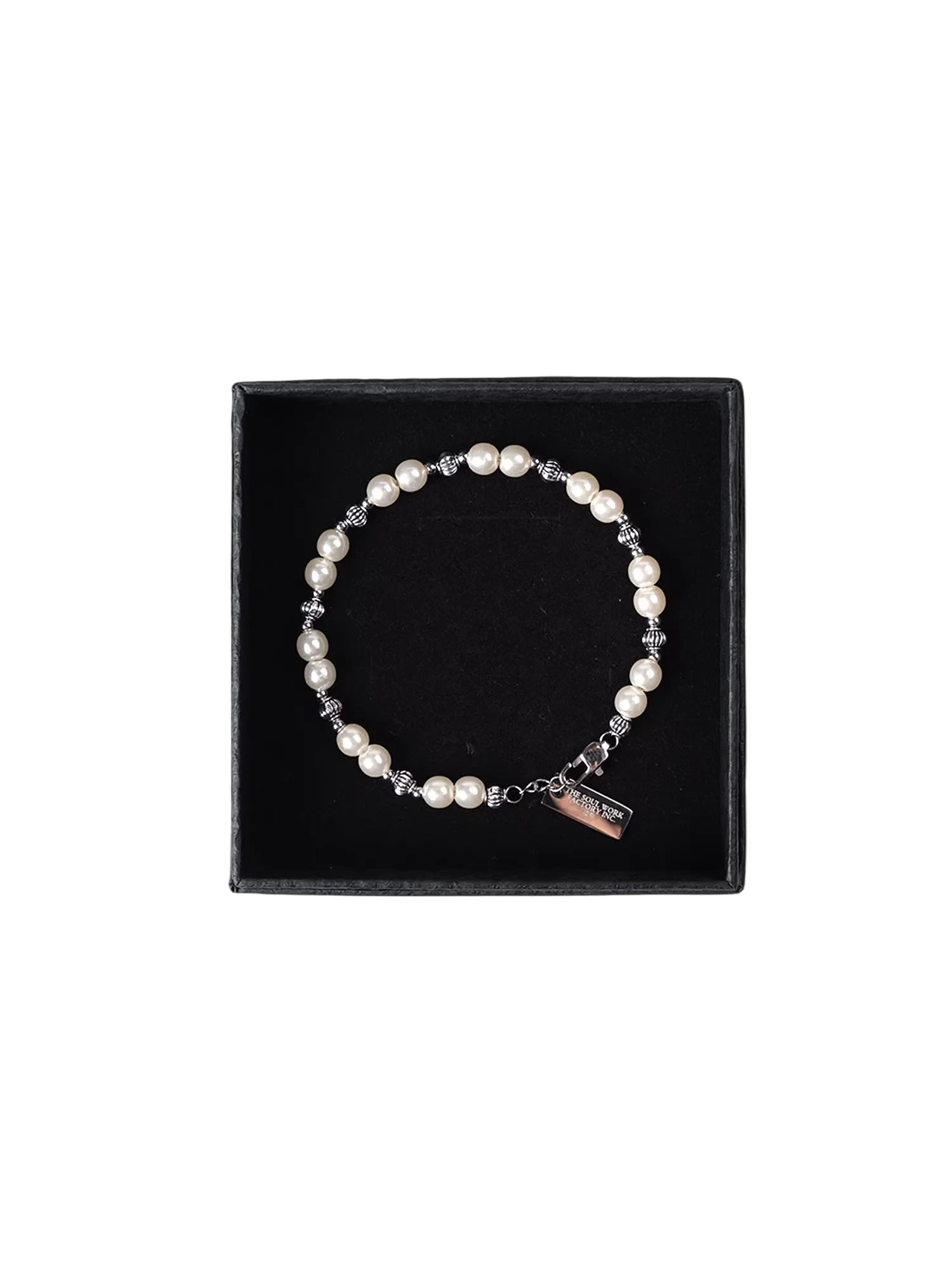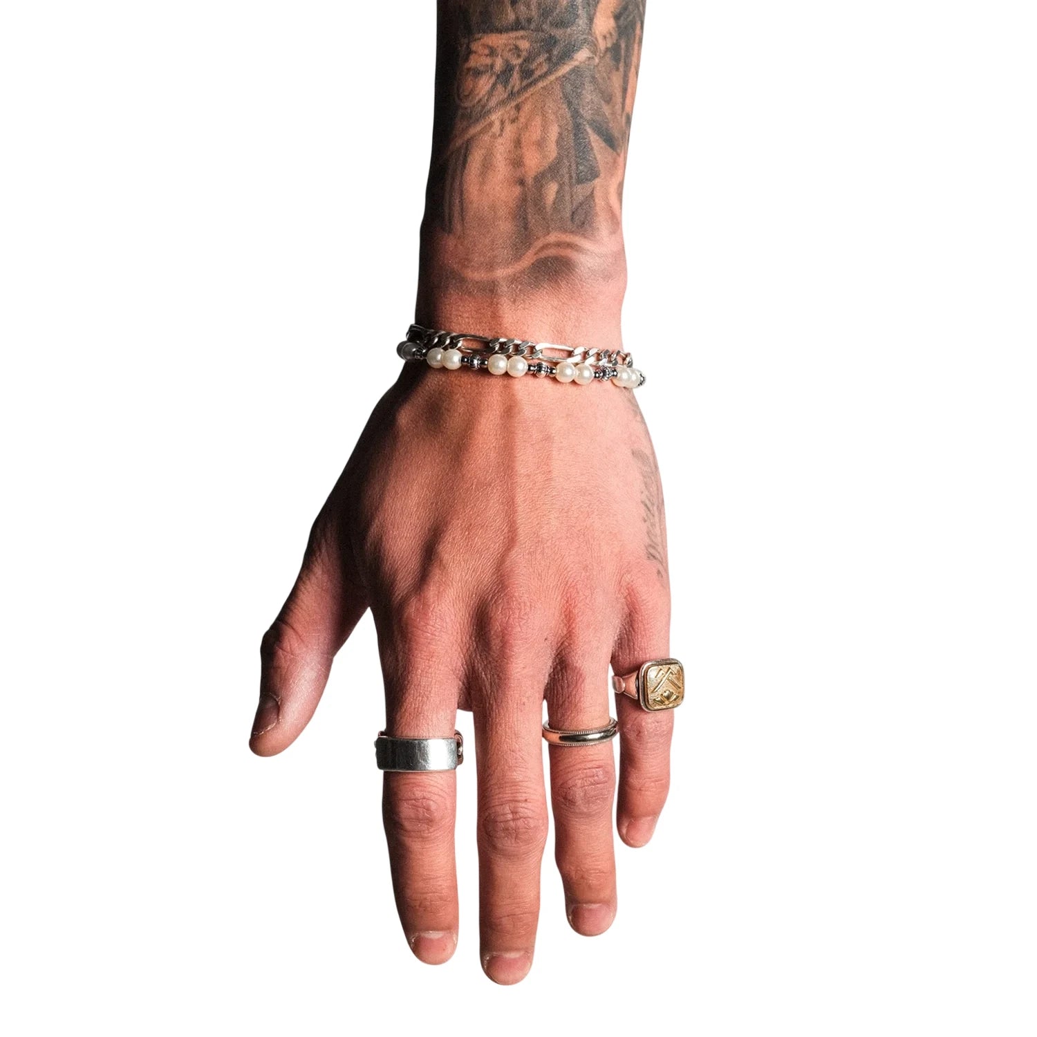This unisex bracelet combines elegant white pearls with modern metallic chain links for a bold, layered accessory. Designed with a unique spliced style, it adds a personalized and edgy touch to any outfit. Ideal for those who appreciate contemporary fashion with a niche aesthetic, this versatile piece complements both casual and statement looks.