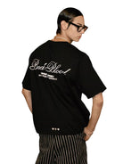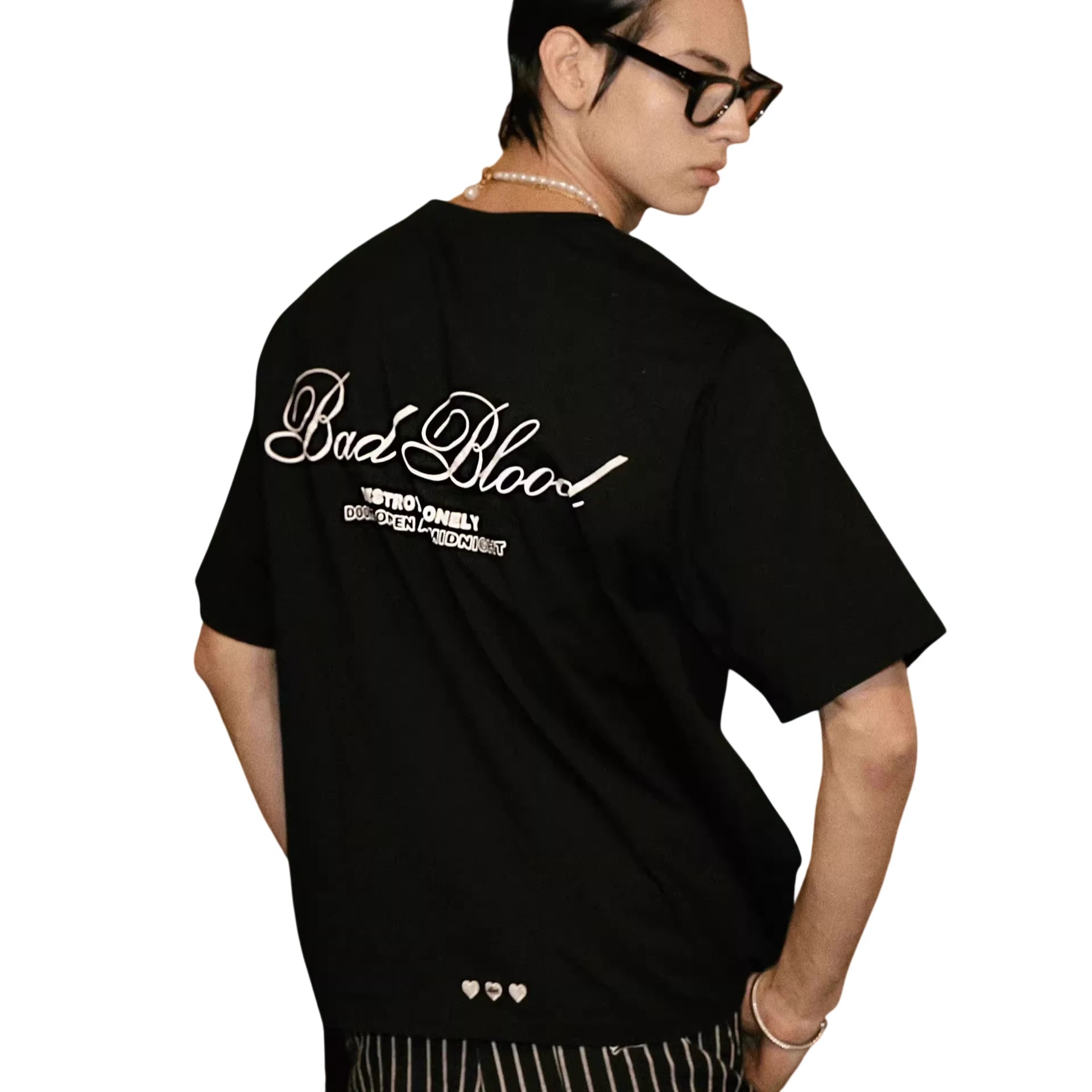 Embrace a bold, vintage-inspired look with this oversized cotton crew neck T-shirt for women. Featuring a striking letter print on the back, including the phrase 'Bad Blood!' in prominent typography, this short-sleeved tee delivers a strong streetwear aesthetic. The relaxed fit ensures all-day comfort, while the casual design makes it a versatile addition to any wardrobe.