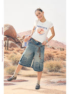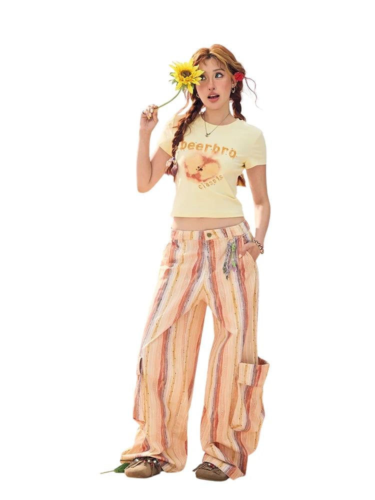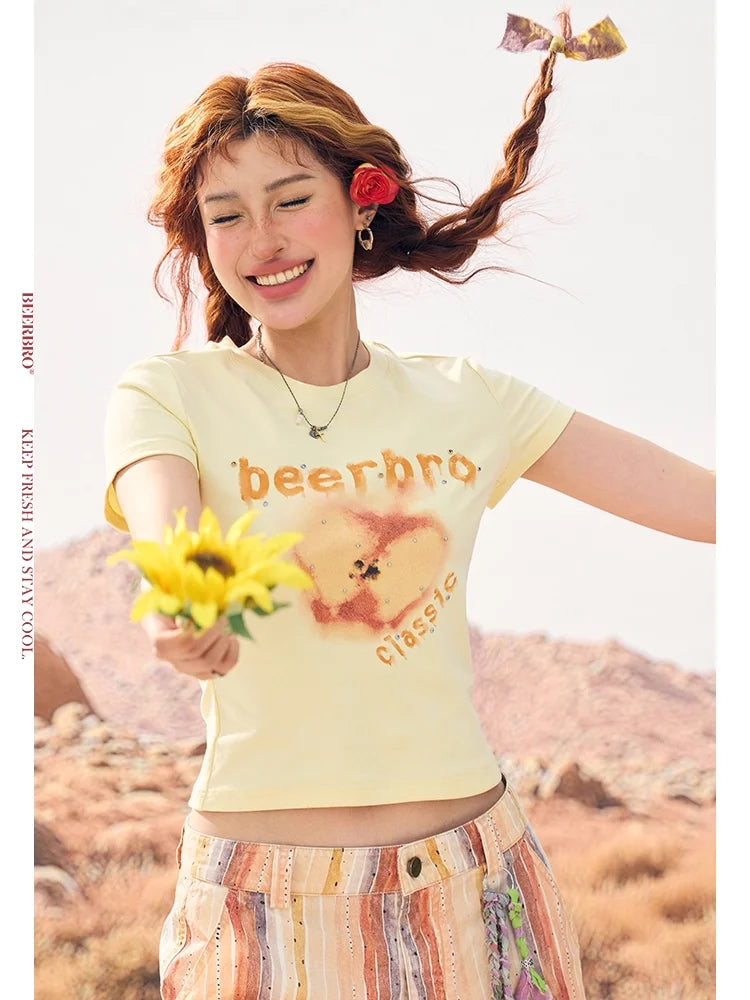 Stay stylish and cool this summer with this Y2K-inspired crop t-shirt for women. Featuring a playful melting apple graphic and sparkling rhinestone details, this fitted tee combines vintage flair with modern streetwear appeal. Available in trendy color options like white and pale yellow, it's perfectly paired with denim shorts or wide-leg striped pants for an effortlessly casual look. Great for sunny days and retro vibes.