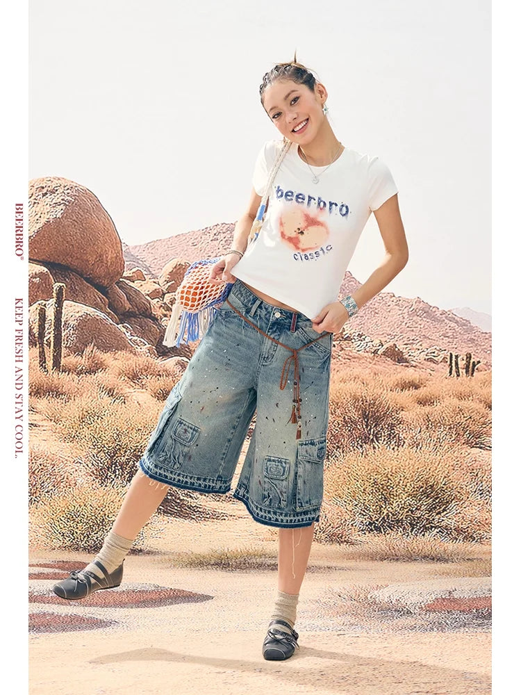 BeerBro Melting Apple Print Rhinestone Y2K Crop T-Shirt for Women