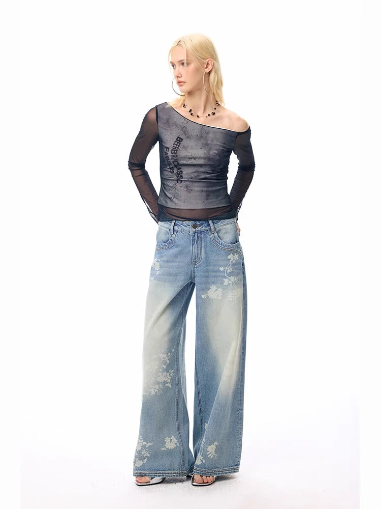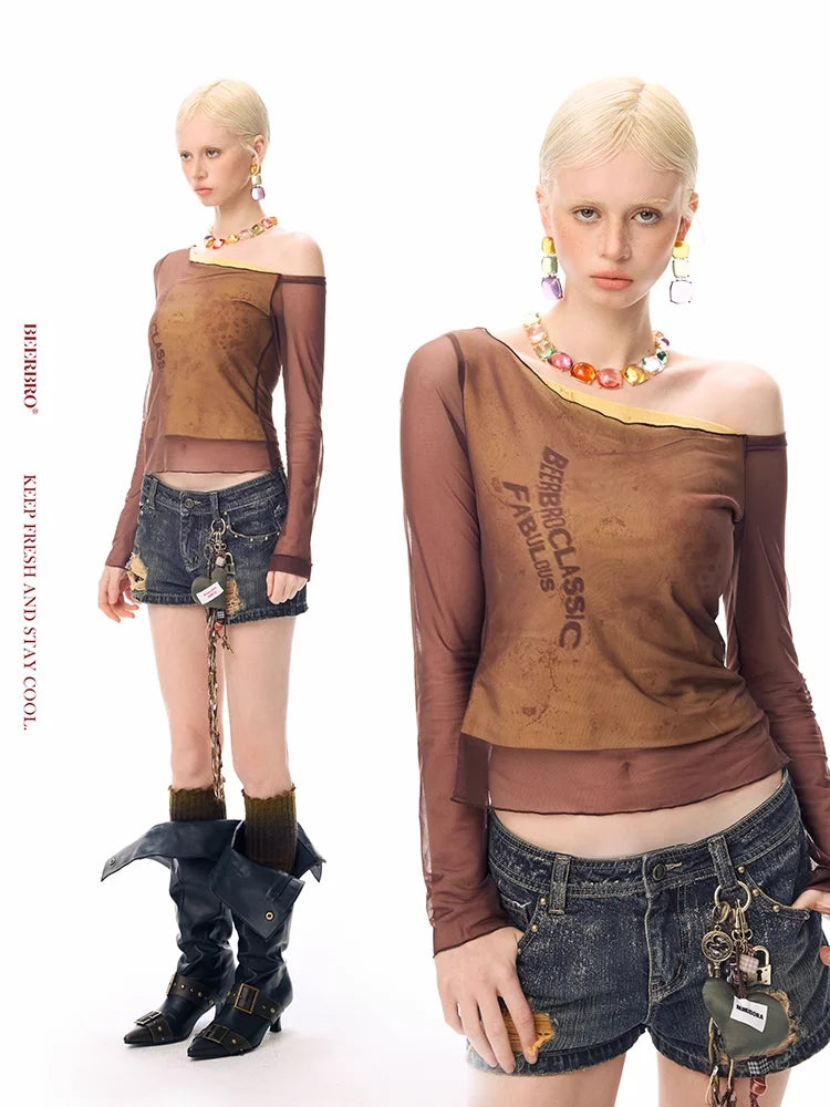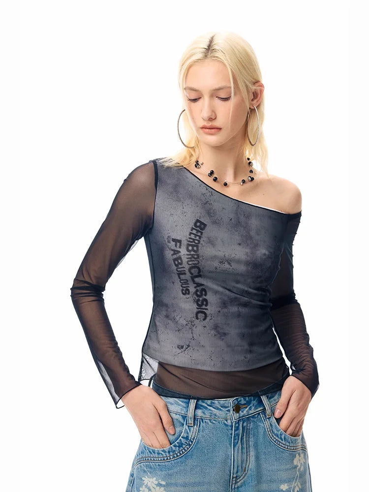 Make a bold statement with this off-shoulder mesh long sleeve top featuring a stylish snake print design and gradient color effect. Designed with a faux two-piece look, it includes an asymmetrical sheer overlay that exudes edgy, streetwear-inspired vibes. The raw hem and one-shoulder silhouette create a grunge aesthetic, while the distressed details add texture and modern flair. A matching tank underneath displays a playful slogan, enhancing the layered style. Perfect for the fashion-forward woman seeking a unique urban look.