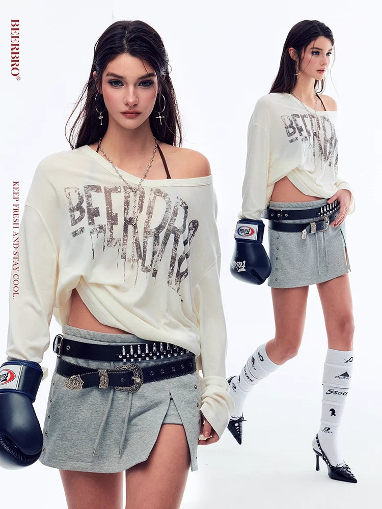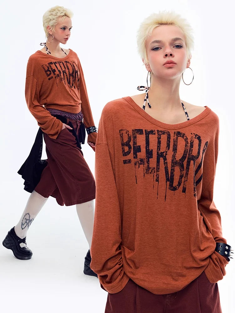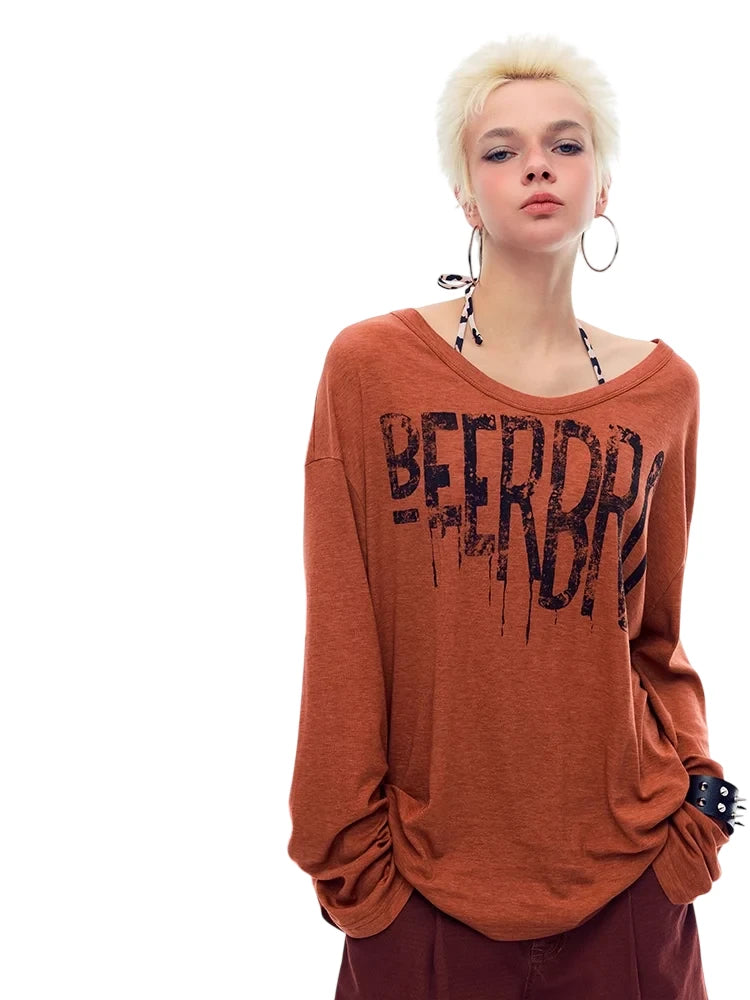 This stylish women's long sleeve t-shirt combines comfort with streetwear flair. Crafted from soft, breathable fabric, it features an off-shoulder design and a relaxed fit for a laid-back yet edgy look. The distressed 'BEERBRO' graphic print lends a vintage vibe, while the asymmetric hem enhances its casual appeal. Perfect for trendsetters looking to make a fashionable statement.