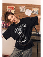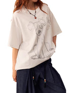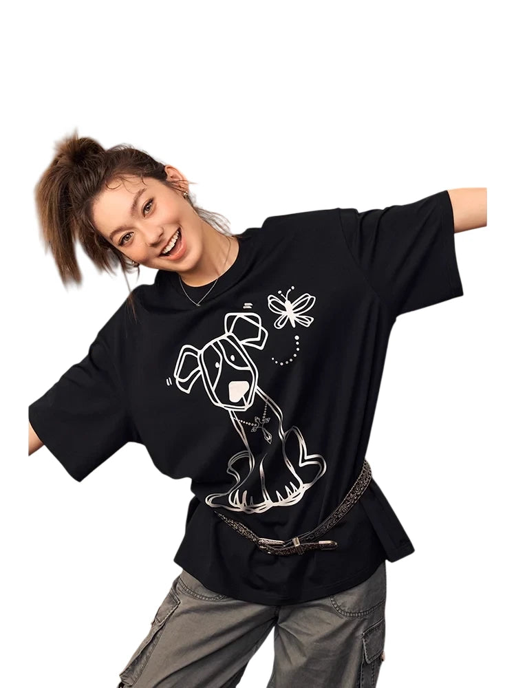 This women's loose-fitting T-shirt features a playful line-drawn puppy graphic with delicate butterflies on the front. Made from soft lyocell fabric, it offers a lightweight, breathable feel designed to keep you cool and comfortable. The relaxed silhouette includes dropped shoulders and short sleeves, perfect for casual wear. Styled with jeans and fun accessories, this T-shirt pairs effortlessly with your laid-back wardrobe.
