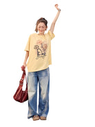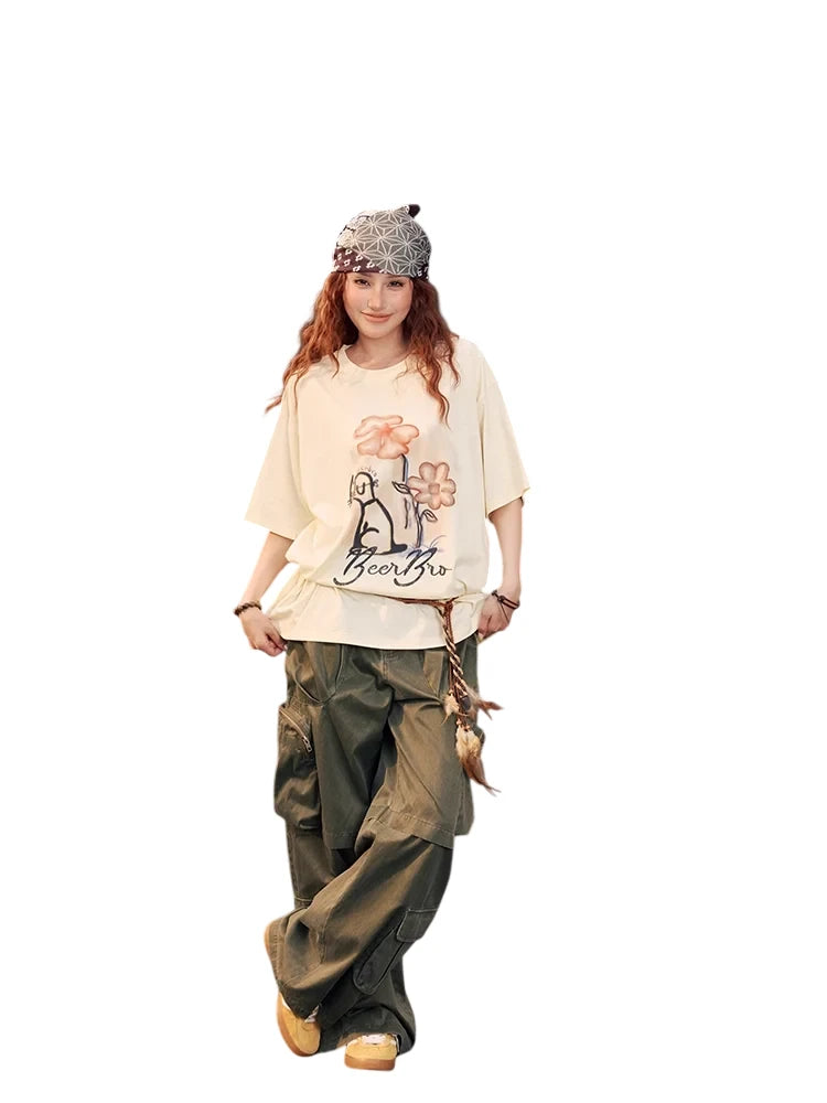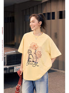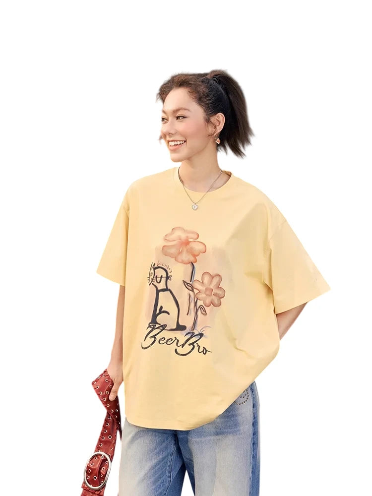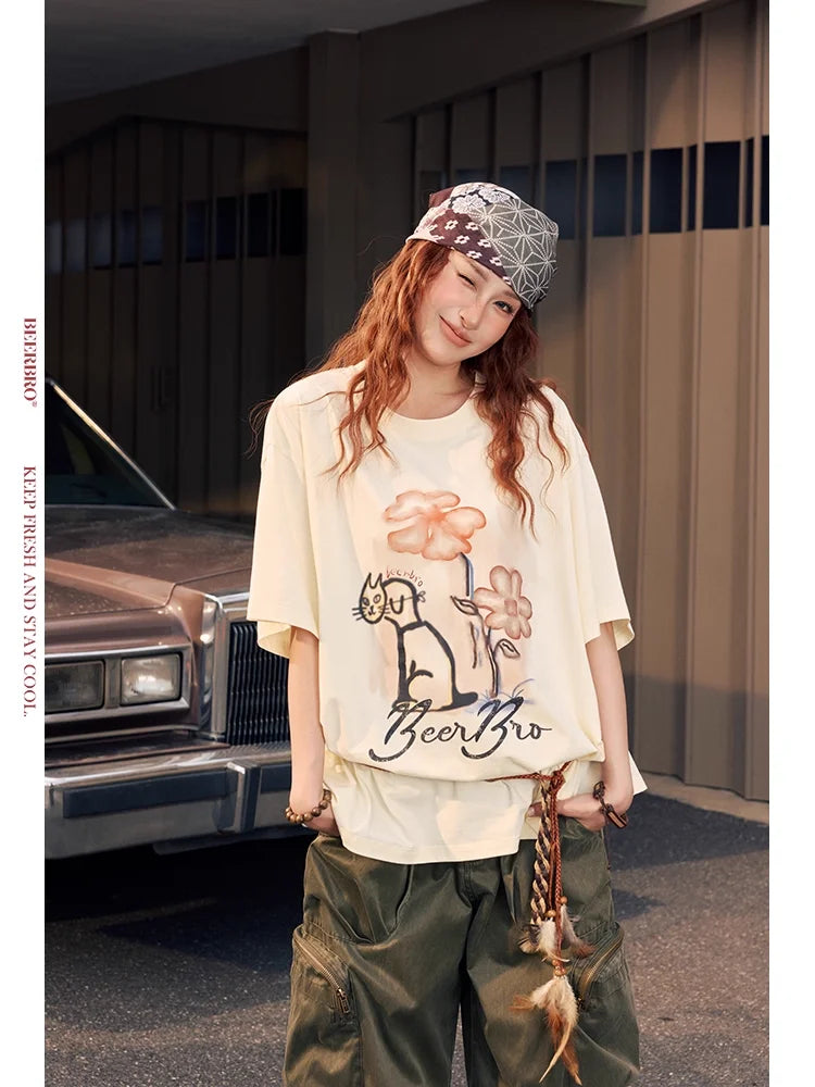 Express your playful side with this lightweight and soft short sleeve t-shirt designed for women. Featuring a charming hand-drawn floral and cat print, this relaxed-fit tee offers both comfort and an artistic flair. Its oversized silhouette adds a trendy, streetwear-inspired touch, perfect for casual outings or laid-back styling.