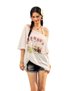Stay cool and stylish this summer with this comfortable off-shoulder T-shirt designed for women. Featuring a relaxed fit and breathable fabric, it showcases a playful graphic print with vibrant colors and whimsical elements, perfect for a fun and casual look. Ideal for outdoor gatherings or lounging in warm weather, this tee pairs effortlessly with shorts or jeans for a laid-back vibe.