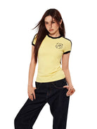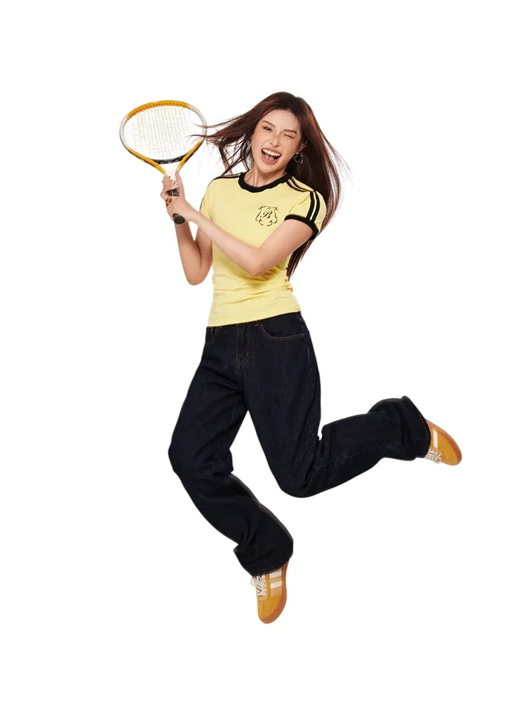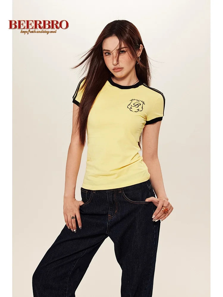 This women's slim fit short sleeve T-shirt features a retro-inspired design with sporty black stripes along the shoulders and contrasting edging. The fitted silhouette and casual styling make it perfect for athletic or everyday wear. A small chest graphic adds a classic touch to the vintage look.
