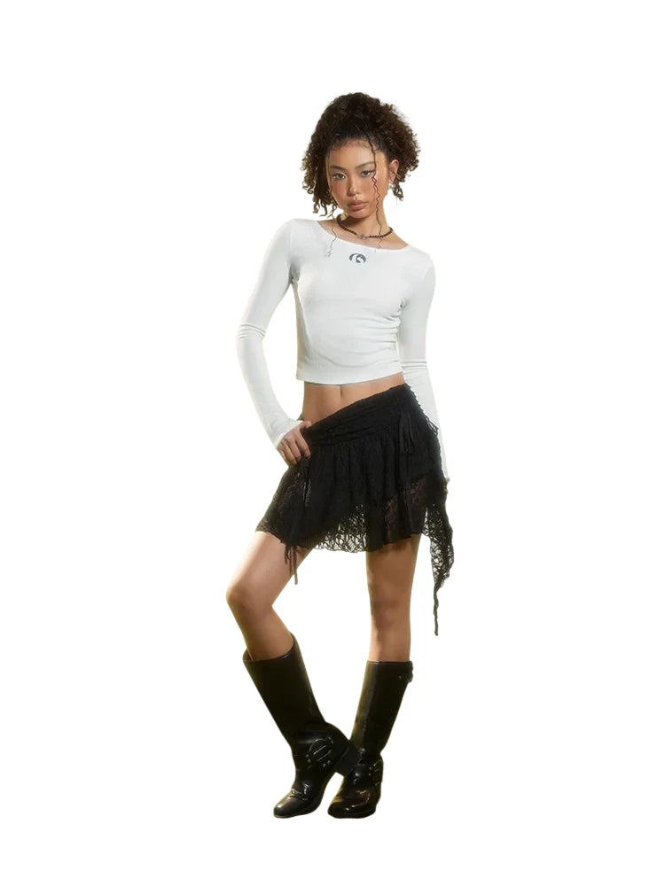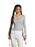 This women's long sleeve crop top features a vertical ribbed pattern for a slimming silhouette. Designed with a round neckline and a subtle logo detail below the collar, it offers a clean, minimalist aesthetic perfect for layering or wearing on its own. The fitted cut and mid-length design make it ideal for spring wear.