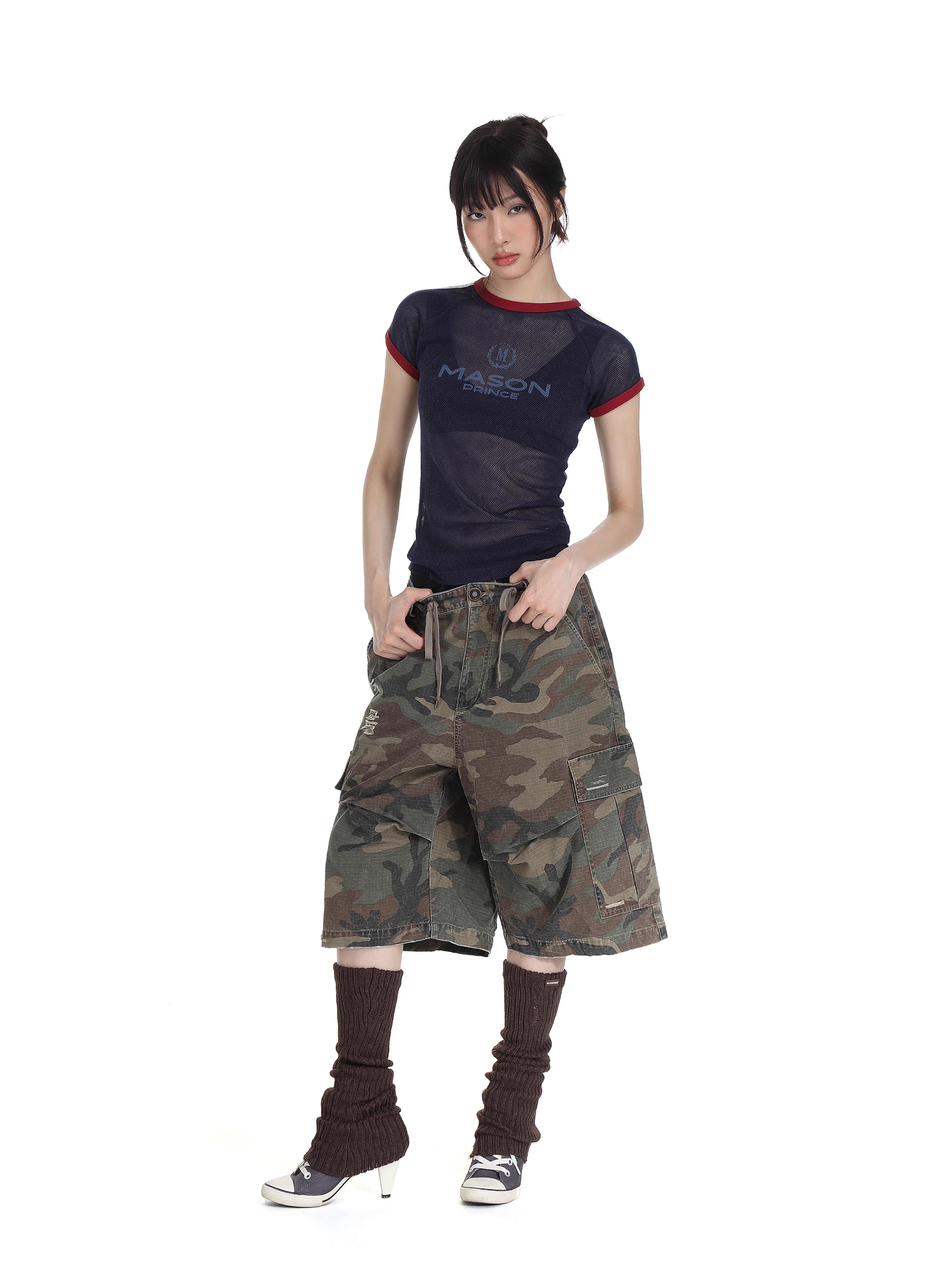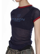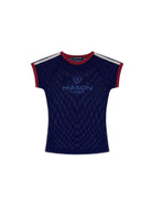 This women's short sleeve T-shirt offers a modern slim fit and features a breathable mesh construction ideal for summer wear. Designed with red trim on the crew neckline and sleeve cuffs, the striped navy blue mesh delivers a bold yet lightweight aesthetic. The structured shoulders add definition to the silhouette, while the prominently displayed logo and emblem accent the chest for a sporty, streetwear-inspired look. Perfectly paired with cargo or casual pants for a contemporary urban ensemble.