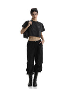 This women's cropped T-shirt offers a modern, streetwear-inspired look with a sustainable heavy washed knit fabric. Designed with a standard fit, it features regular shoulders, short sleeves, and a subtly stylish chest tag detail. The back of the tee showcases bold black printed design elements with branding and barcodes, adding a standout urban aesthetic. Perfect for pairing with high-waisted jeans or relaxed trousers, this versatile piece combines comfort and effortless style for the summer season.