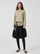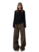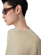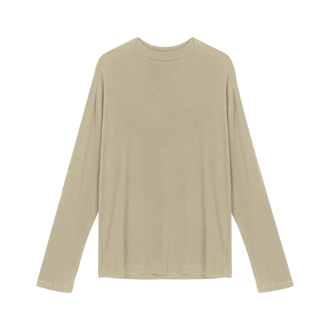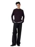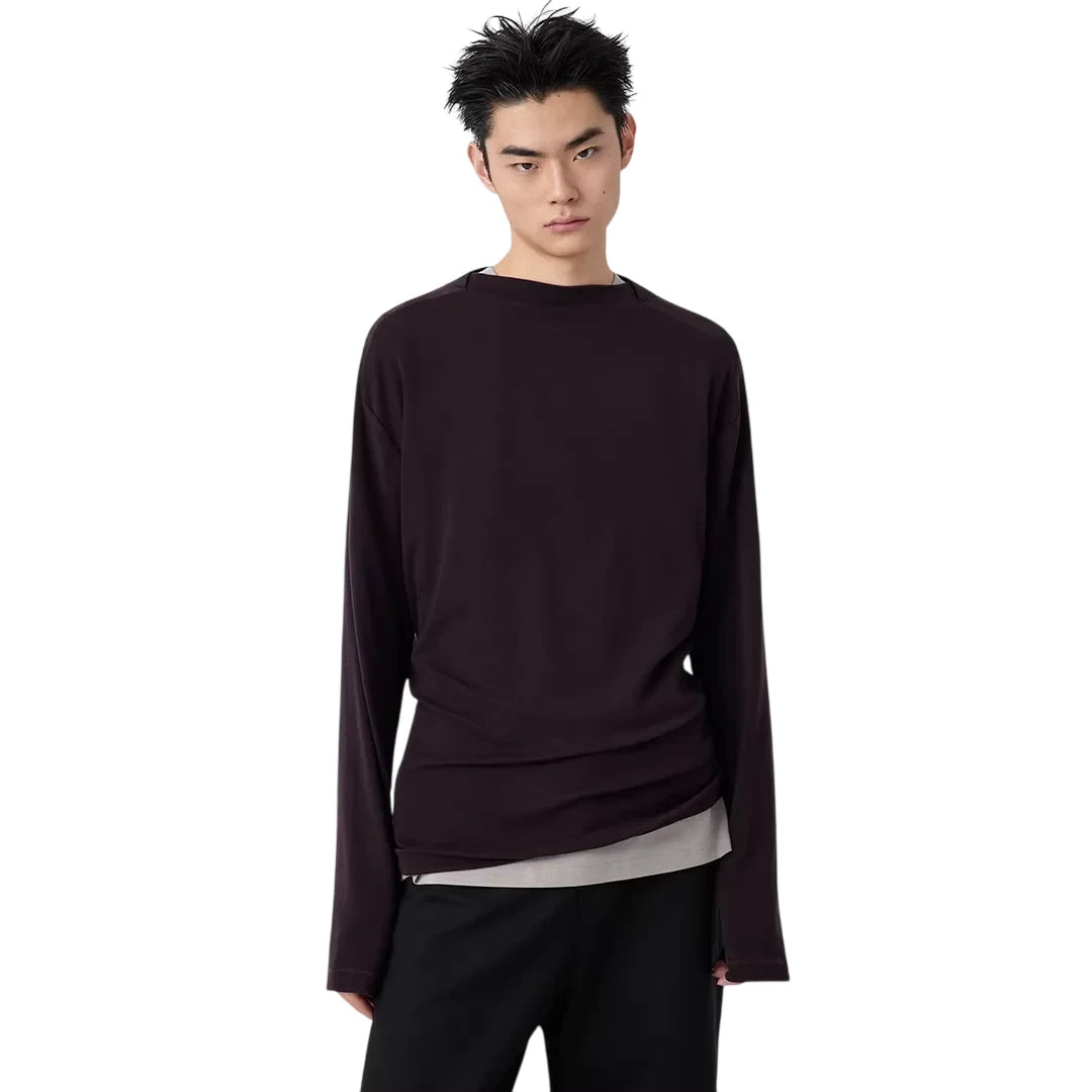 This men's long sleeve t-shirt features a classic crew neck and a relaxed fit, offering both comfort and contemporary style. Designed in a deep, dark hue, it pairs effortlessly with casual ensembles. Slightly elongated sleeves and a layered look with a contrasting undershirt enhance its modern, minimalist aesthetic.