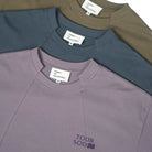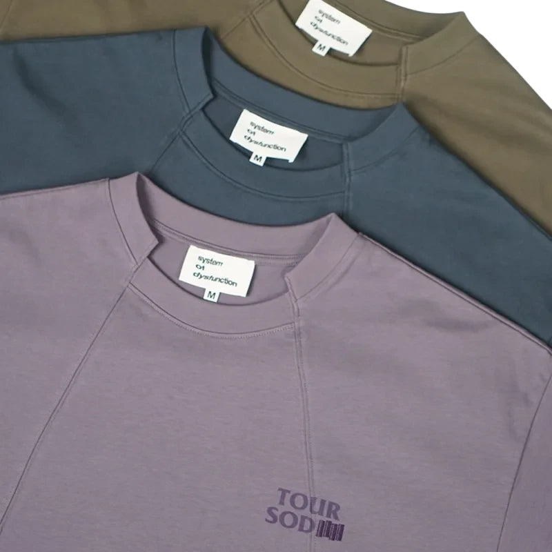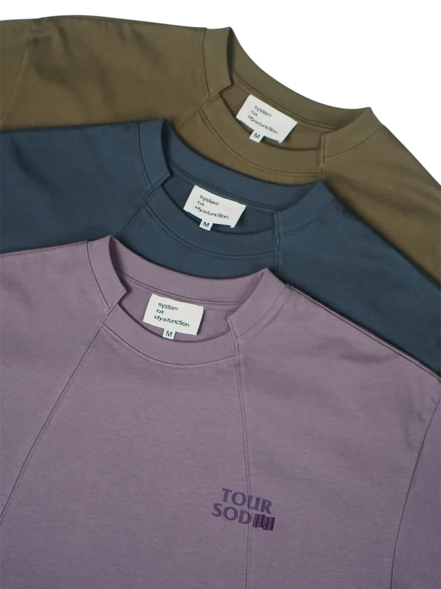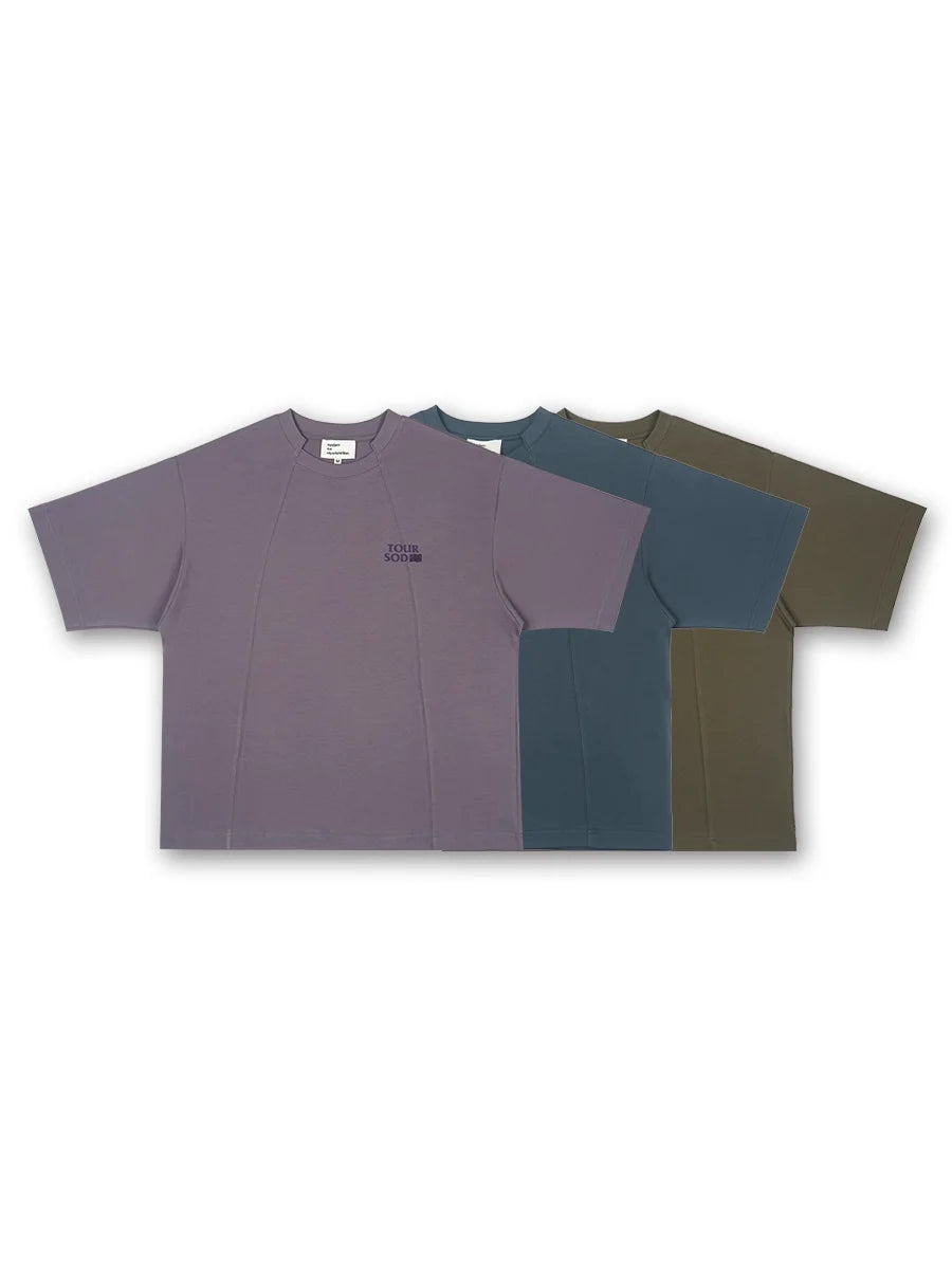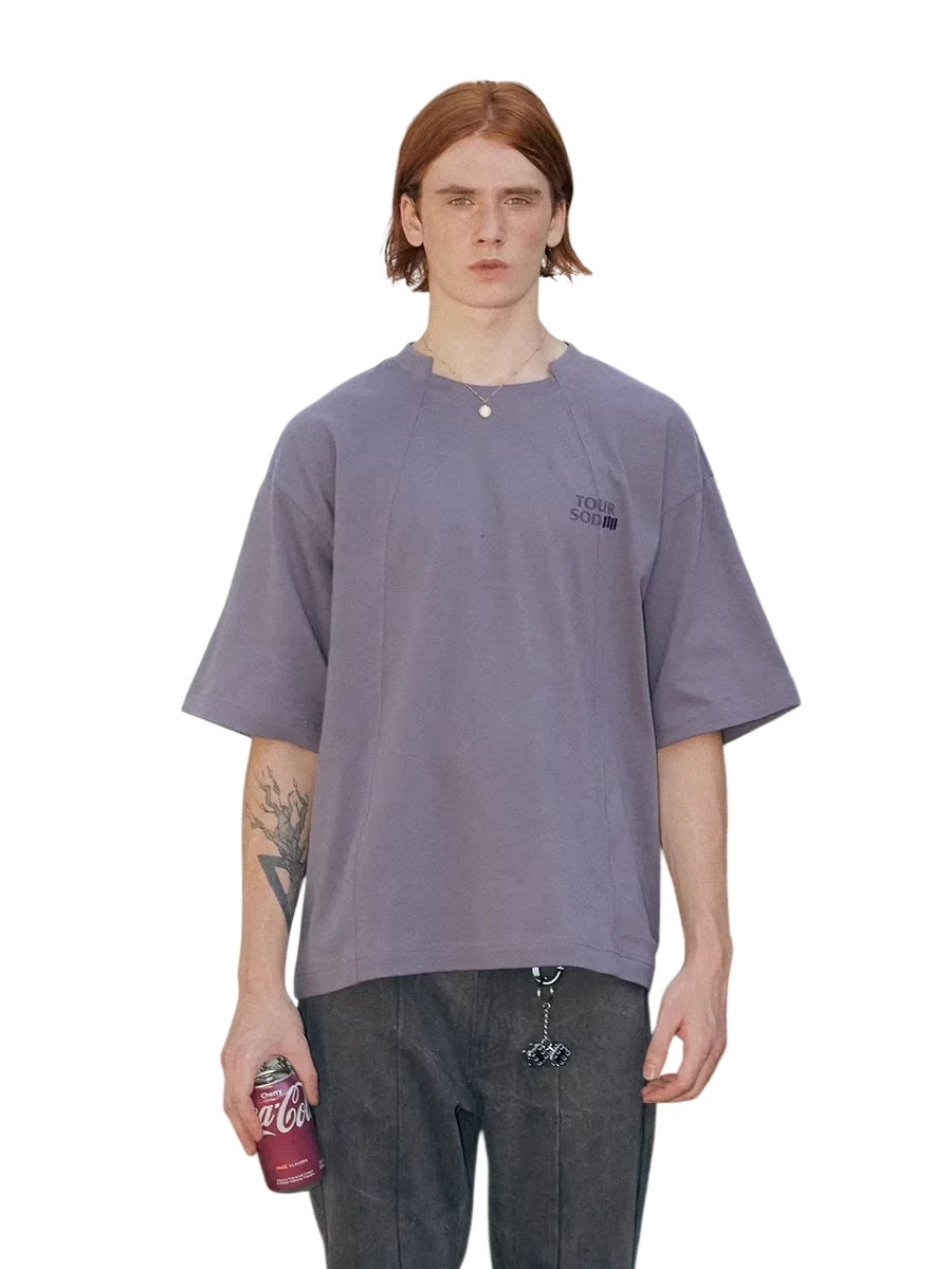 Experience effortless style with this unisex short-sleeve t-shirt, crafted from soft cotton for all-day comfort. Featuring a deconstructed aesthetic with visible panel stitching, a classic crew neckline, and solid color options including taupe, slate blue, and mauve. The mauve variant includes a unique printed design with the text 'TOUR SOD' and a stylized barcode near the lower chest. Reinforced seams along the collar and shoulders add durability to this modern essential.
