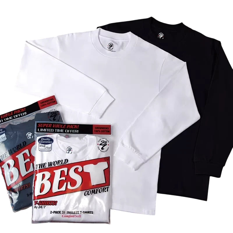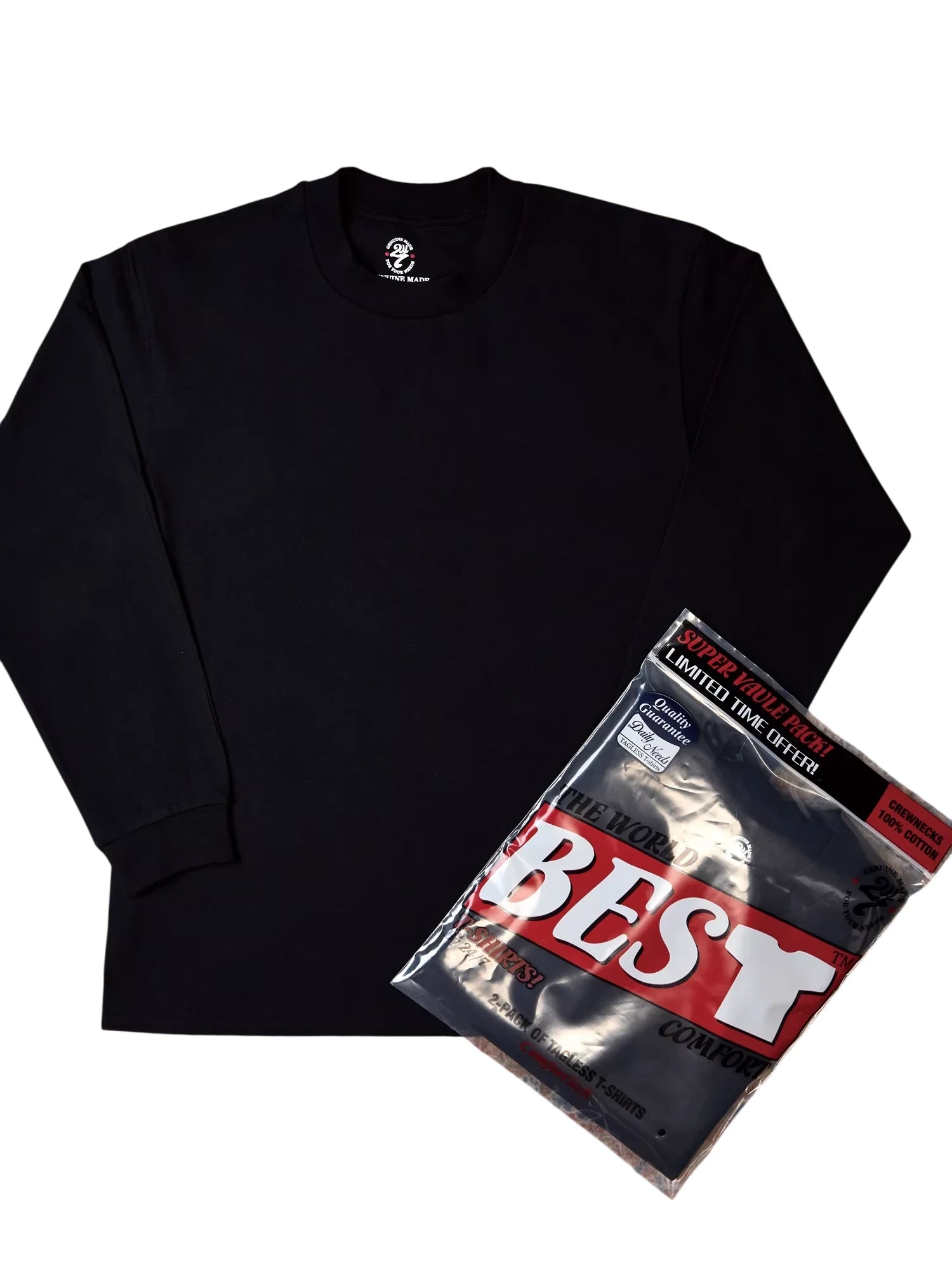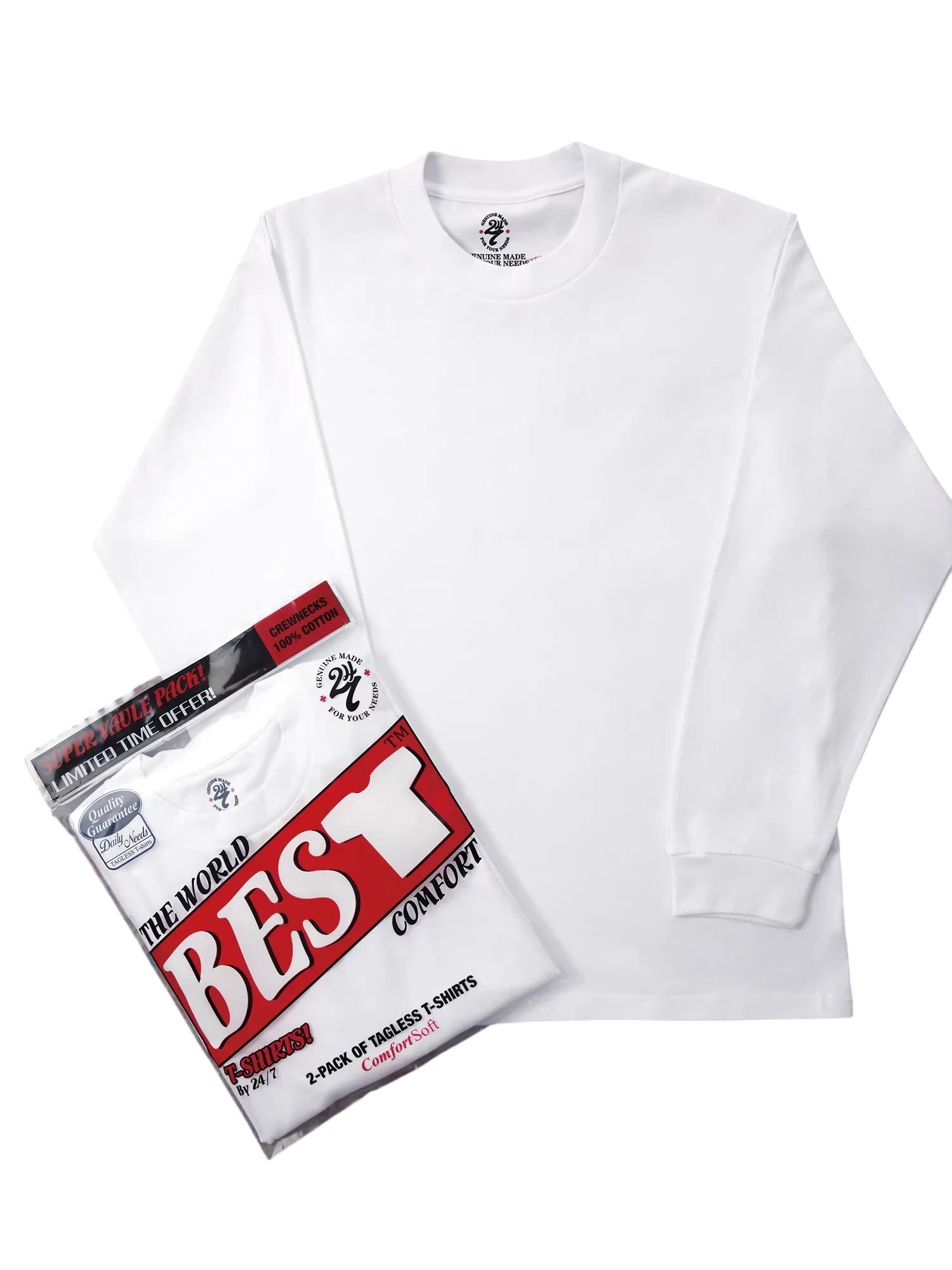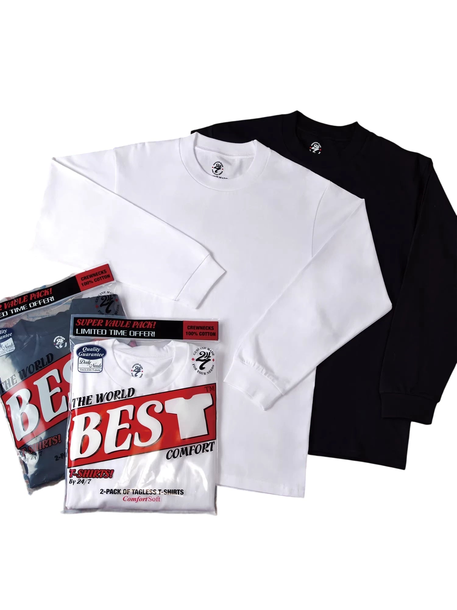 Experience all-day comfort with these men's long sleeve undershirts, crafted from 100% pure cotton for a soft and skin-friendly feel. Designed with a classic ribbed crewneck and cuffs, these basic solid color t-shirts provide a versatile and timeless look suitable for everyday wear. Ideal for layering or wearing on their own, each pack includes two tagless t-shirts featuring ComfortSoft fabric for enhanced ease and quality. A great choice for essential wardrobe basics.
