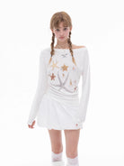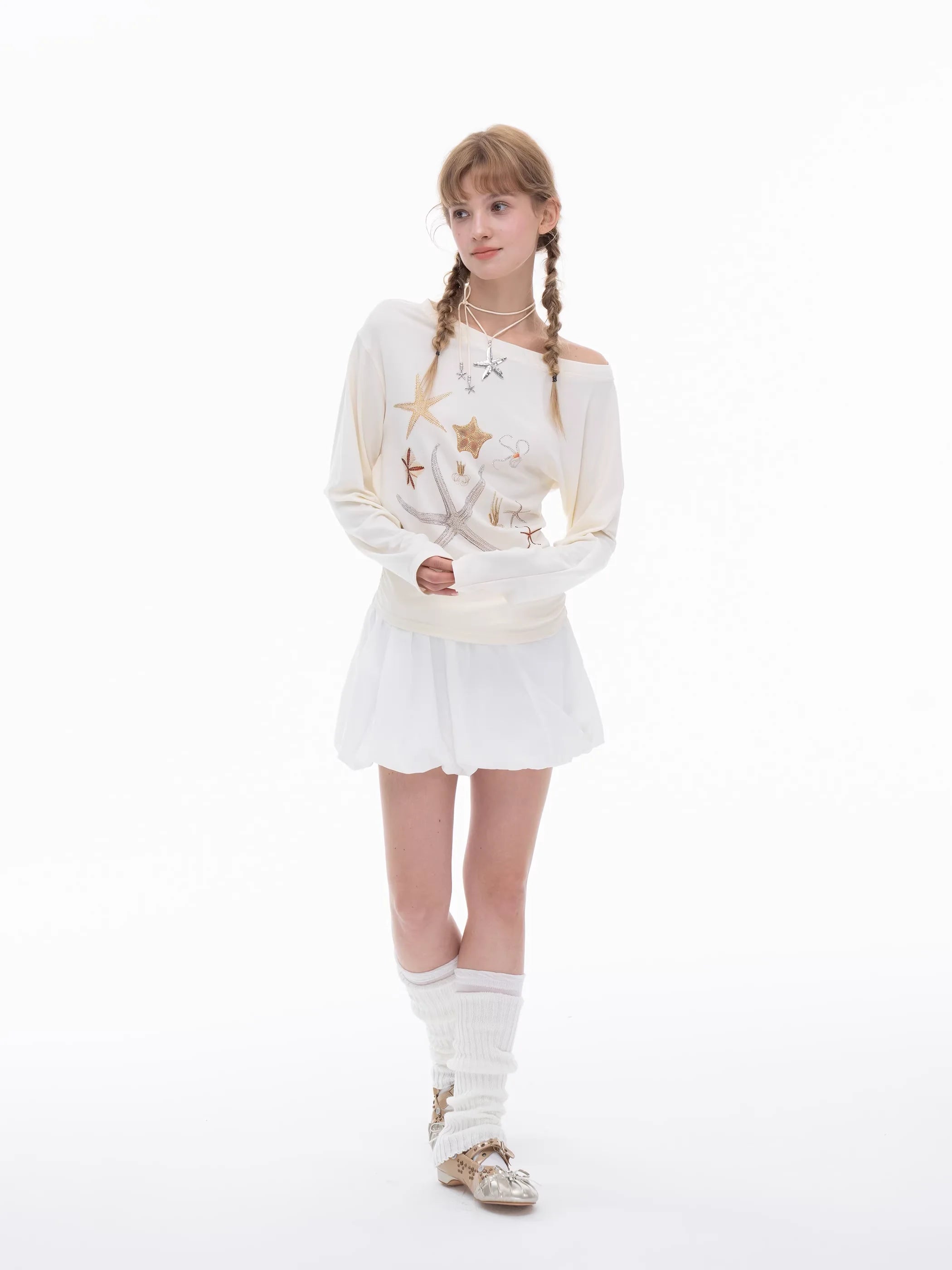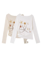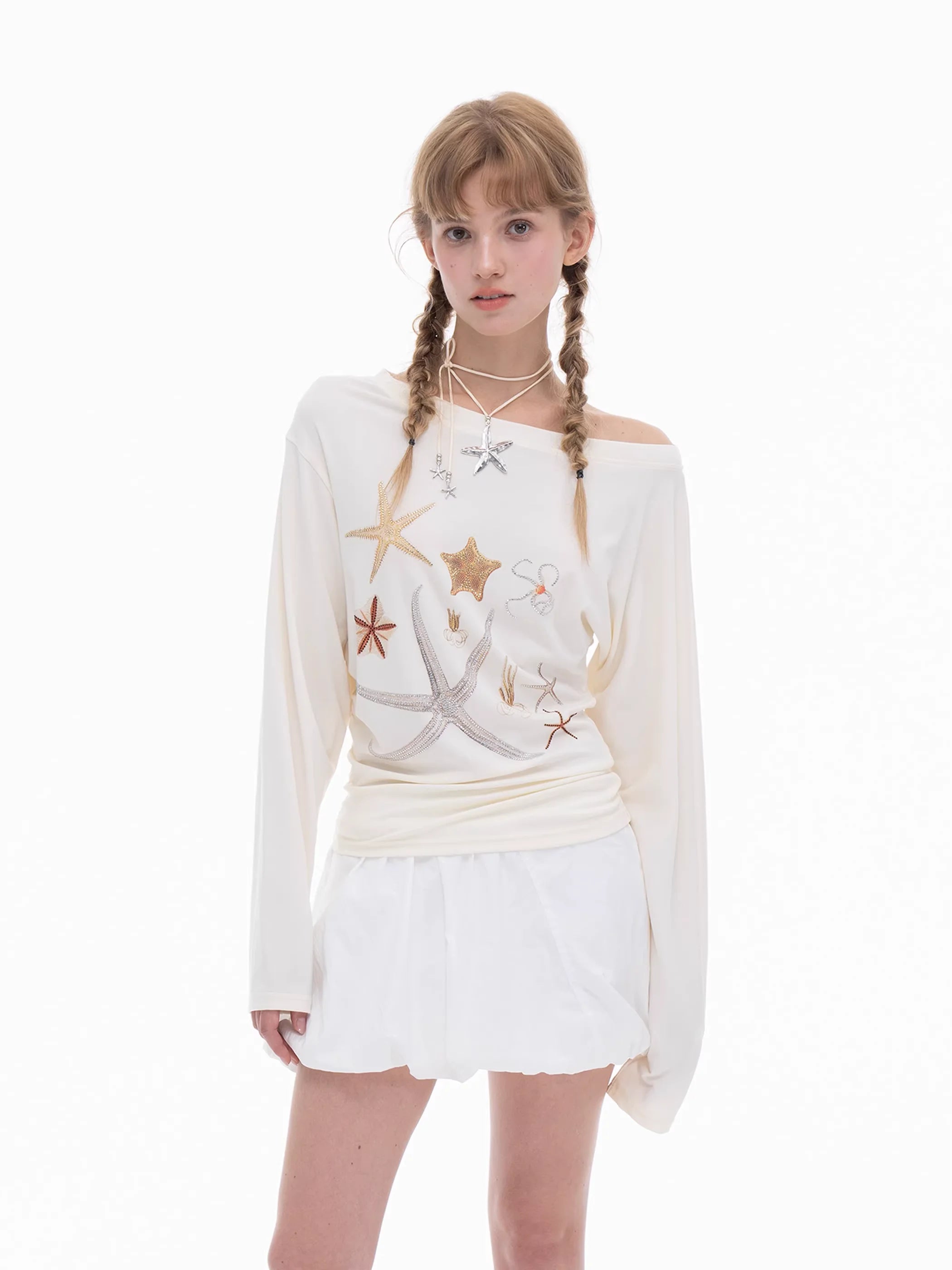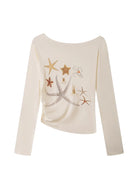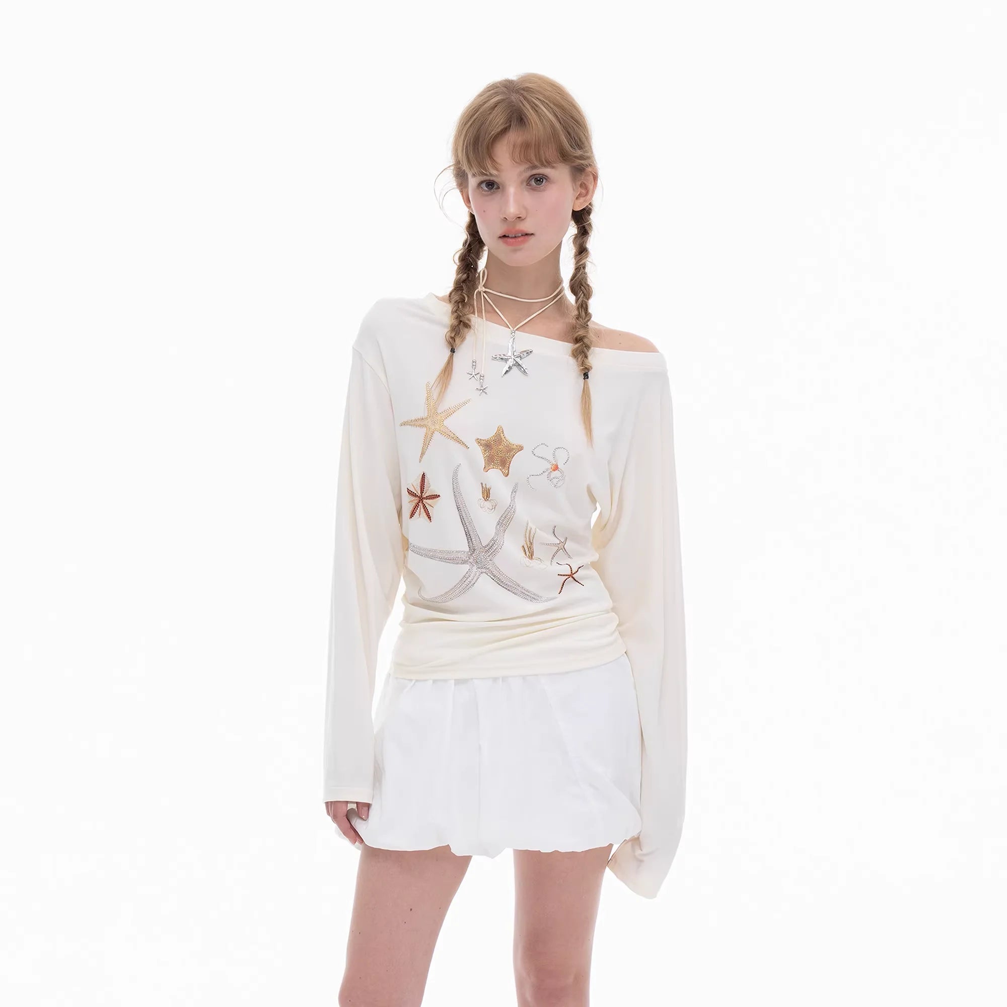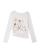 THELIGHT OFFICIAL Women's Off-Shoulder Lyocell Cooling Long Sleeve T-Shirt with Starfish Design