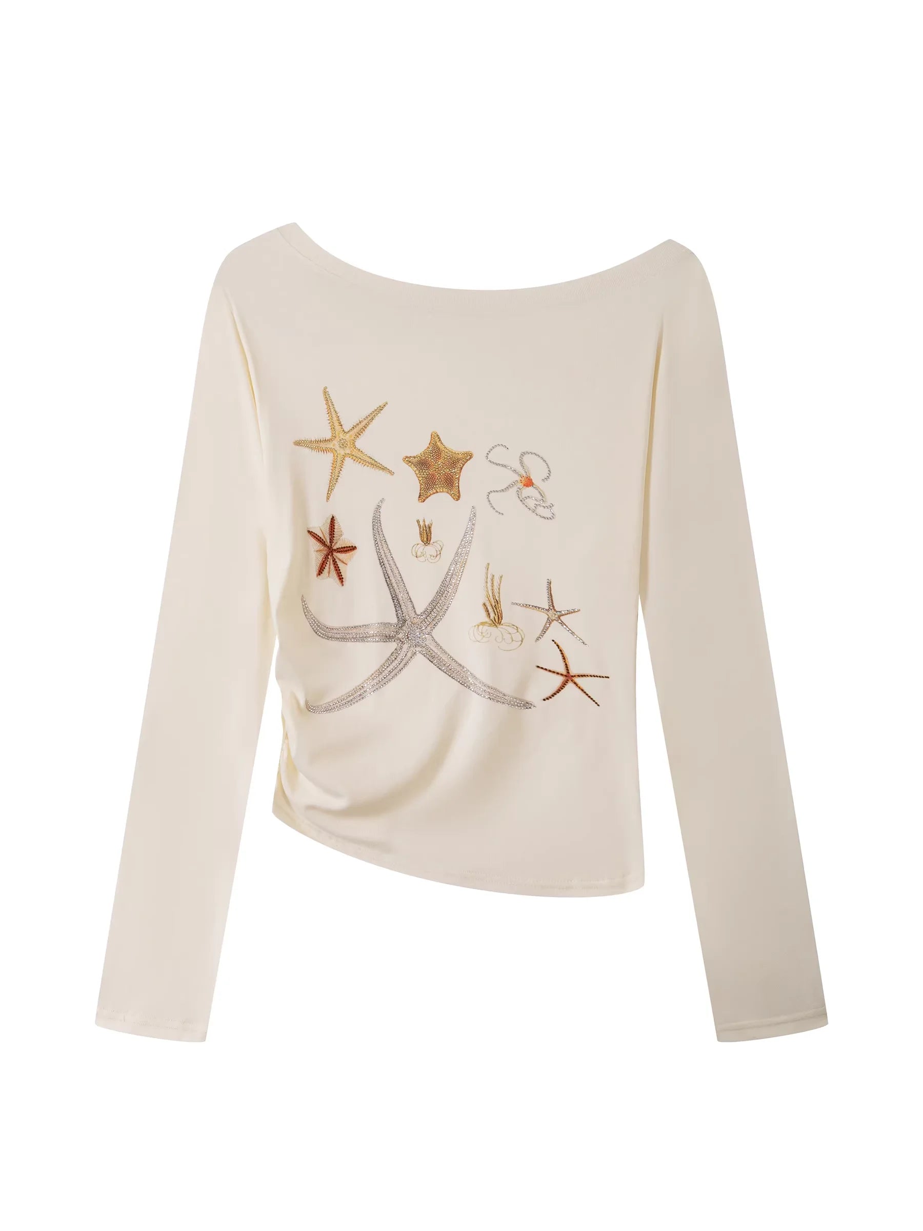 Elevate your summer wardrobe with this stylish off-shoulder long sleeve T-shirt designed for women. Made from breathable lyocell fabric, it offers a cooling effect ideal for warm weather. The cream-colored top features an asymmetrical neckline and waist-cinching cut for a flattering silhouette. Metallic starfish and sea-themed accents in gold, silver, and copper tones add a distinctive marine-inspired flair. A relaxed fit with dropped shoulders ensures effortless elegance and comfort.