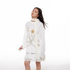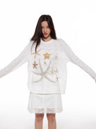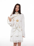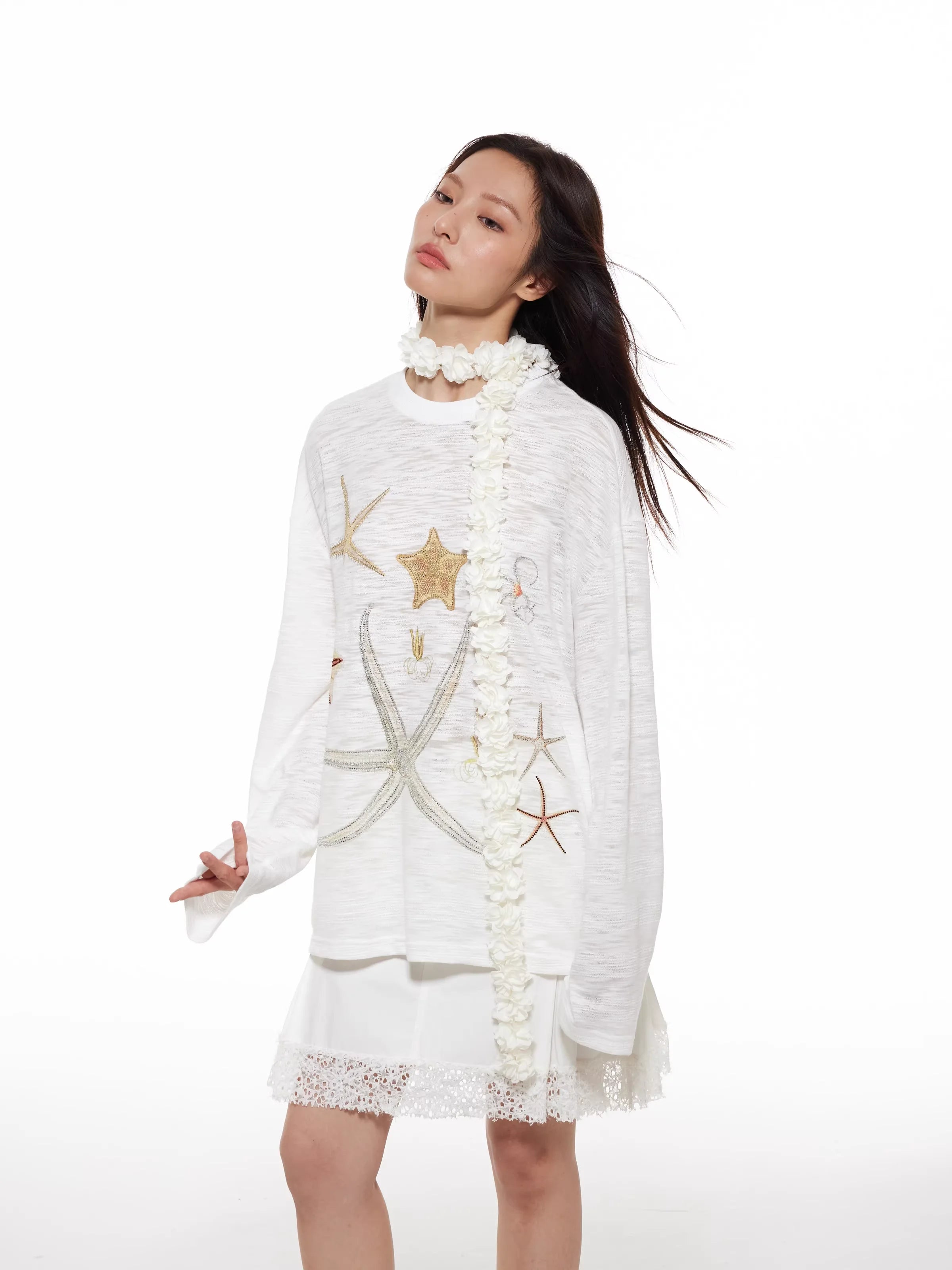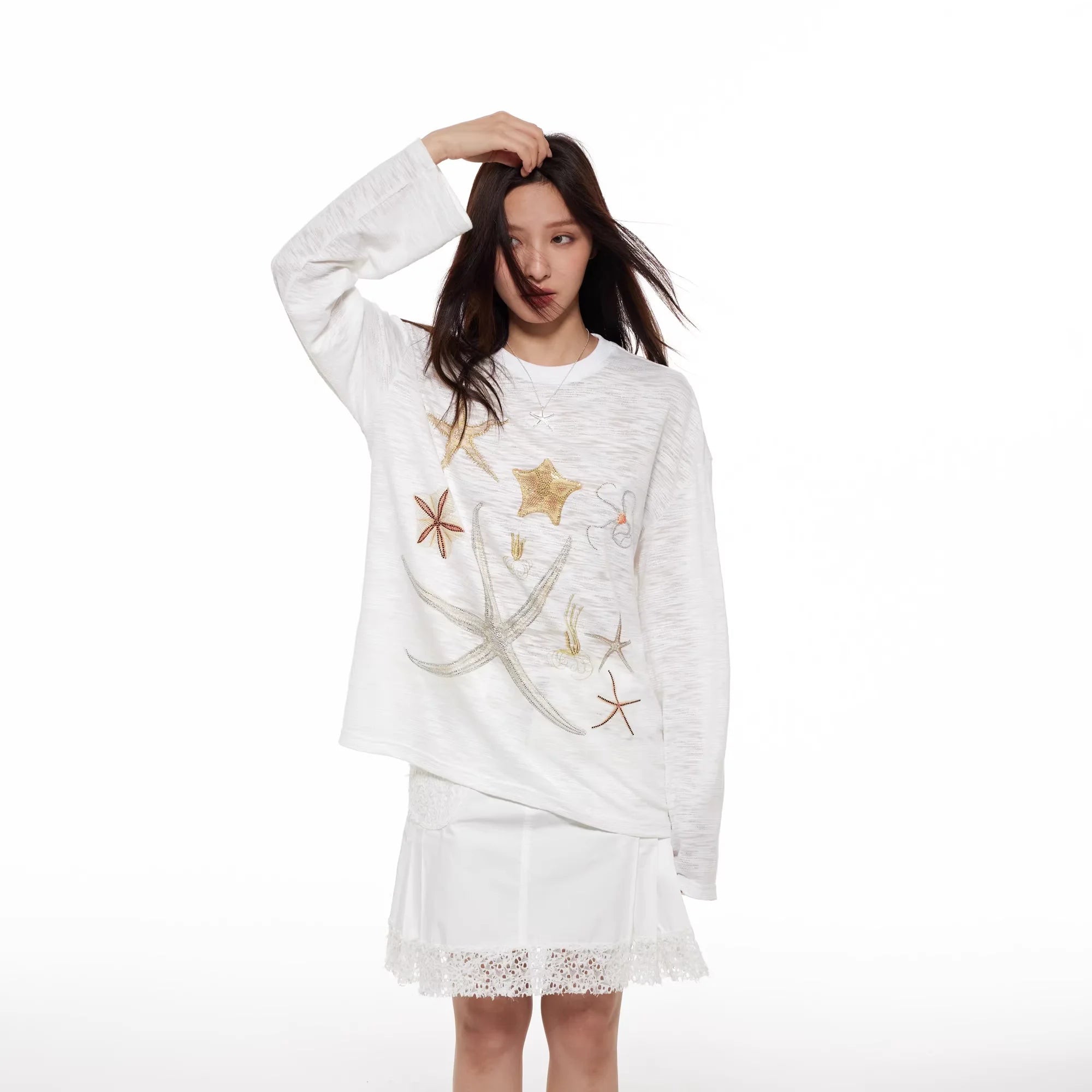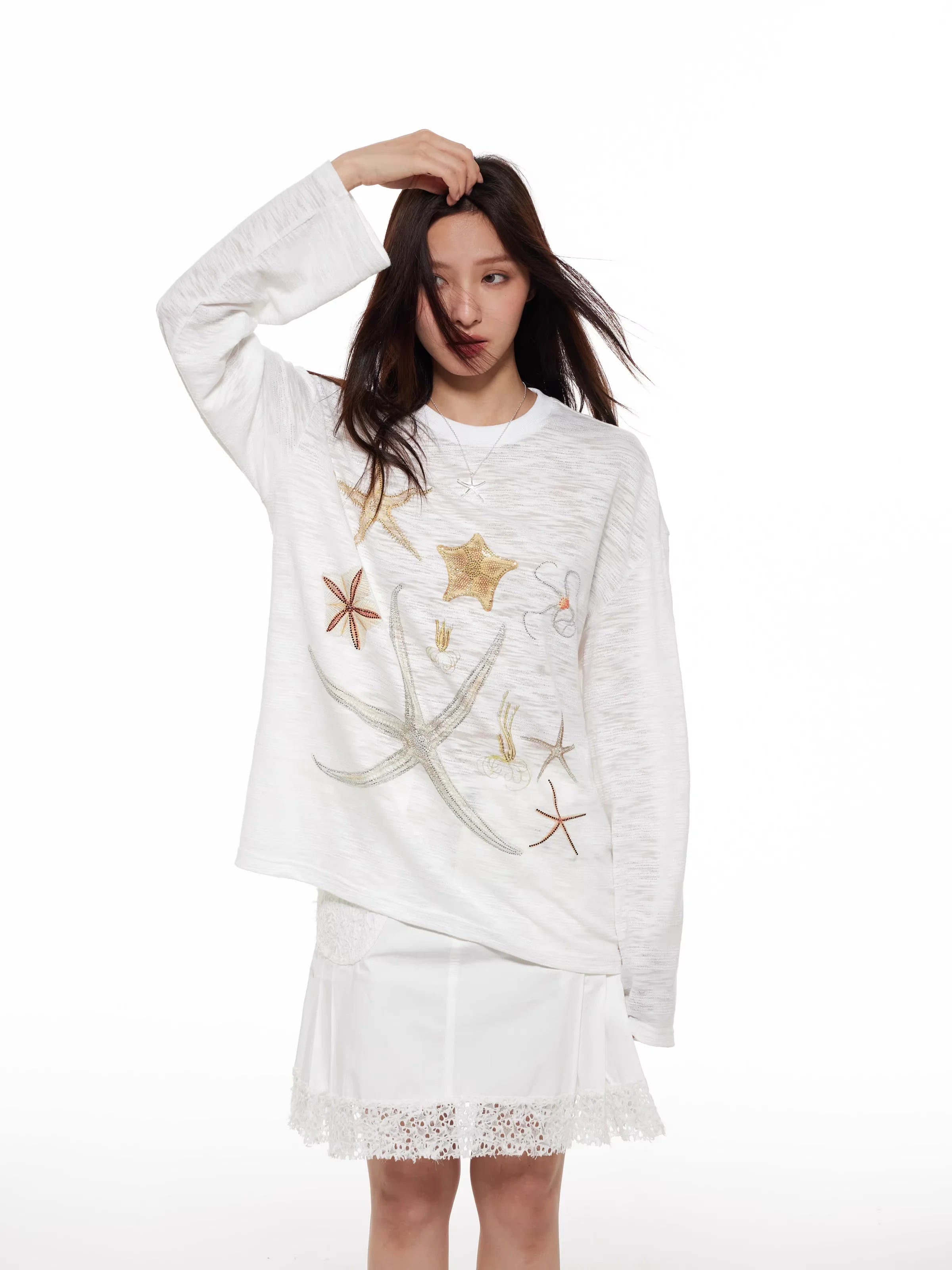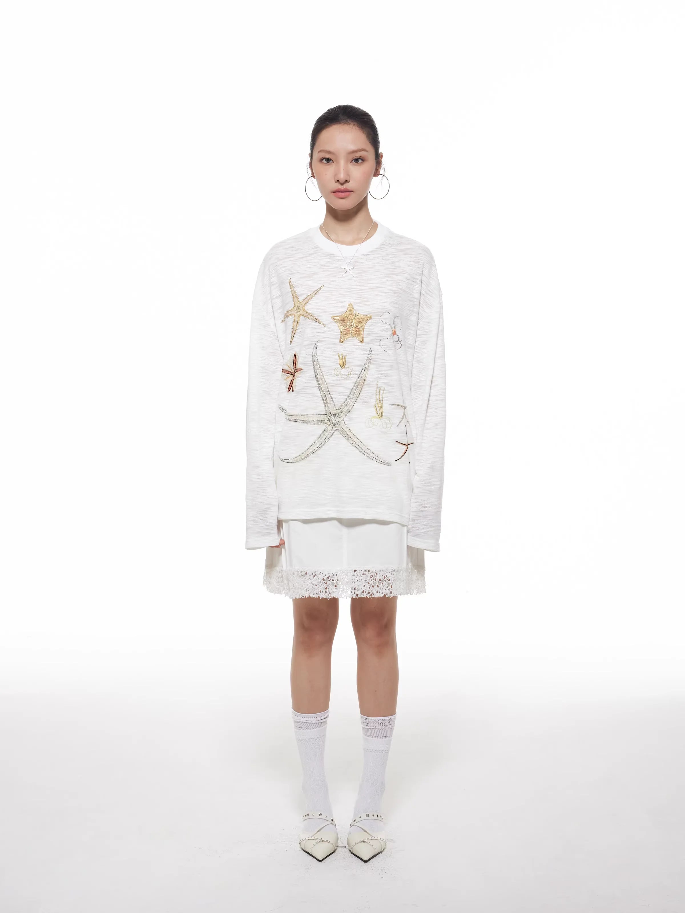 This women's long sleeve T-shirt features a relaxed, oversized fit for a laid-back and comfortable style. Crafted from a soft, textured fabric, this white top is adorned with embroidered starfish and sea-themed designs in earthy tones of gold, brown, and silver. The crew neck and casual silhouette make it perfect for everyday wear. Paired beautifully with a lace-trimmed skirt, it adds a feminine and beach-inspired touch to your wardrobe.