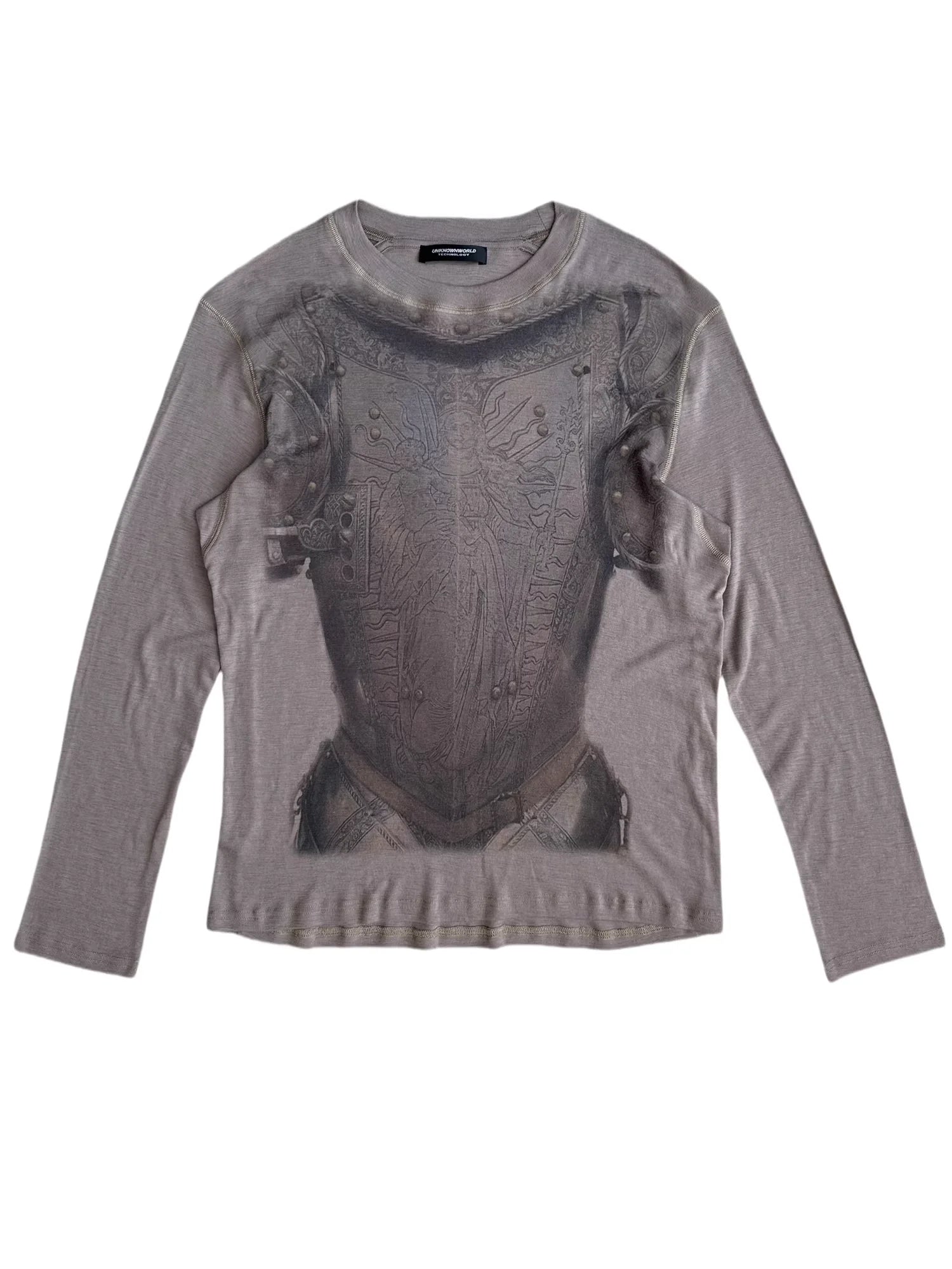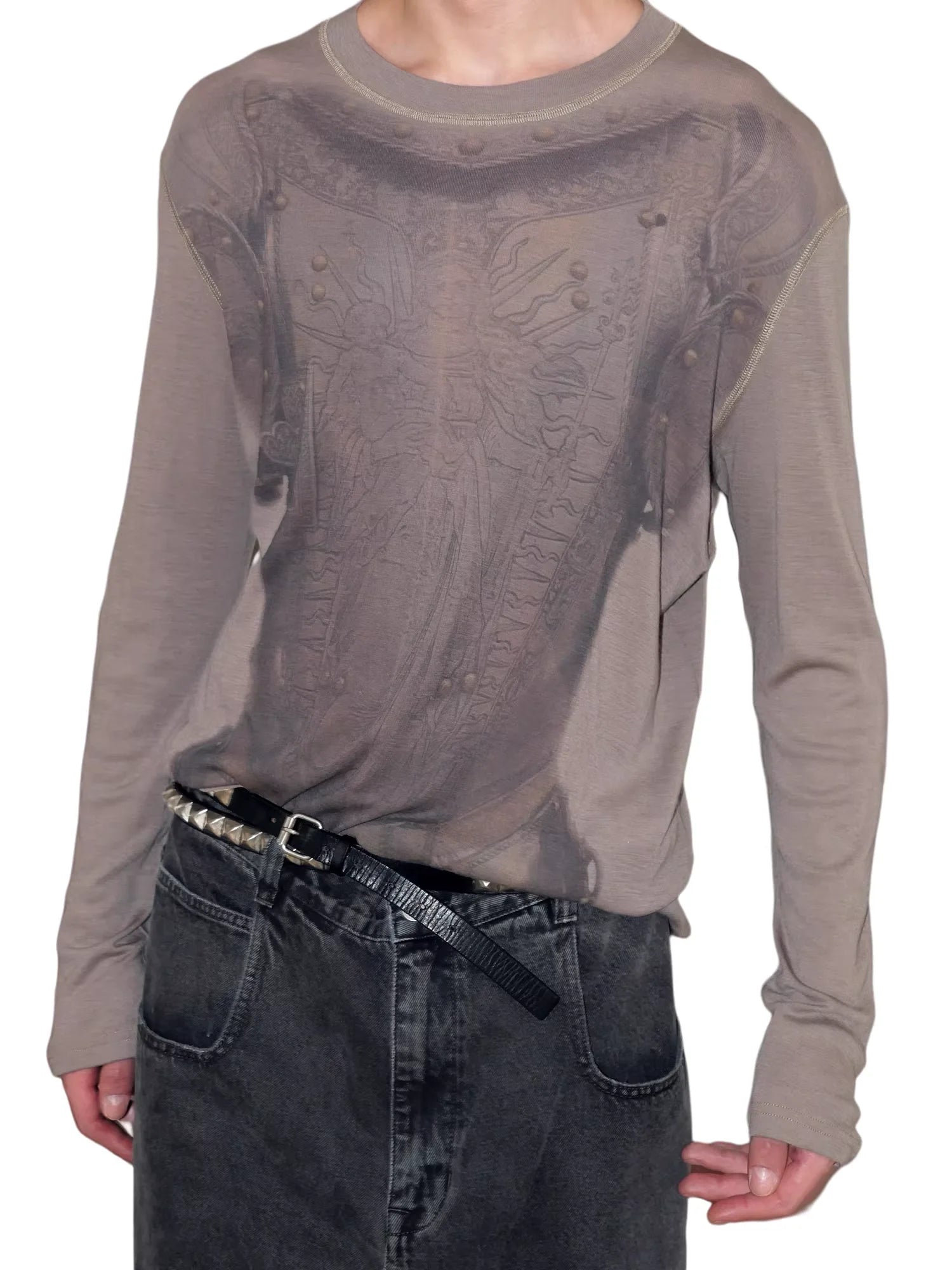 This men's long sleeve t-shirt features a detailed graphic print of armor, blending medieval and sci-fi elements for a bold, distinctive look. Designed in a muted taupe tone, the shirt offers both visual impact and comfort. Made from soft, skin-friendly Merino wool, it provides a lightweight feel with natural breathability. The casual fit is complemented by a classic crew neck and a clean hemline, making it suitable for everyday wear with a touch of edge.