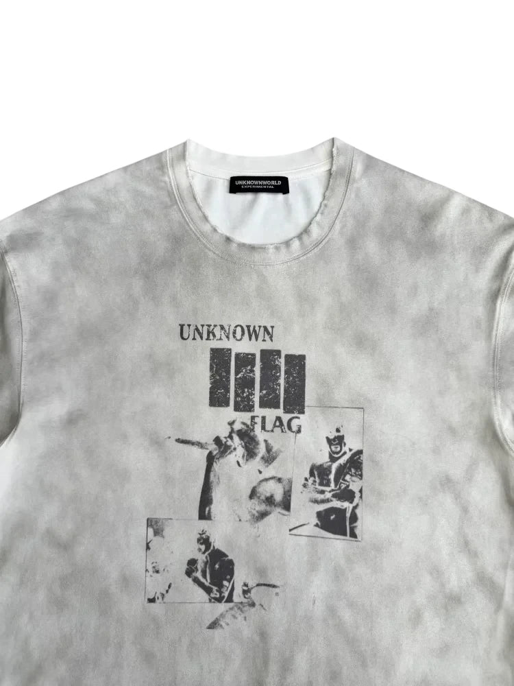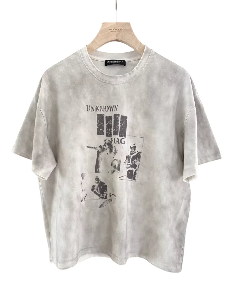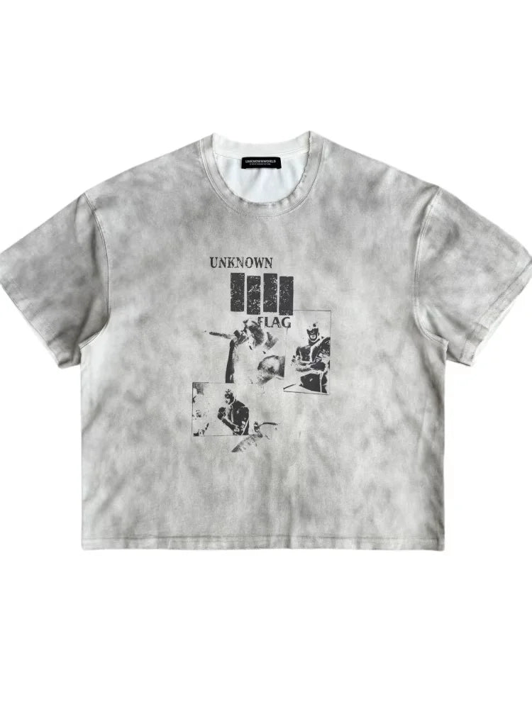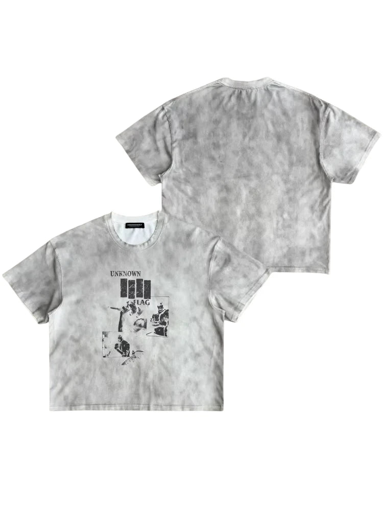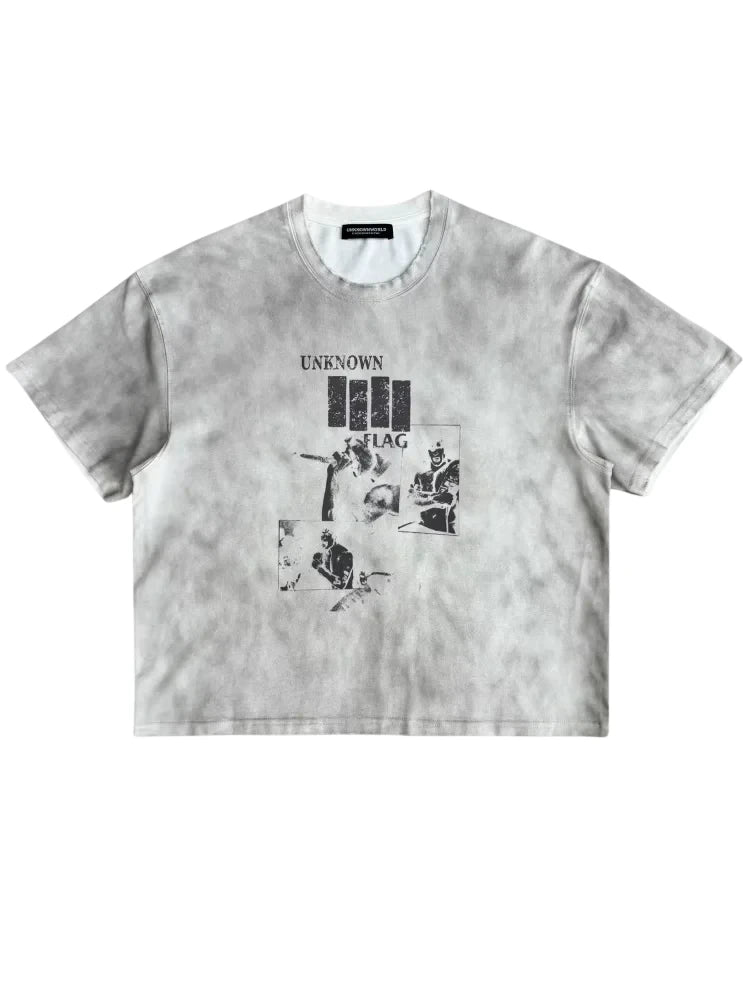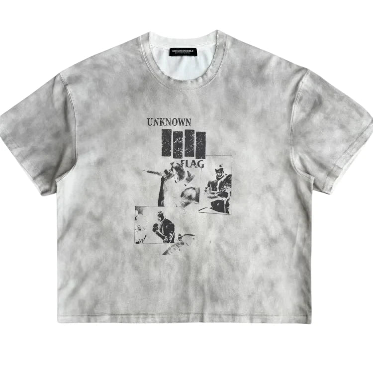This men's short-sleeve crewneck T-shirt features a unique gray and white tie-dye base with a distressed, vintage finish. The front showcases a bold, punk-inspired graphic design in black ink, including the words 'UNKNOWN FLAG' and three stylized, grainy portraits for a rebellious aesthetic. Crafted from soft cotton or a cotton-blend fabric, it offers a comfortable feel with a standard fit cut, making it a standout piece in any streetwear or alternative wardrobe.