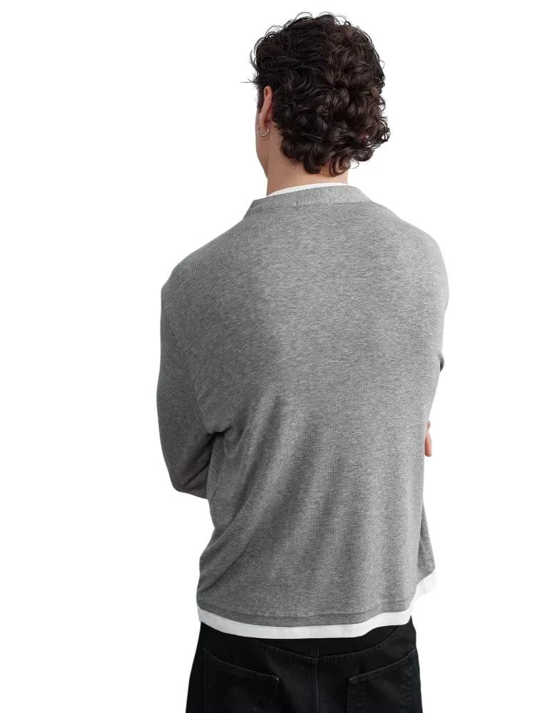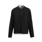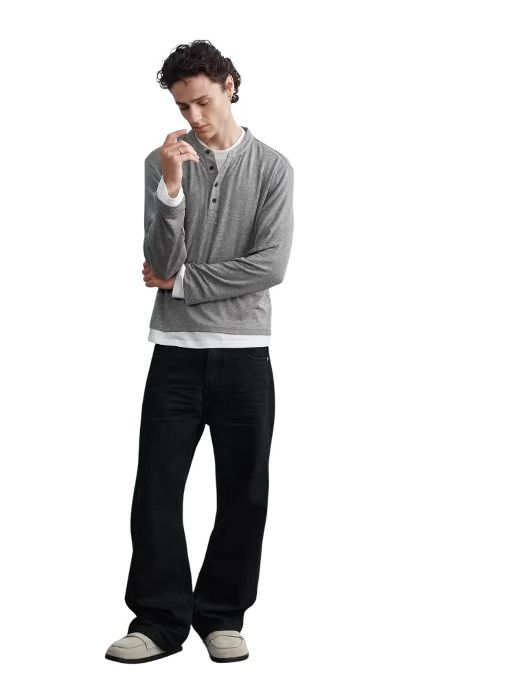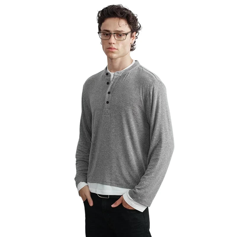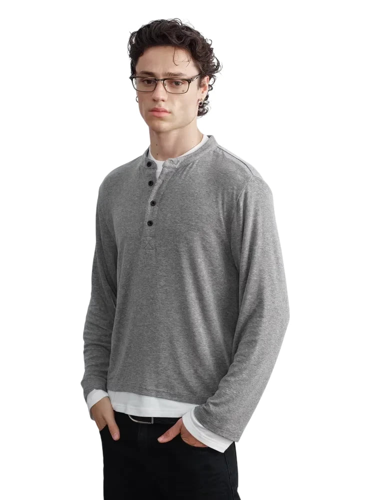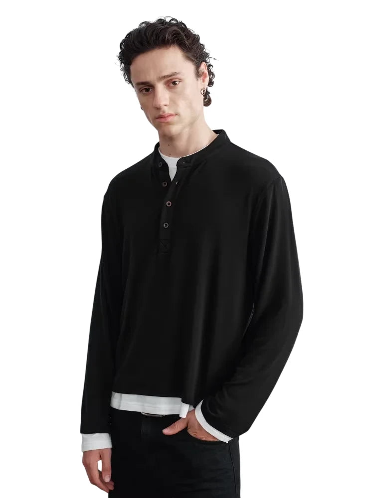 Upgrade your casual style with this elegant men's long-sleeve Henley shirt, crafted from a blend of Tencel and wool for a smooth, lightweight feel. Designed with a buttoned placket, subtle V-stitch detail, and a naturally draped silhouette, this shirt offers both comfort and sophistication. A contrast-color true two-piece design reveals a white undershirt layer at the cuffs and hem, creating a modern, effortlessly layered look.