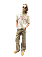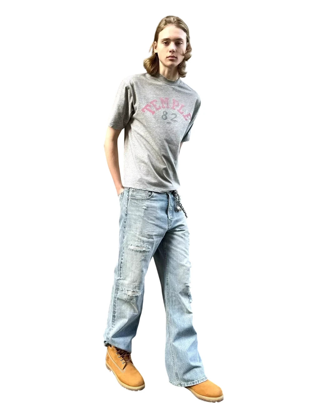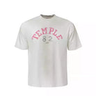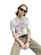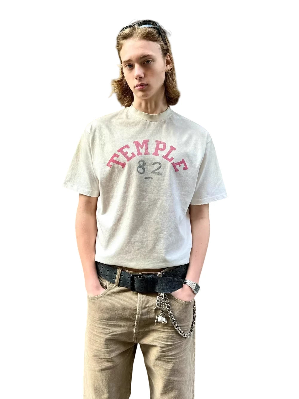 Elevate your casual look with this vintage-inspired slim fit t-shirt. Designed for men, it features short sleeves and a classic crew neckline. The cream-colored fabric is complemented by a weathered red 'TEMPLE' print across the chest, with a faded '82' below in grey, giving it an authentically distressed aesthetic. Perfect for pairing with jeans or corduroy pants, this tee adds effortless style to your everyday wardrobe.