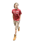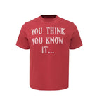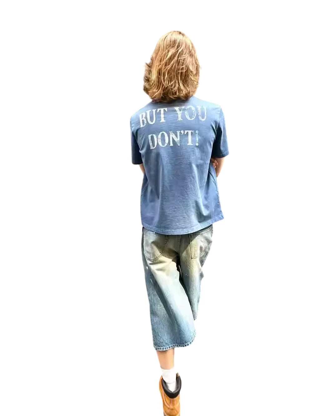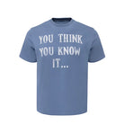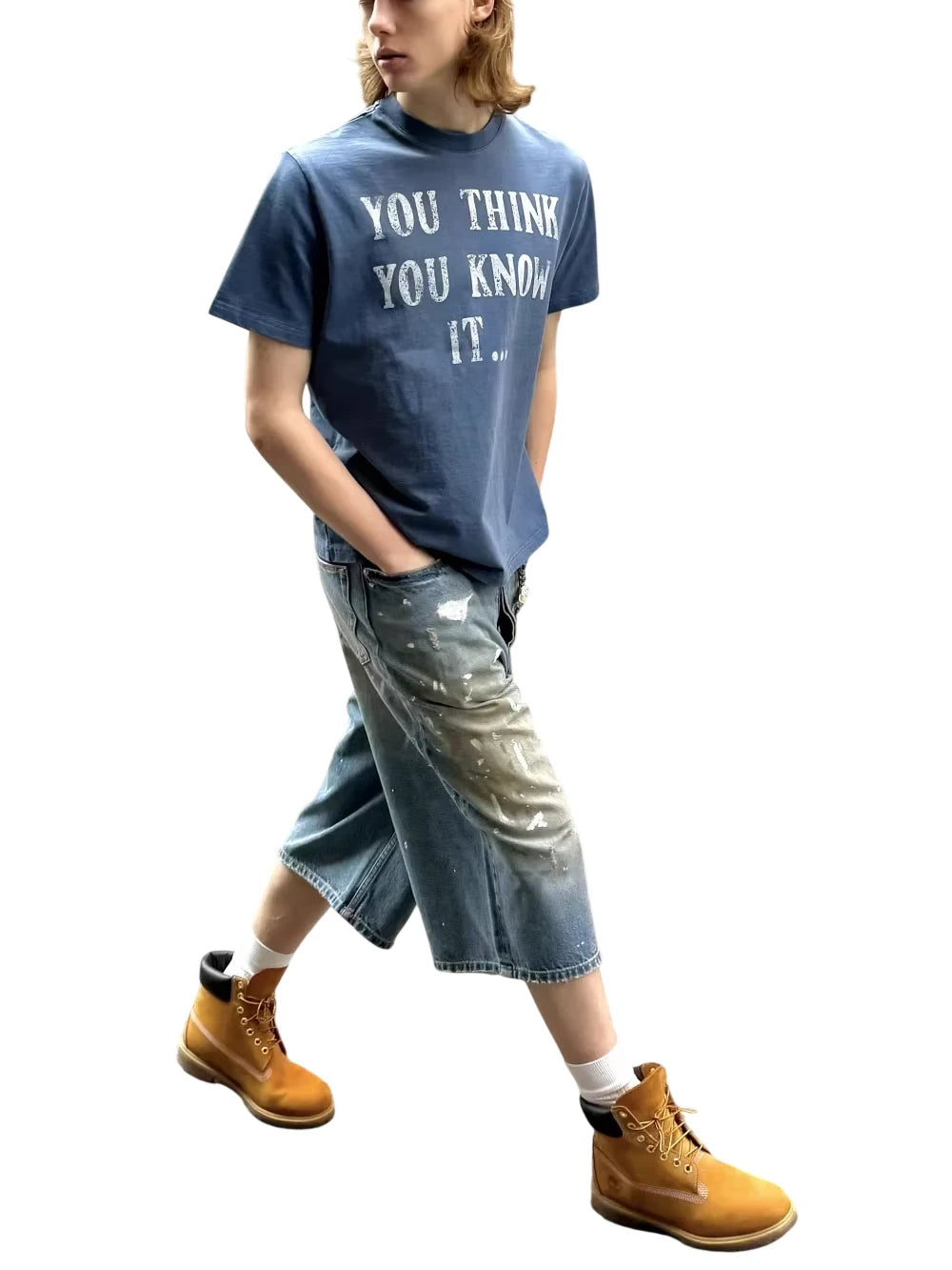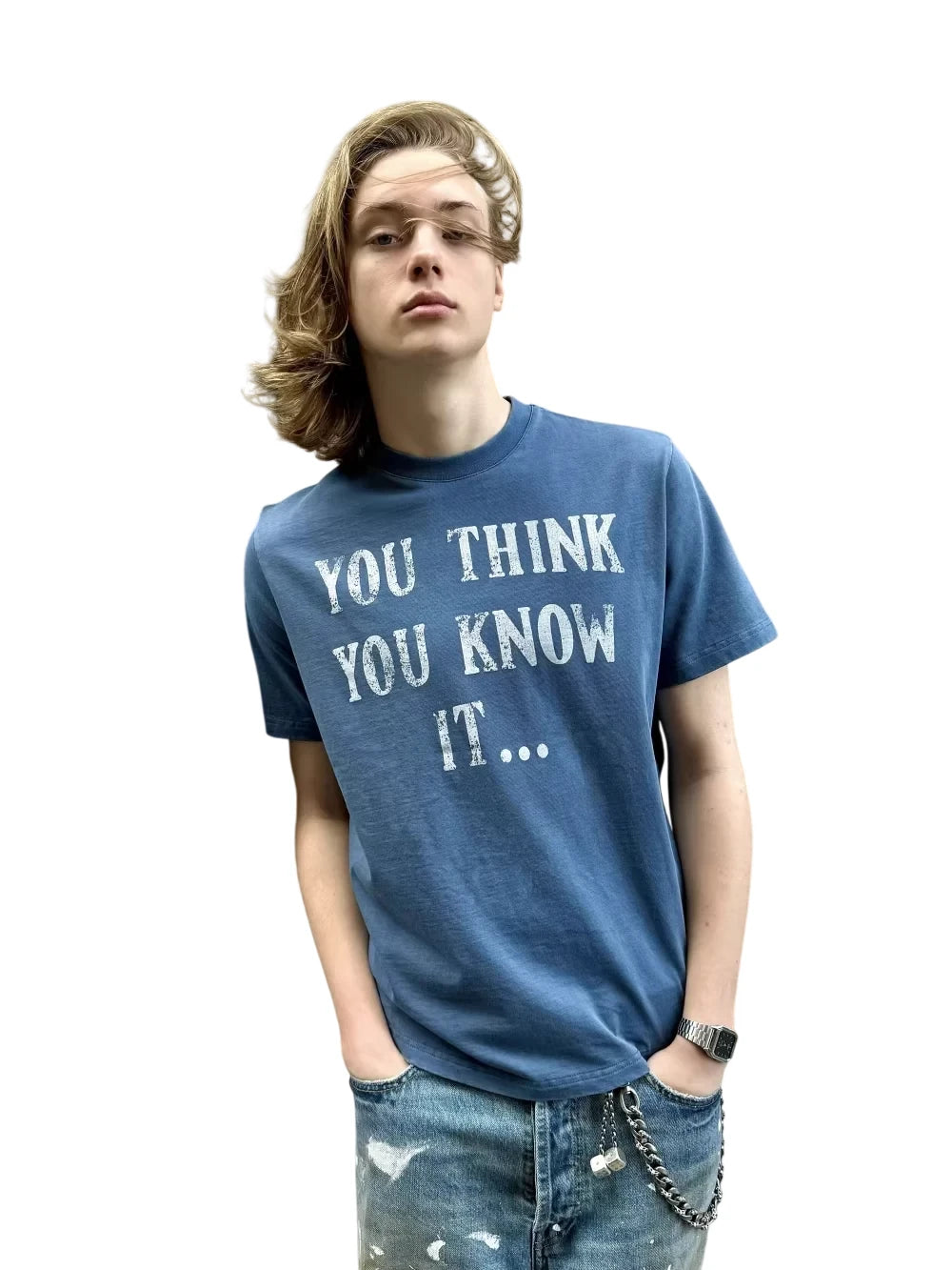 Elevate your streetwear style with this vintage-inspired washed blue T-shirt. Designed with a relaxed, boxy fit and distressed graphic print that reads 'YOU THINK YOU KNOW IT ...' in a retro white font, this short-sleeved tee delivers a casual and effortlessly cool look. Perfect for laid-back outfits, the design is modeled by a young male and styled with distressed denim in an urban setting, capturing a bold and edgy aesthetic.
