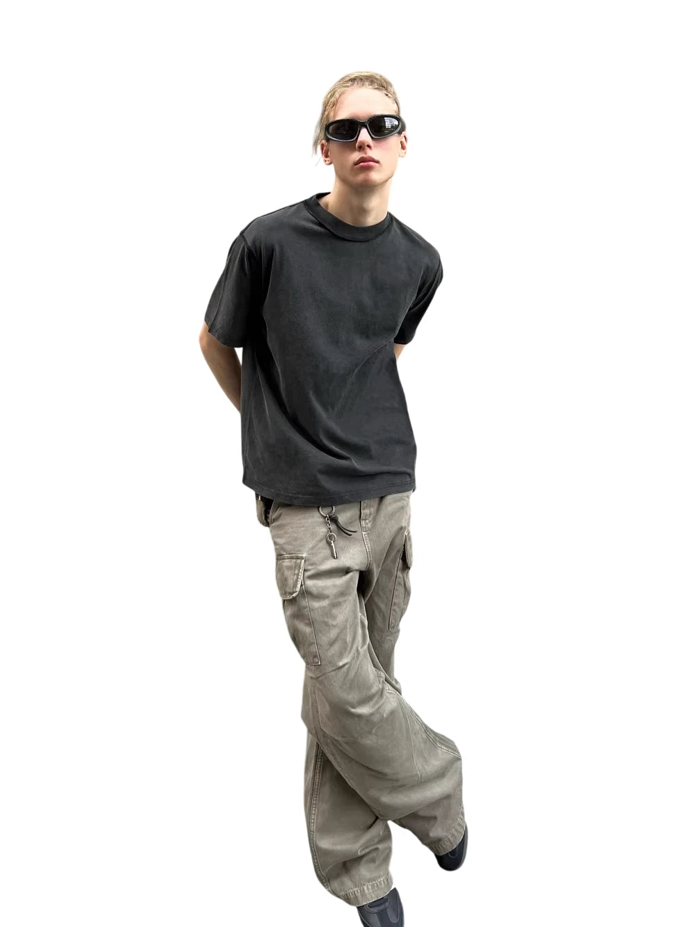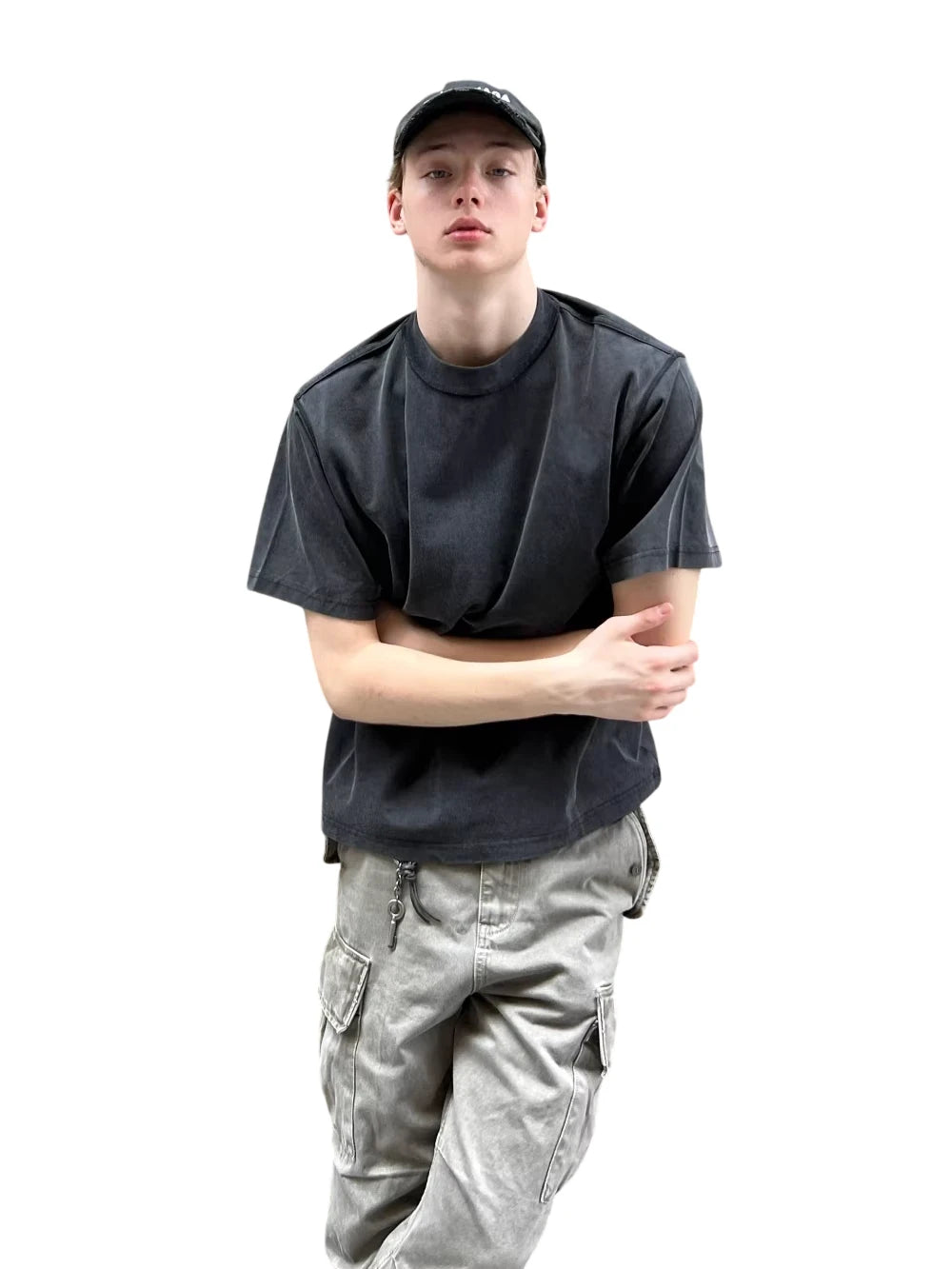 Elevate your streetwear style with this washed black vintage t-shirt. Designed in a loose silhouette, this basic tee exudes an effortless urban vibe. The inside-out detailing adds a subtle hint of edge, making it a standout piece for casual daywear. Perfect for men seeking comfort and understated cool.