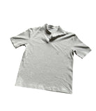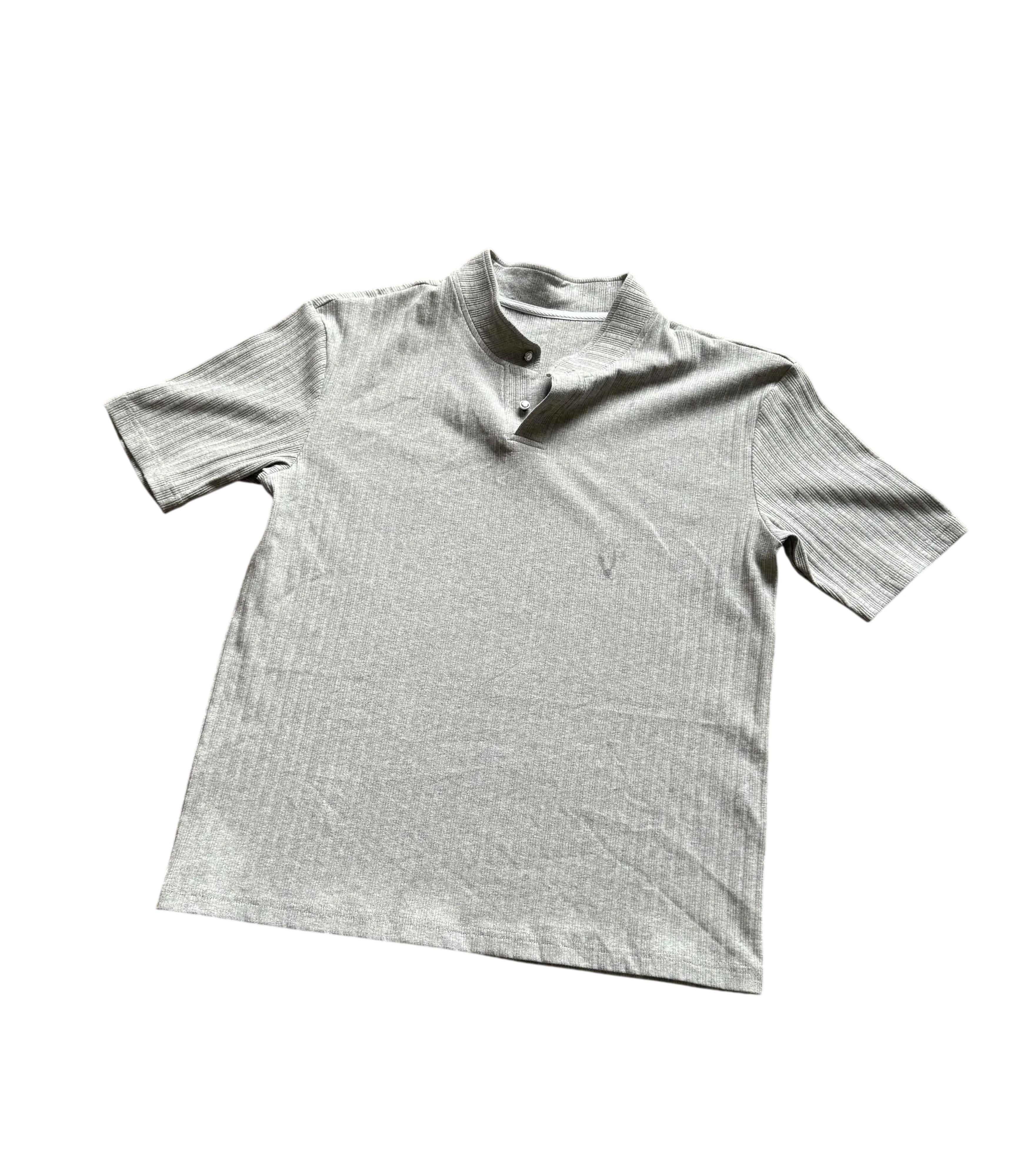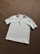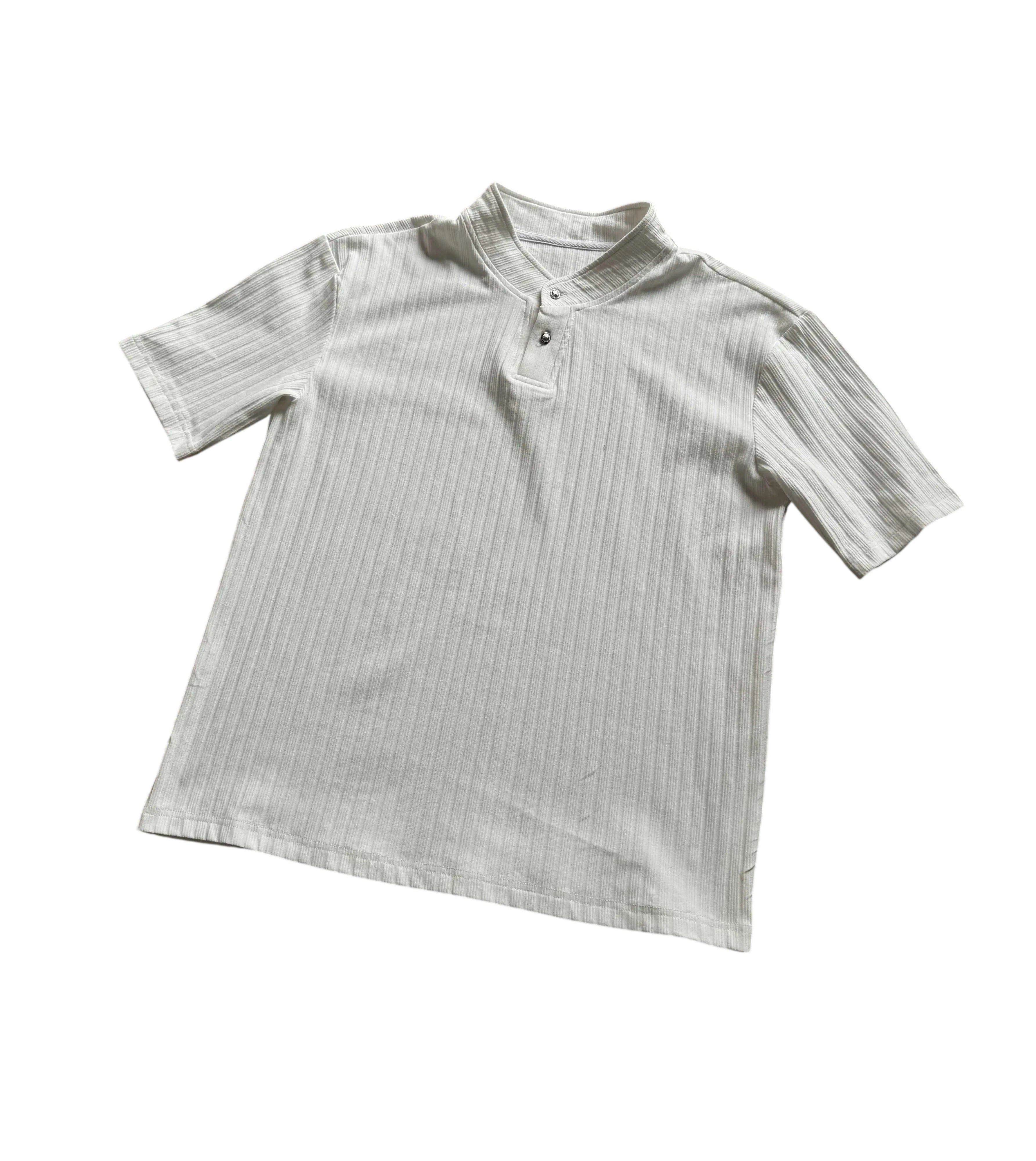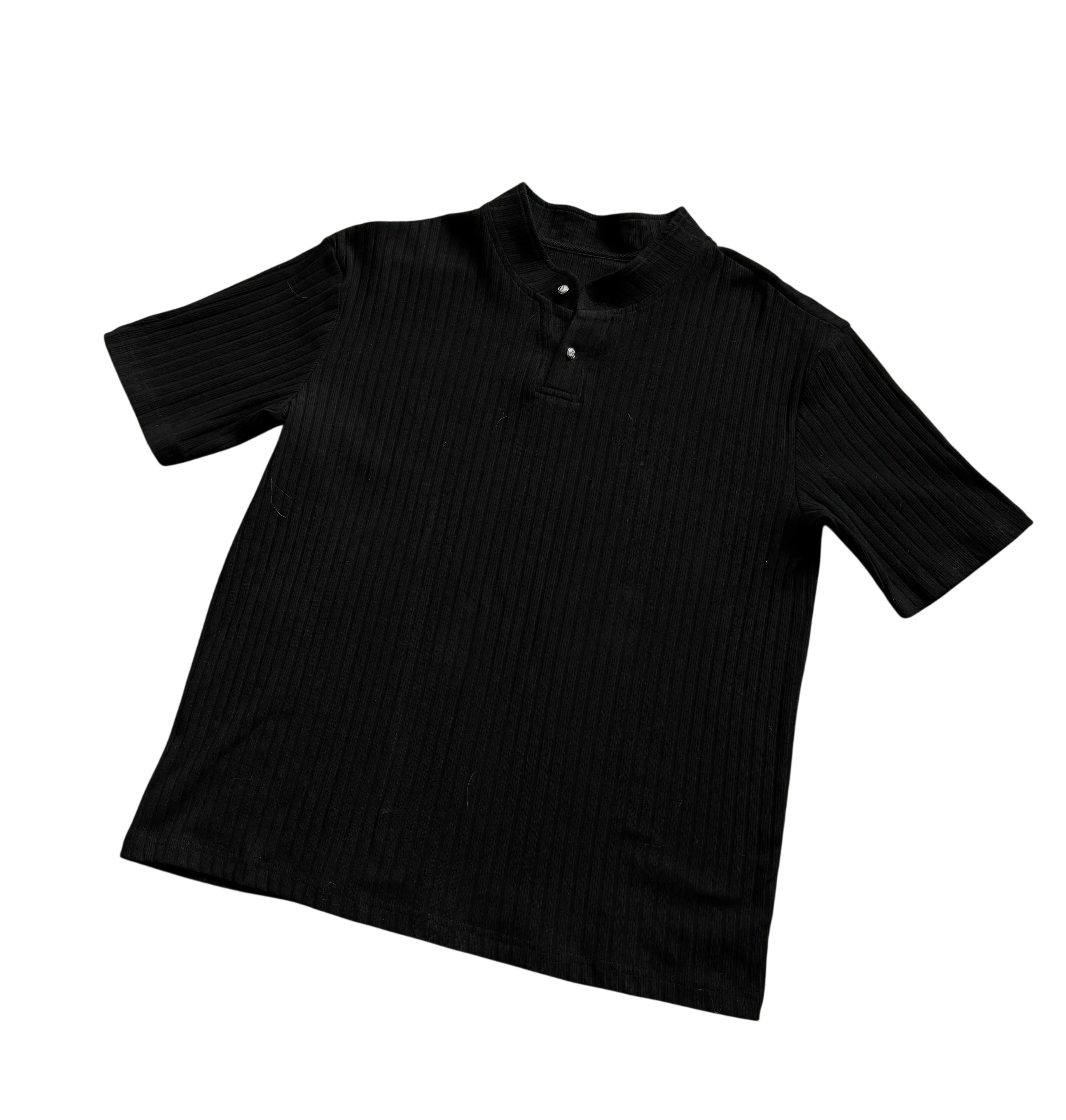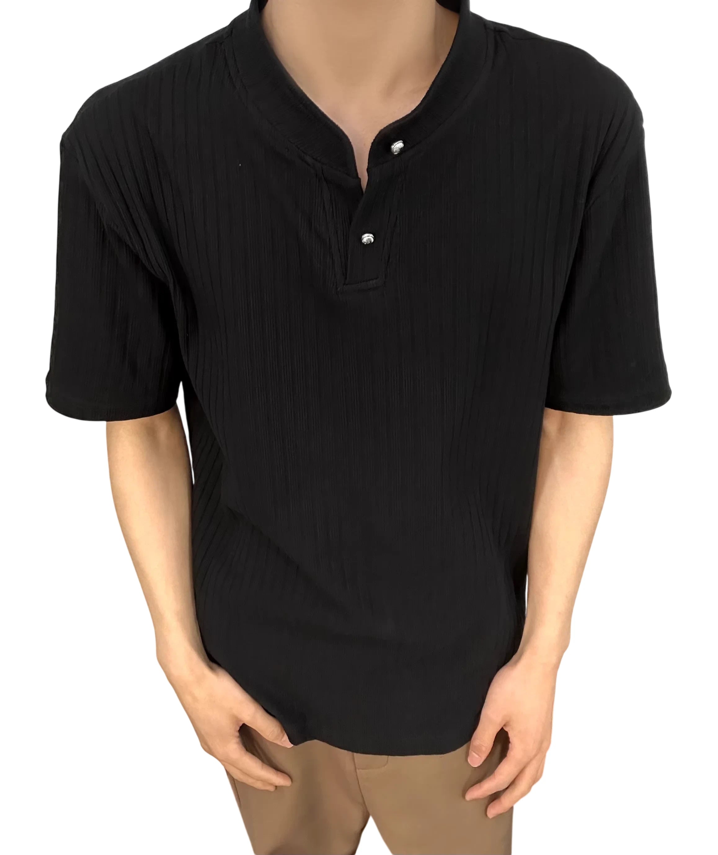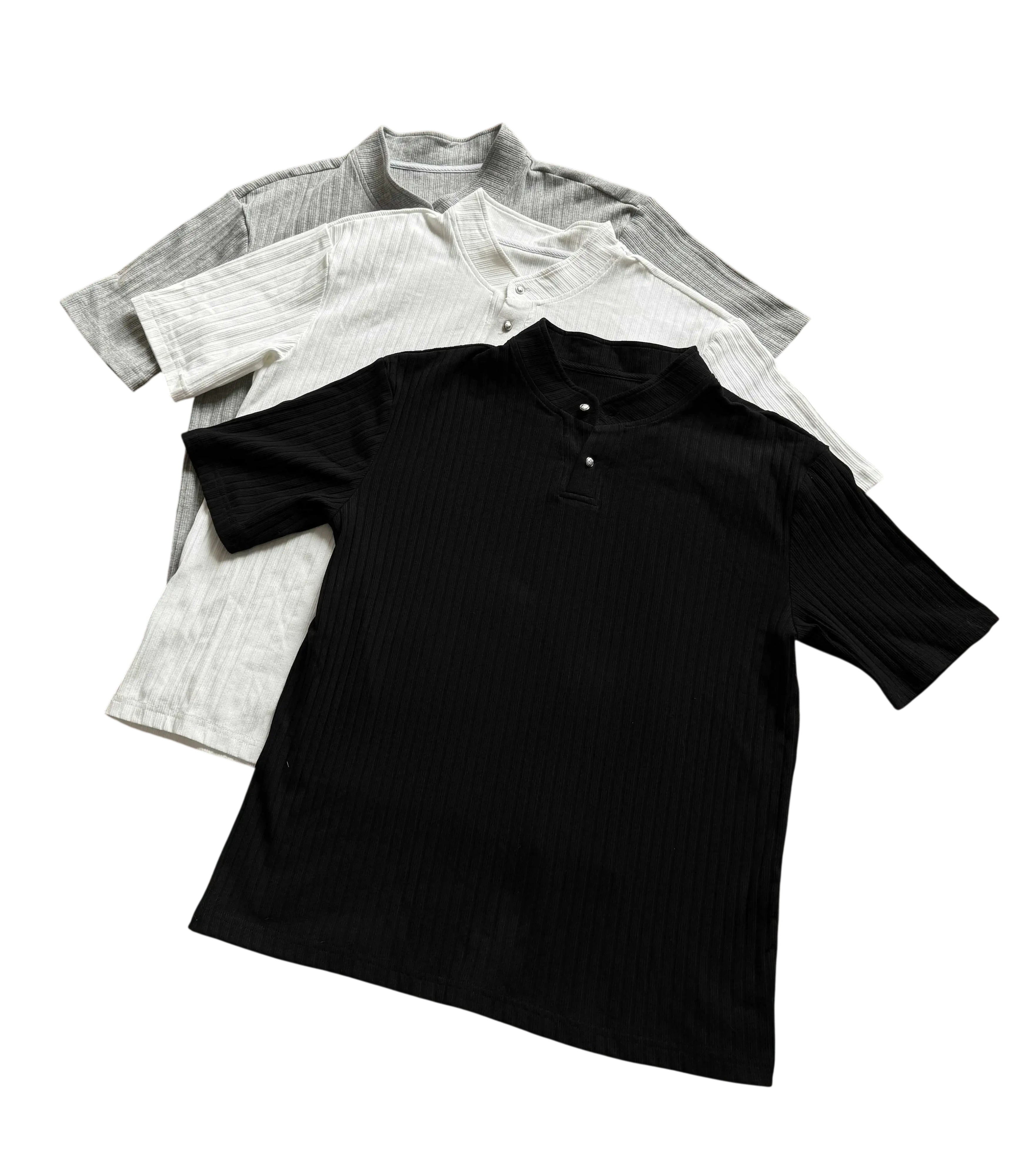 This set includes three men's short sleeve t-shirts in classic colors: black, white, and light gray. Each shirt is crafted from breathable, ribbed knit fabric for structure and comfort. Featuring a collarless crew neck with a partial button-down placket, these basic tees offer a clean, minimal aesthetic suitable for both casual and semi-formal wear. The boxy fit ensures ease of movement and modern styling.