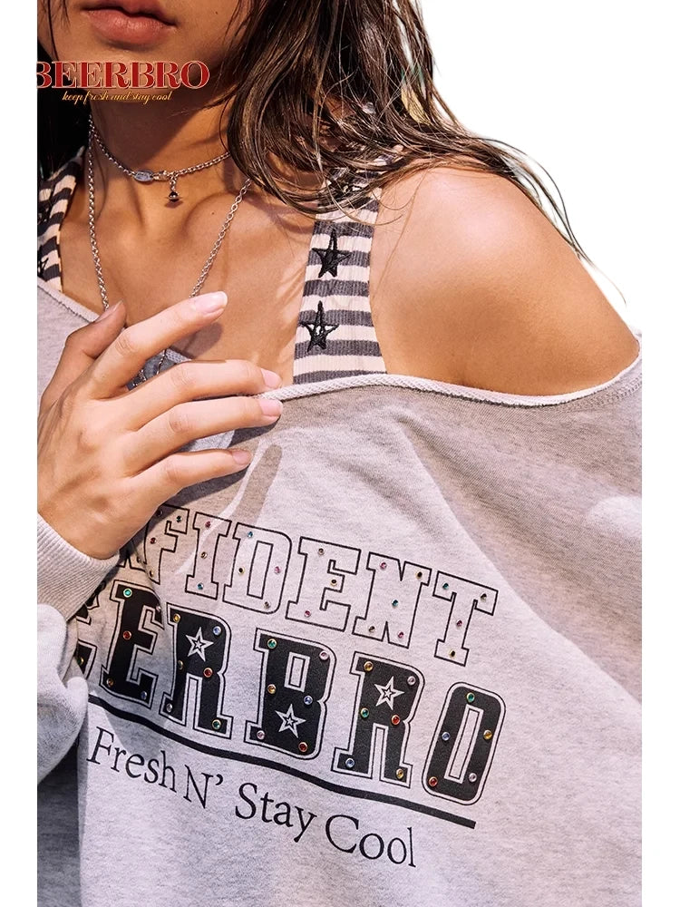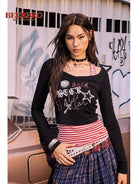 Make a bold statement with this American-style halter tank top, featuring eye-catching red and white horizontal stripes and graffiti-inspired printed lettering across the chest. Designed with a padded bust and fitted silhouette, this sleeveless top offers both comfort and style. Perfect for casual outings, it pairs effortlessly with jeans and accessories for an urban-chic look. Ideal for women seeking a trendy and relaxed streetwear vibe.