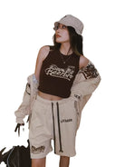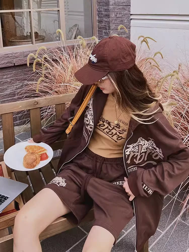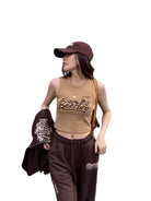 Step into casual comfort with this retro-inspired two-piece set designed for women. The outfit features a high-stretch, ribbed crop tank top with a vintage mountain graphic print, paired with coordinating loose-fit jogger pants. A matching loose sweatshirt completes the look, effortlessly draped off the shoulders for a relaxed vibe. Perfect for lounging or running errands, this versatile set combines ease and style in a modern-meets-classic silhouette.