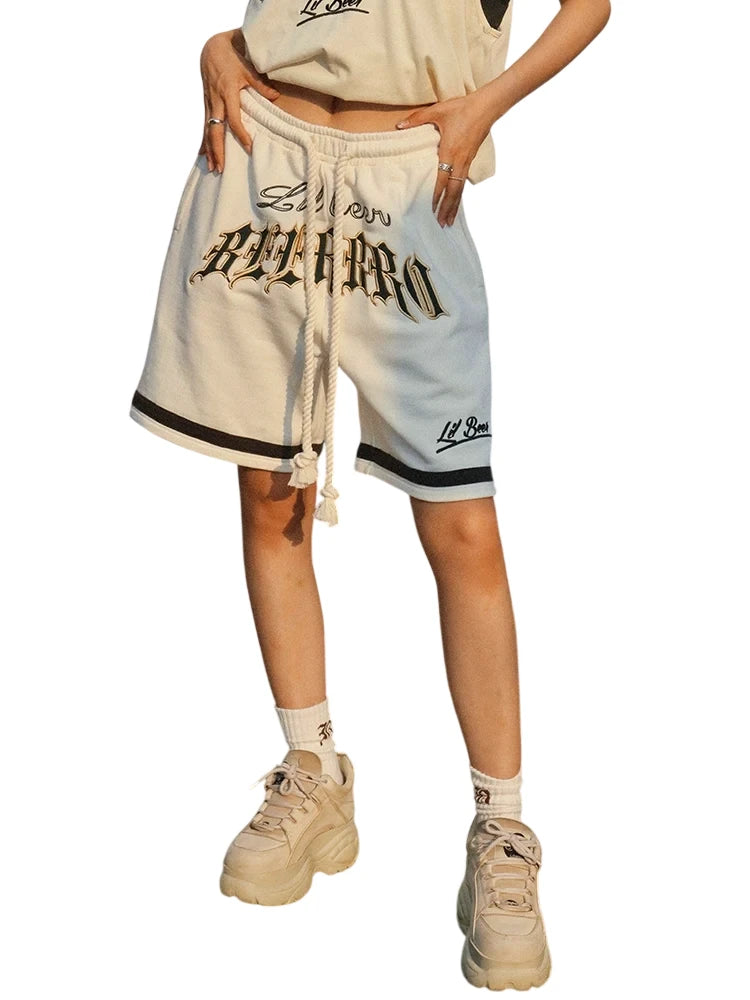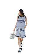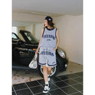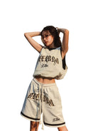 Elevate your summer style with this bold two-piece athletic set designed for women. Featuring a sleeveless tank top and colorblock shorts, both adorned with striking gothic-style white lettering, this outfit delivers an edgy yet sporty look. The relaxed fit and breathable fabric make it ideal for outdoor activities or casual wear. White drawstrings and trim complete the look, adding a touch of contrast to the black fabric. Perfect for making a statement while staying comfortable in warm weather.
