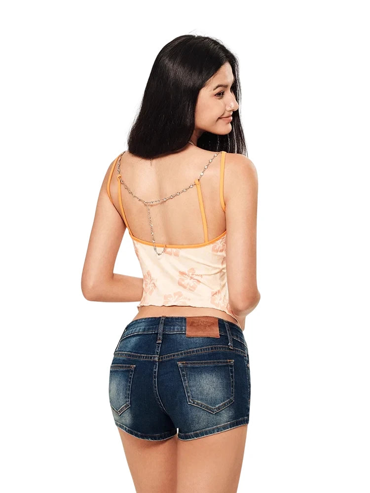 Elevate your summer wardrobe with this stylish women's tank top, designed for warm-weather flair and comfort. Featuring a peachy-beige floral print, this sleeveless top includes delicate spaghetti twist straps and a ruched front with a center tie, flattering the waistline. A unique handkerchief hem adds a touch of flow, while a decorative chain detail across the back completes the backless design with modern glam. Perfect for pairing with your favorite denim shorts for a fashionable casual look.