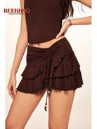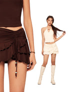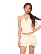 Stay cool and stylish this summer with this chic beaded halter tank top and skirt set for women. Featuring a soft modal fabric, the top ties elegantly around the neck and is accented with colorful beads at the neckline. The matching skirt includes a fashionable ruched design with tiered layers and side drawstrings for an adjustable fit. Perfect for warm-weather outings, this set combines retro inspiration with modern flair.