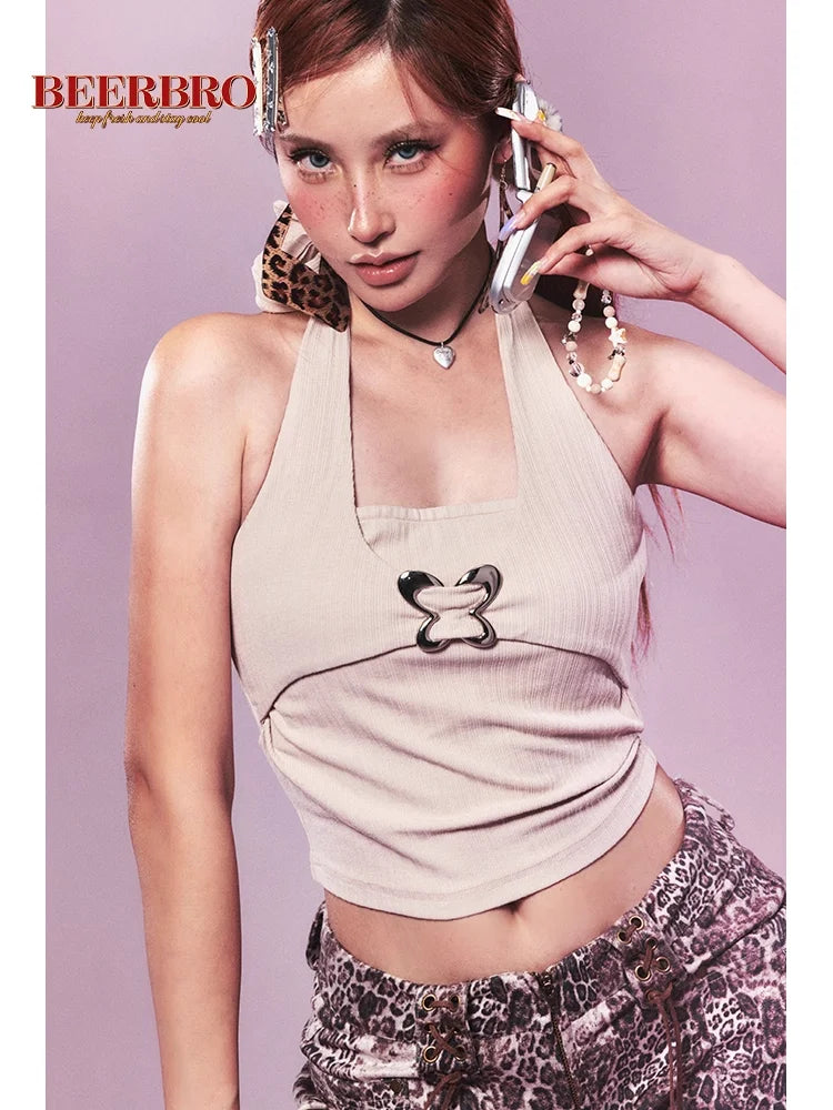 Elevate your streetwear style with this women's faux two-piece halter crop top. Designed with a ribbed texture and a flattering slim-fit silhouette, this top features a distinctive butterfly-shaped cutout at the bust for a bold fashion statement. The soft beige tone adds versatility, while the stretch fabric ensures comfort and ease of movement. Ideal for edgy and trend-forward outfits, it's perfect for casual outings and curated looks.