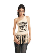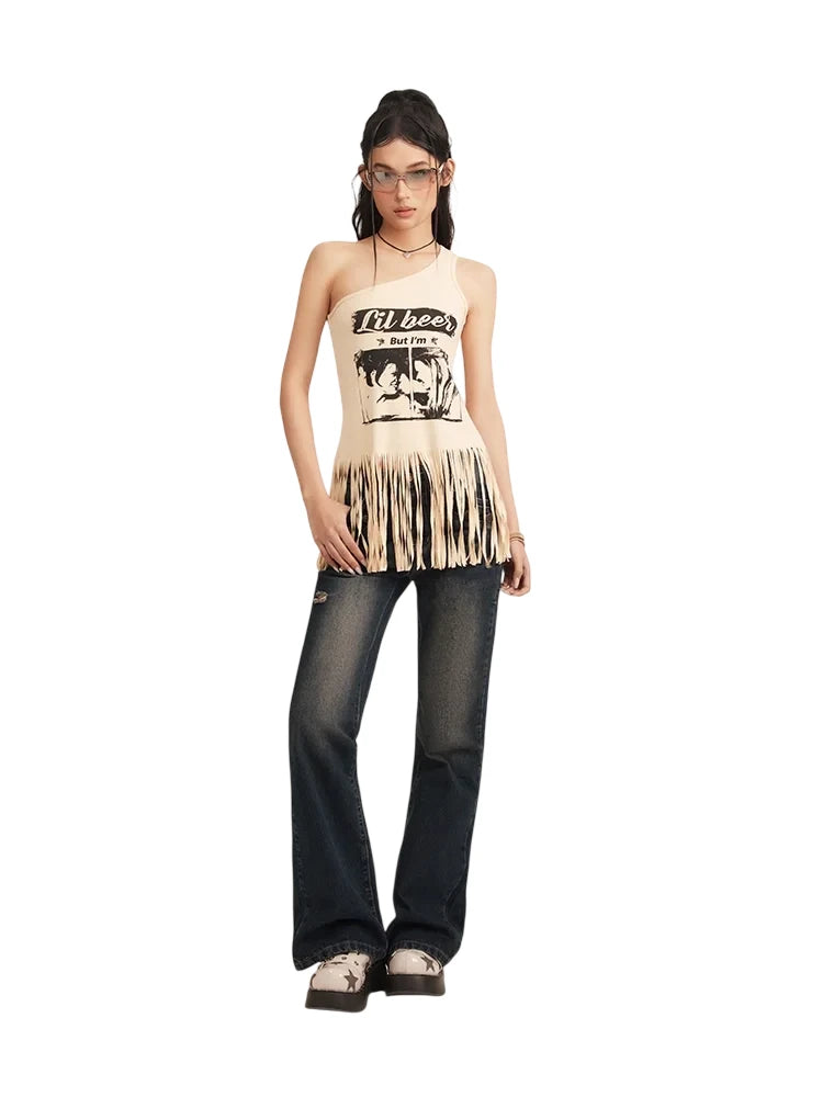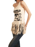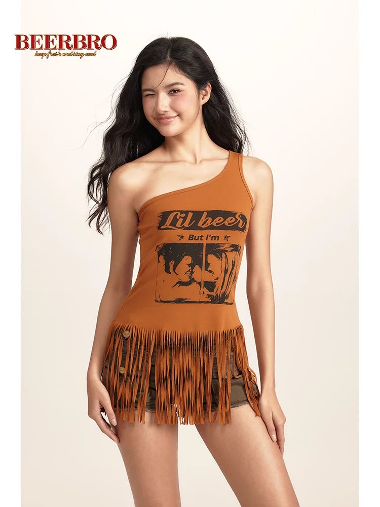 BeerBro Women's One-Shoulder Tassel Tank Top with Graphic Print