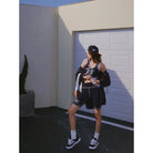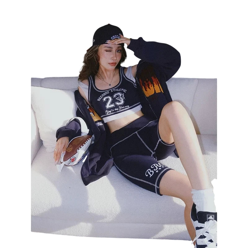 Elevate your casual wardrobe with this retro-inspired two-piece set for women. Featuring a black cropped tank top with contrasting white trim and bold athletic-style lettering, paired with matching high-waisted cycling shorts, this outfit combines comfort with trendy streetwear appeal. Ideal for sporty, everyday looks or relaxed urban styling, this set is perfect for the fashion-forward woman on the go.