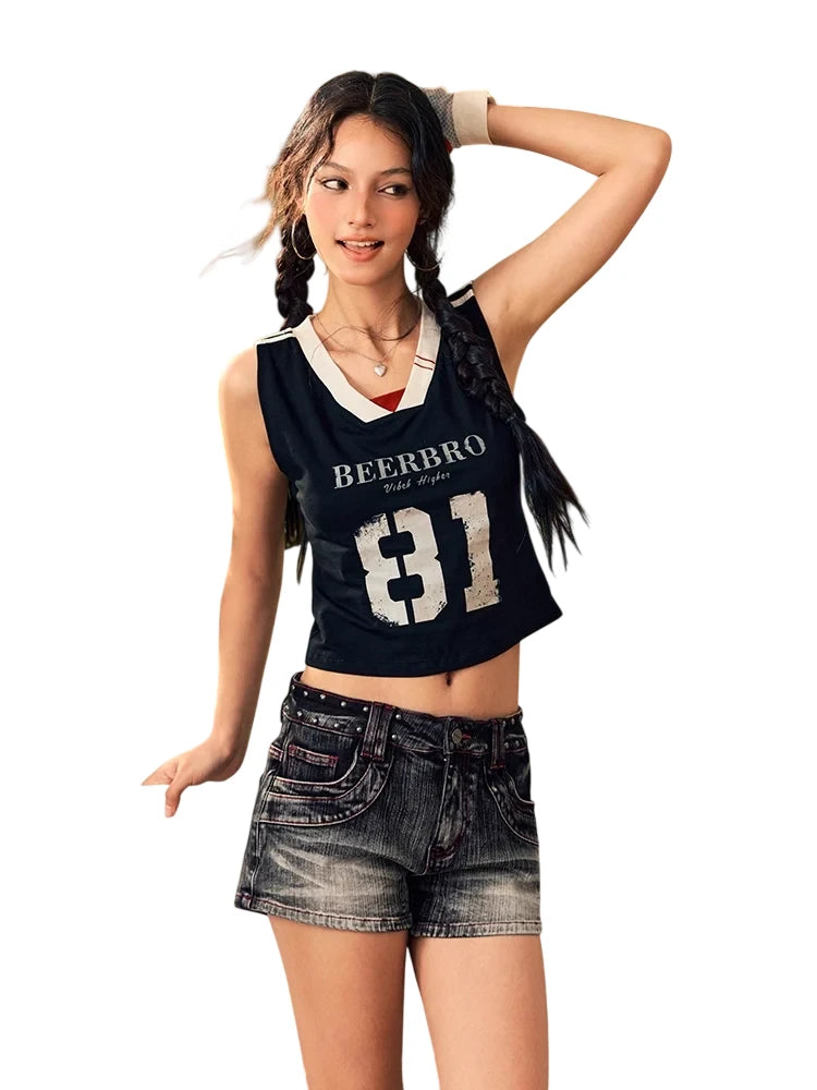 Stay sporty and stylish this summer with this women's V-neck sleeveless crop tank top. Featuring bold block lettering and a deep neckline with contrast trim, this top adds an energetic touch to any casual outfit. Crafted for comfort and movement, it's perfect for warm-weather days and laid-back activities.