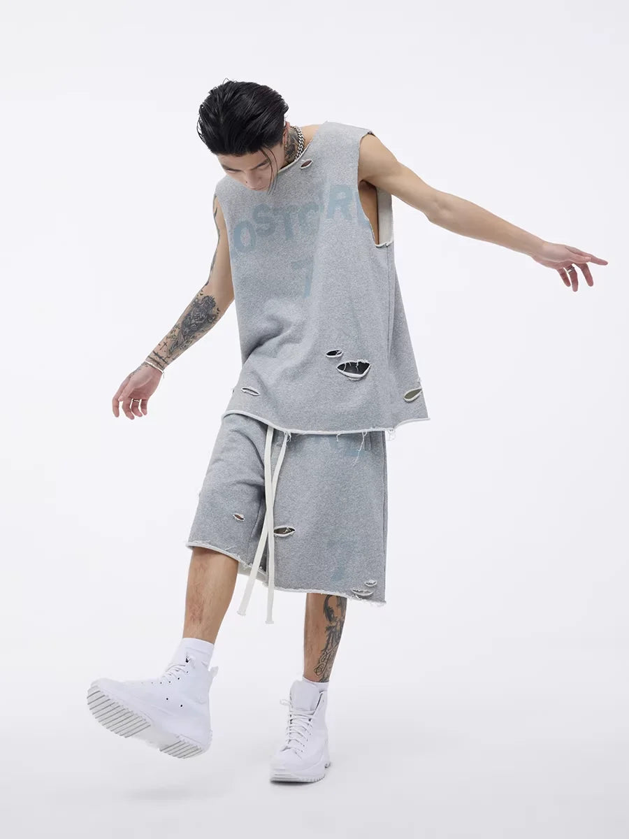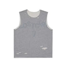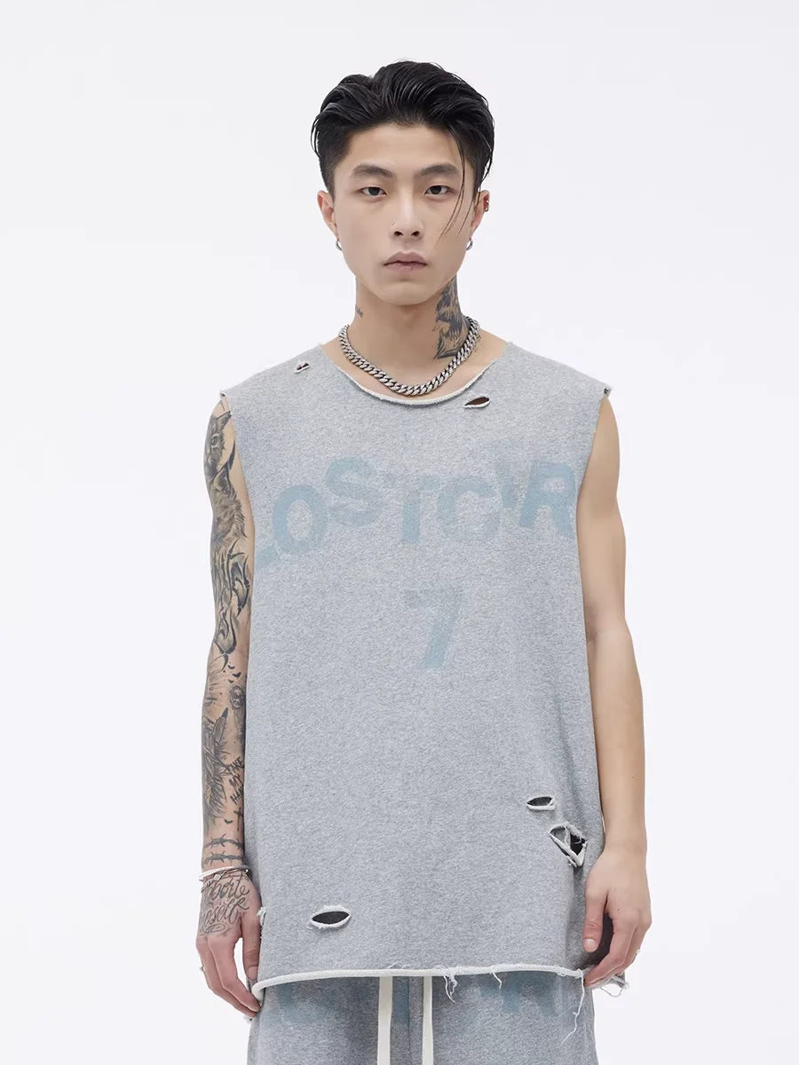 Elevate your summer streetwear with this men's sleeveless tank top, designed with a raw edge finish and intentional distressed details. The light grey fabric is soft and breathable, perfect for casual warm-weather styling. Featuring a subtle blue-toned text 'LOSTGR' and the number '7' across the chest, this tank offers a modern worn-in look. Ideal for pairing with jeans or shorts, it’s a standout addition to any urban wardrobe.