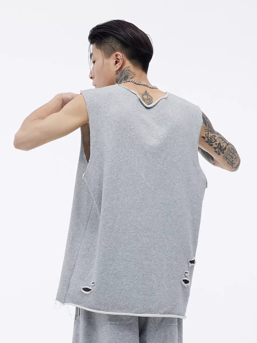 LOSTCTRL Men's Distressed Raw Edge Sleeveless Tank Top