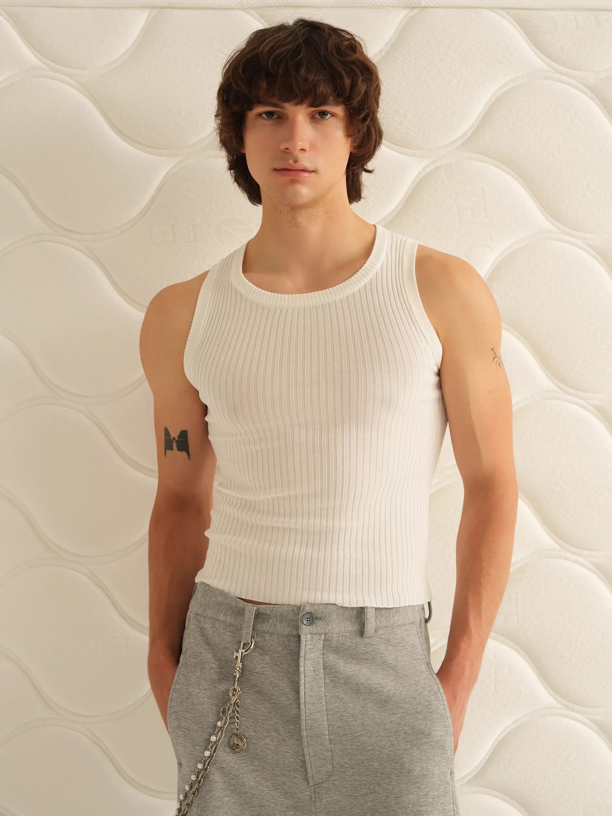 This fitted men's tank top features a ribbed knit texture and a classic scoop neckline, offering a sleek and comfortable silhouette. Designed in a solid white color, it provides a clean and versatile look that pairs effortlessly with casual or athleisure outfits. Ideal for layering or wearing solo, the sleeveless design makes it a staple for warm-weather styling.